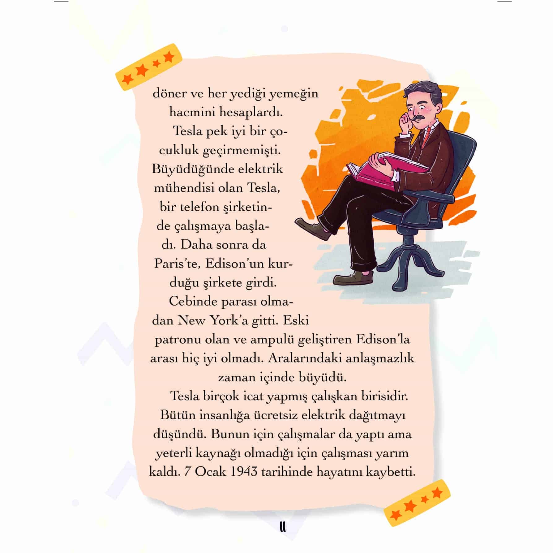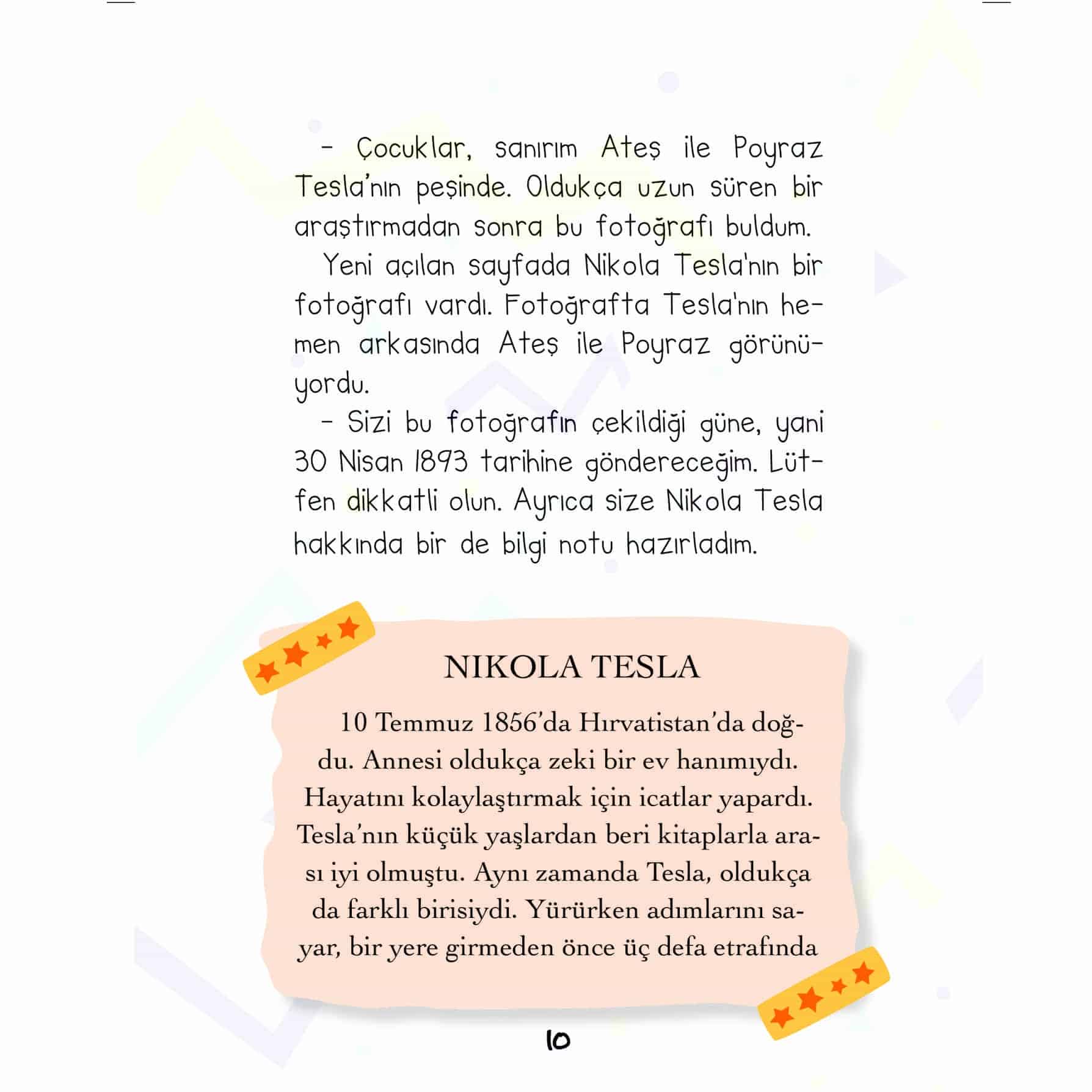 Bilim İnsanlarının İzinde serisinin "Nikola Tesla" isimli bu dördüncü kitabıyla maceraya atılmaya hazır mısın? Duru, Mete ve Tanju seni zamanda yolculuk yapmaya davet ediyor! Asım Öğretmen'in zaman makinesiyle geçmişe giden çocuklar, kötü niyetli zaman yolcuları Ateş ve Poyraz'ı engellemek zorunda. Bu sefer Nikola Tesla’nın yanına giden üç arkadaş, pek çok buluşa imza atmış bu bilim insanını ve onun hayallerini tanıyacak ve birlikte Ateş ile Poyraz’ın planlarını bozmaya çalışacaklar.