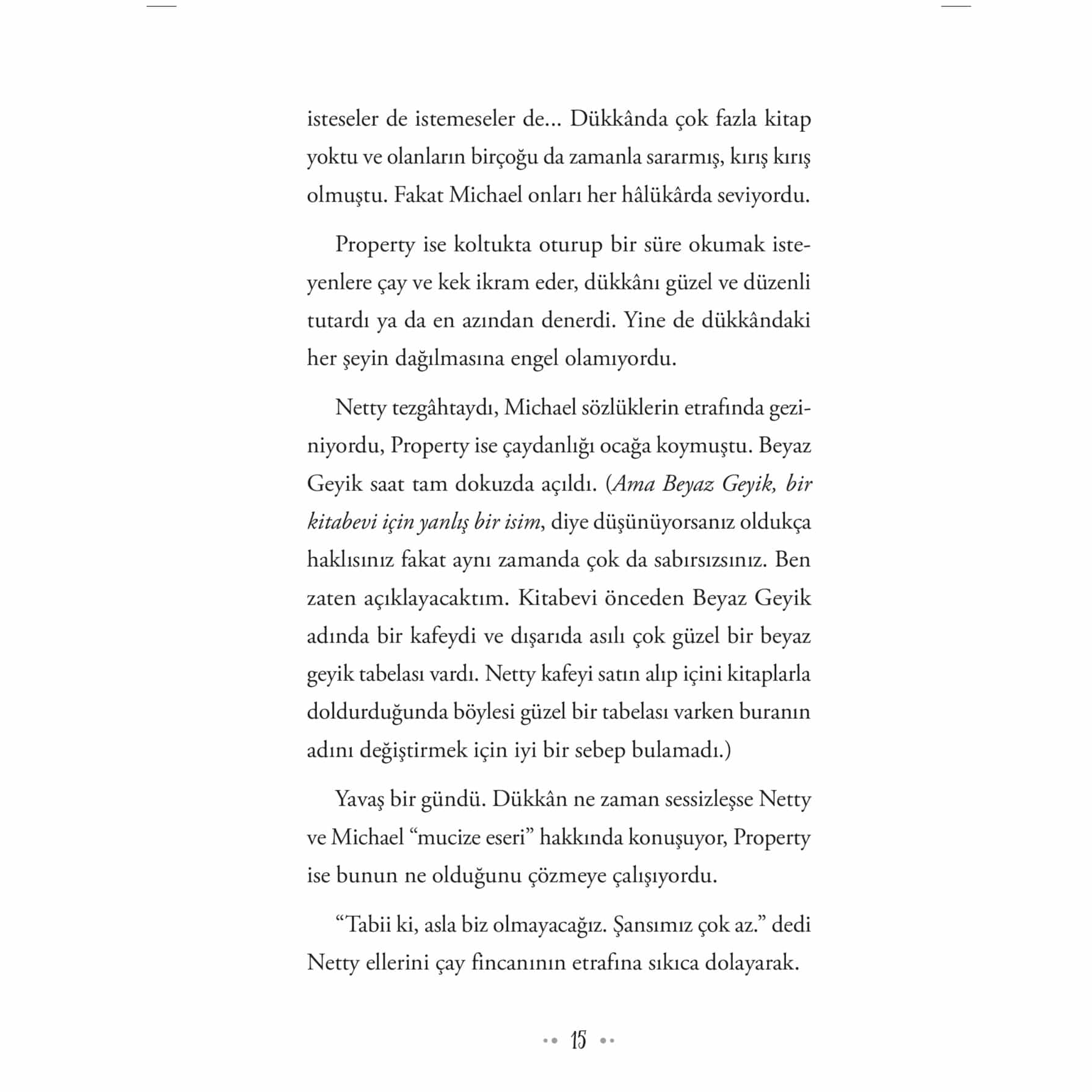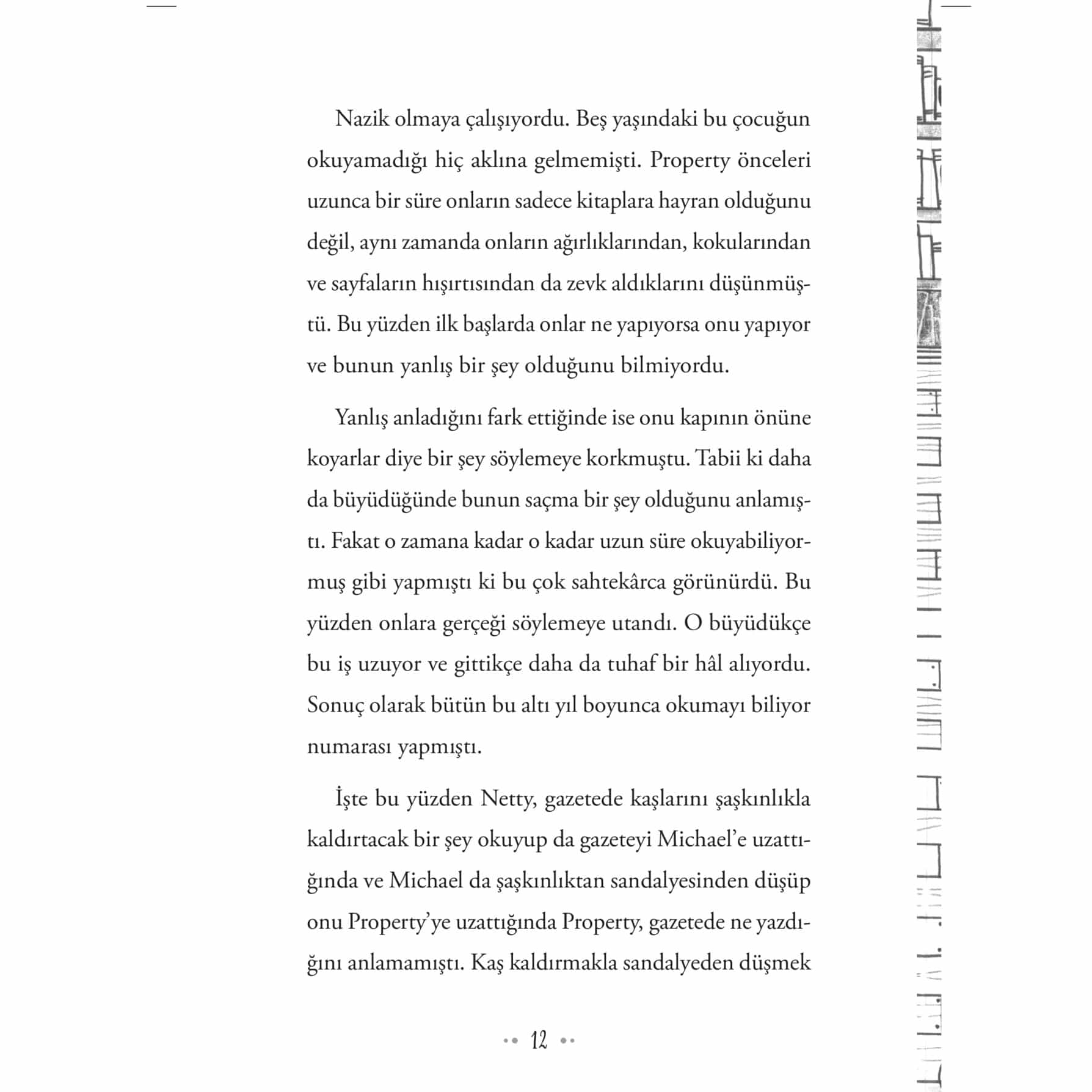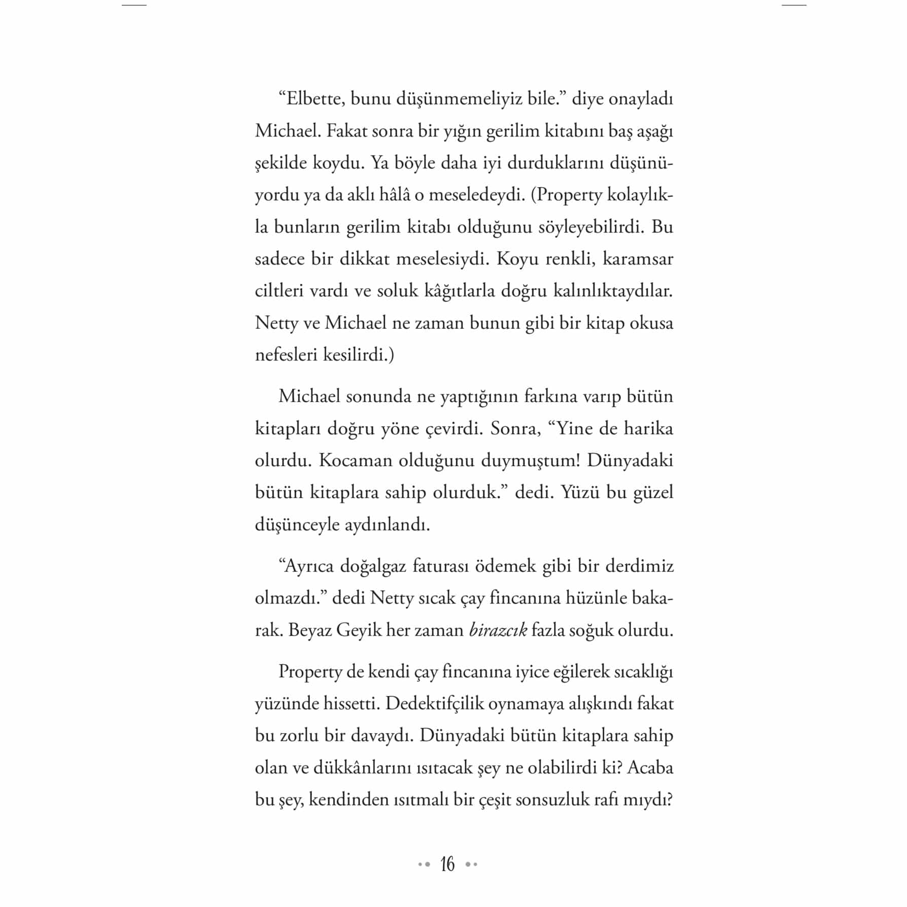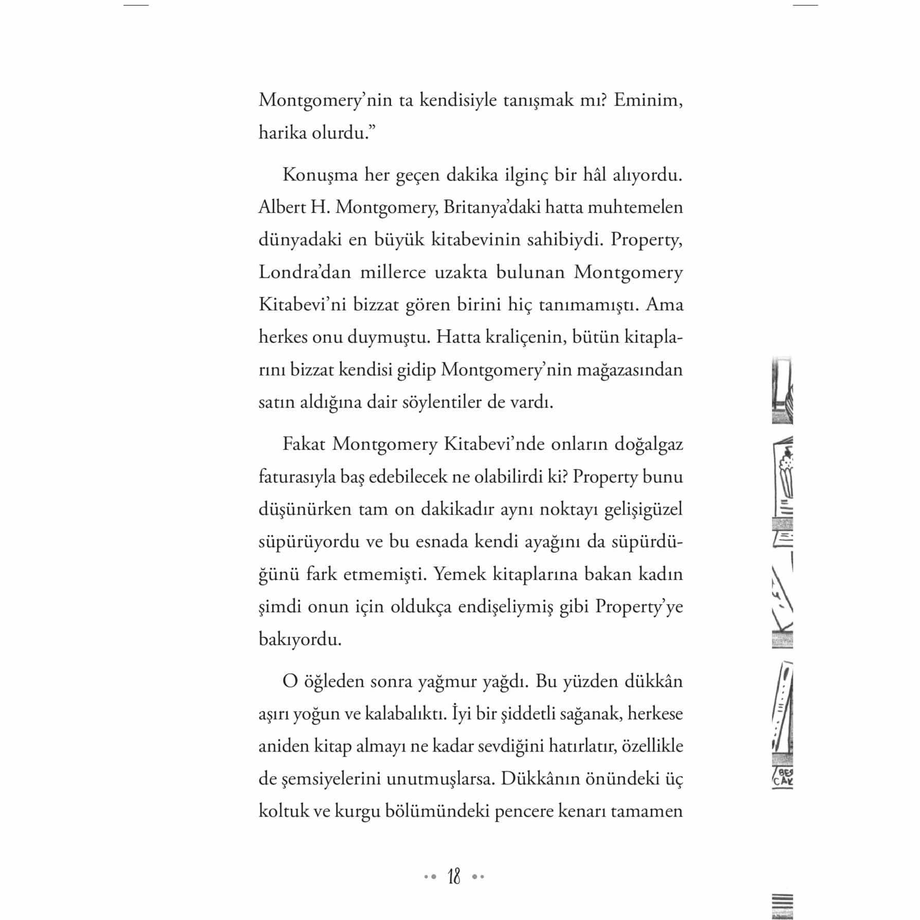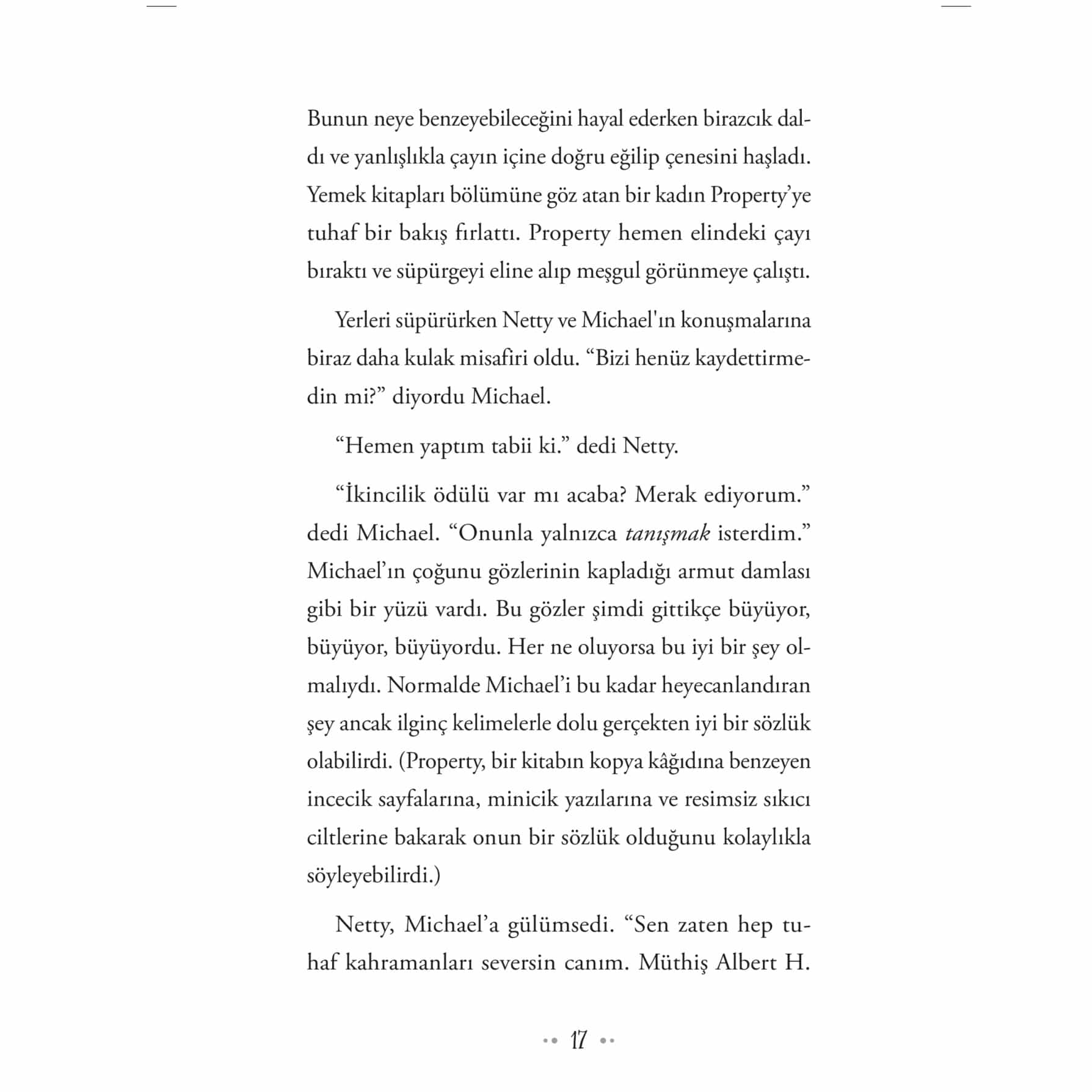 Kitapların büyülü dünyasında eğlence dolu bir aile macerası… Daha küçükken bir kitabevinde terk edilen ve kayıp eşya dolabında bulunan Property'nin sıra dışı bir özelliği var: O, bir kitabevinde yaşıyor. Kitaplarla dolu bu yer ve kitabevinin sevgi dolu sahipleri artık onun evi ve ailesi. Fakat herkesten sakladığı bir sırrı var, okumayı bilmiyor! Bir gün ailesi sürpriz bir çekilişte dünyadaki en büyük kitabevini kazandığında Property’in hayatı altüst olur. Sahip oldukları yeni kitabevi başlarına hiç beklemedikleri bir dert açar. Kitabevinin gizemini çözmeye çalışan Property, kendi sırrını koruyabilecek mi?"Bu kitap, çocuğunuzun ömür boyu kitap sevgisi kazanması için altın bilet olabilir." -MinervaReads"Bu hikâye, kitapseverler, kitabevi aşıkları ve tabii ki her yerdeki kedi severler için birebir." -Sue&Pakka's