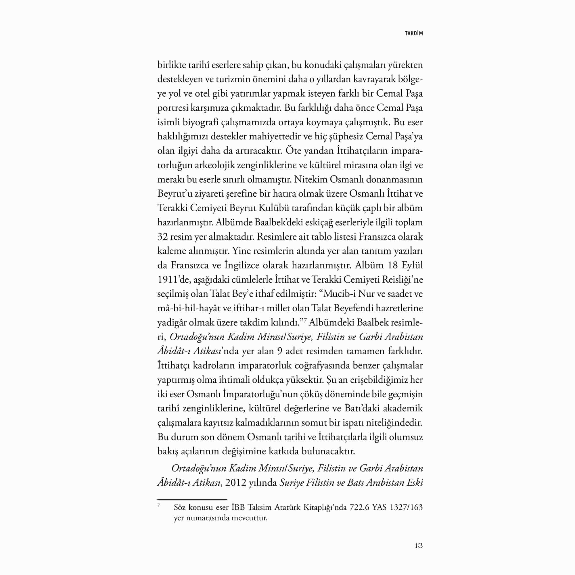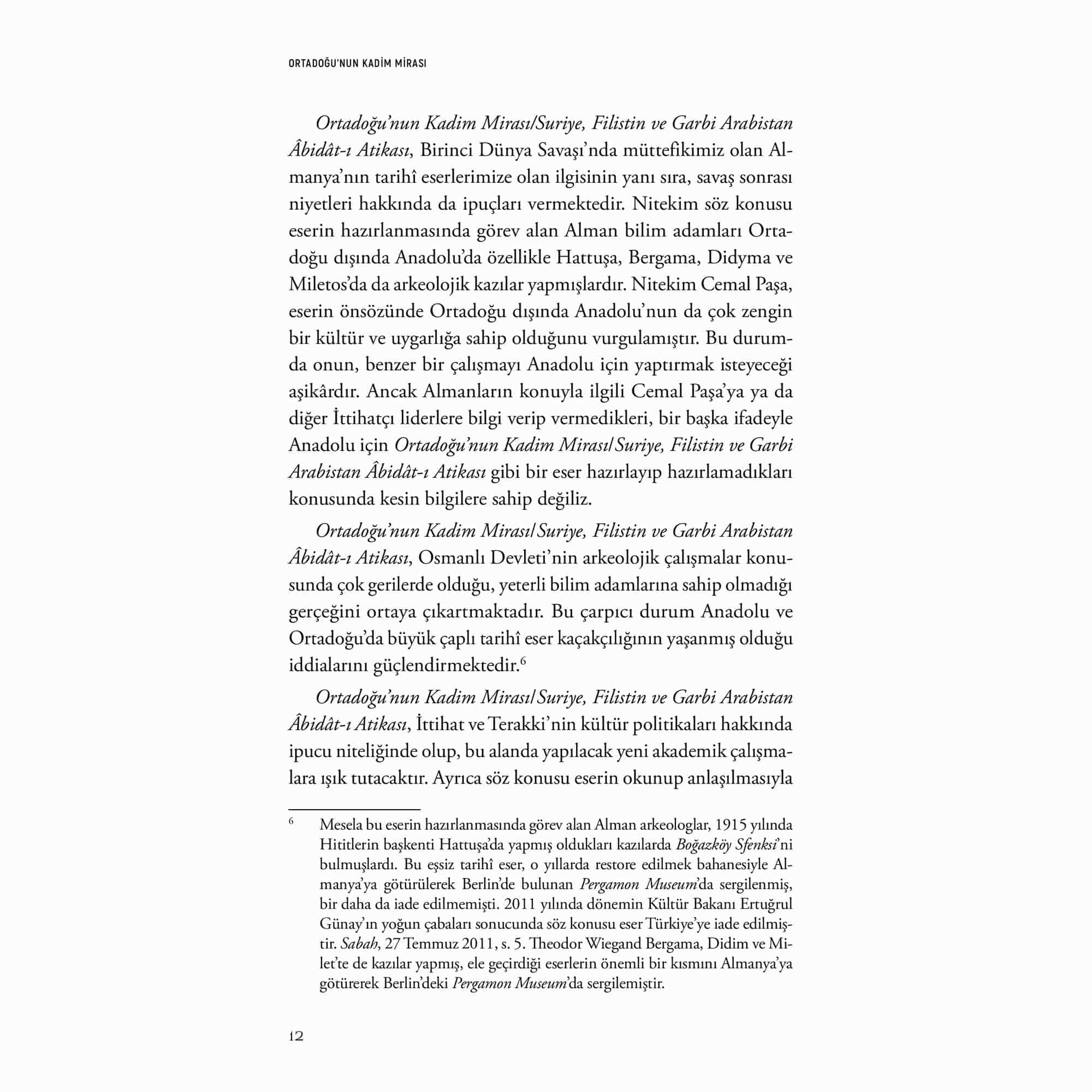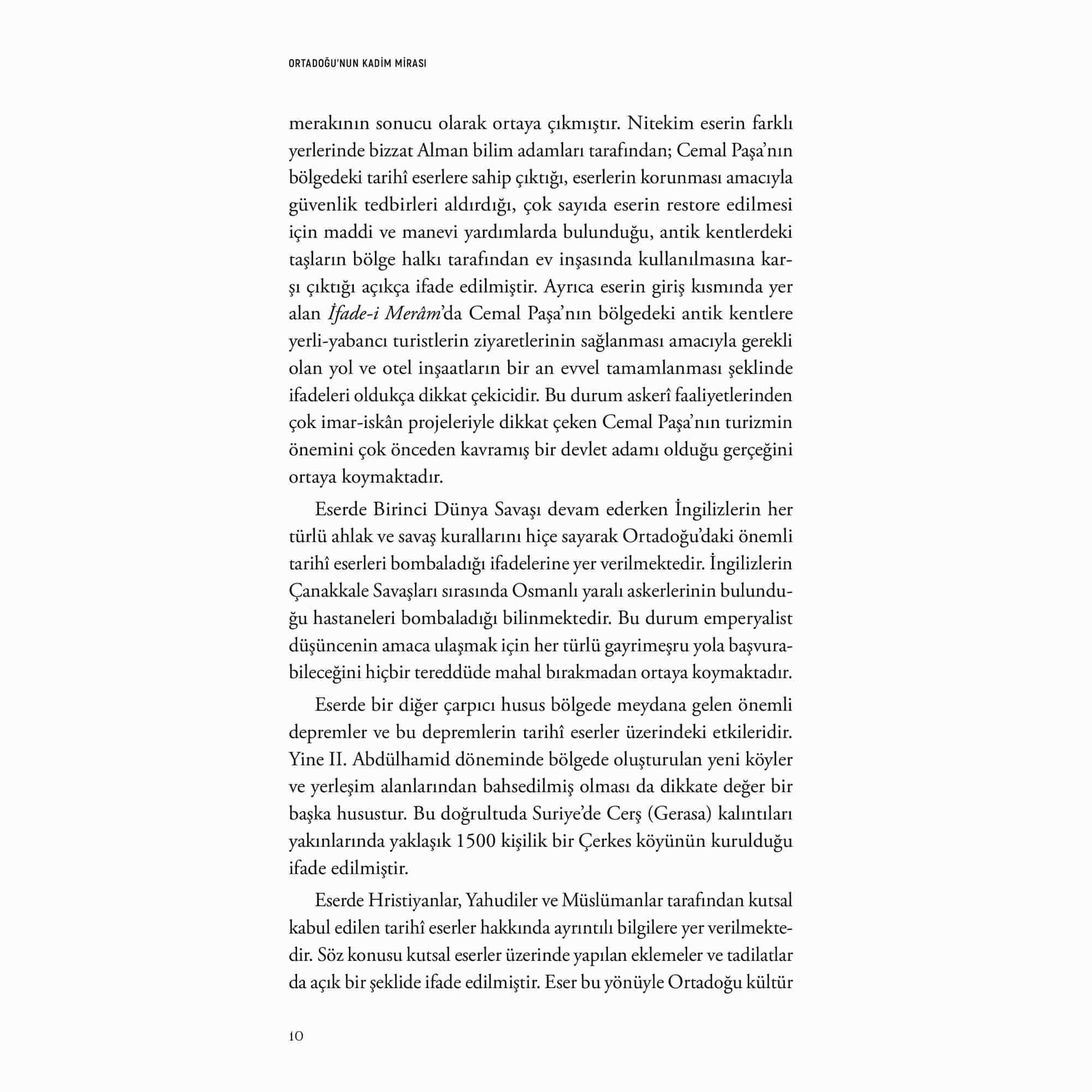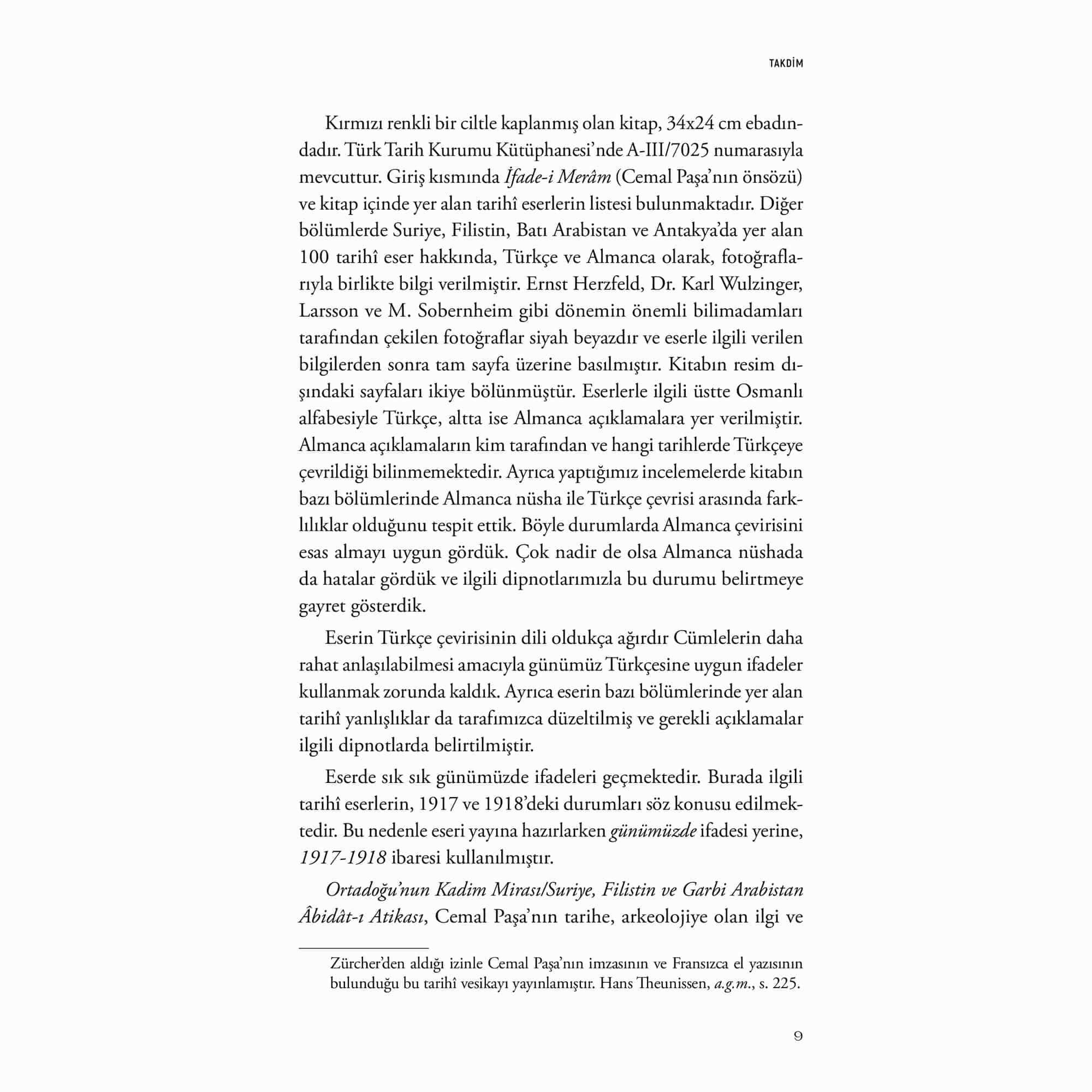 Suriye ve Filistin’de IV. Ordu Komutanlığı yapan Cemal Paşa, bölgenin hem mimari açıdan gelişmesi hem de azalmaya başlayan devlet otoritesinin yeniden sağlanması amacıyla İttihad-ı İslam siyasetinin bir parçası olarak bu coğrafyadaki İslam eserlerinin restore edilmesi hususunda azami gayret göstermiştir. Bu doğrultuda Selahaddin-i Eyyûbî Türbesi ile Emevi Câmii’nin etrafının temizlenmesi, Süleymaniye Tekkesi ile Selimiye Medresesi’nin yenilenmesi ve Şam’da Cemal Paşa Bulvarı’nın inşası gibi çok sayıda projeyi hayata geçirmiştir. Bu hususta Ahmed Cemal Paşa’nın mimari danışmanı, Enver Paşa tarafından Şam’a gönderilen İsviçreli Profesör Maximillian Zürcher olmuştur. Şehircilik çalışmalarındaki başarının ardından Cemal Paşa’nın ilgisi bölgedeki arkeolojik eserlerin kayıt altına alınmasına ve korunmasına yönelmiştir. Ortadoğu’nun Kadim Mirası: Suriye, Filistin ve Batı Arabistan Tarihî Eserleri başlığıyla okuyucuya sunulan bu çalışma, Osmanlı İmparatorluğu’nun en kritik dönemlerinde (1917-1918) Theodor Wiegand gibi son derece önemli bir Alman bilim insanına, Cemal Paşa tarafından ısmarlanmış ve kendi nezaretinde gerçekleştirilmiştir. Eserde, Suriye, Filistin, Batı Arabistan ve Antakya’da yer alan 100 tarihî eser hakkında, Osmanlı Türkçesi ve Almanca olarak, fotoğraflarıyla birlikte bilgi verilmiştir. İmparatorluğun içerisinde bulunduğu zorlu savaş şartlarına rağmen, İttihatçıların yapmış olduğu bu tür önemli çalışmalar, bölgedeki Türk izleri yanında antik ve klasik Osmanlı dönemi kültür yapılarının kayıt altına alınması ve akabinde korunmasına yönelik sofistike bir politikanın sonucudur. Eserin yazıldığı dönemin üstünden yalnızca bir asır geçmiş olmasına rağmen çalışmada yer alan tarihî eserlerden birçoğunun günümüze kadar ulaşmadığı göz önünde bulundurulduğunda bu çalışmanın kıymeti daha iyi anlaşılacaktır. Muhtevası itibarıyla arkeoloji ve Eski Çağ tarihçileri yanında son dönem Osmanlı tarihçileri için adeta paha biçilmez bir hazine niteliğinde olan bu çalışmayı, iki değerli bilim insanı Abdurrahman Uzunaslan ve Nevzat Artuç yayına hazırlayarak tarihî bir misyon üstlenmişlerdir.