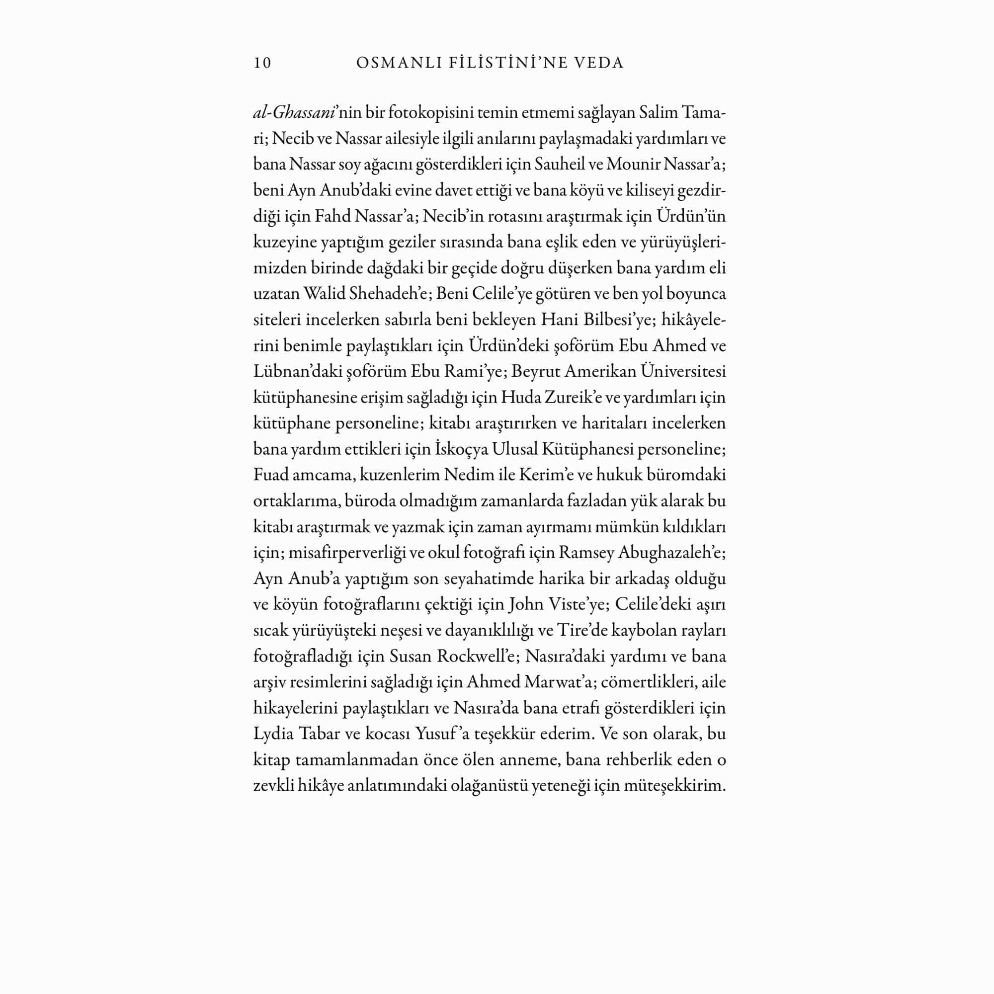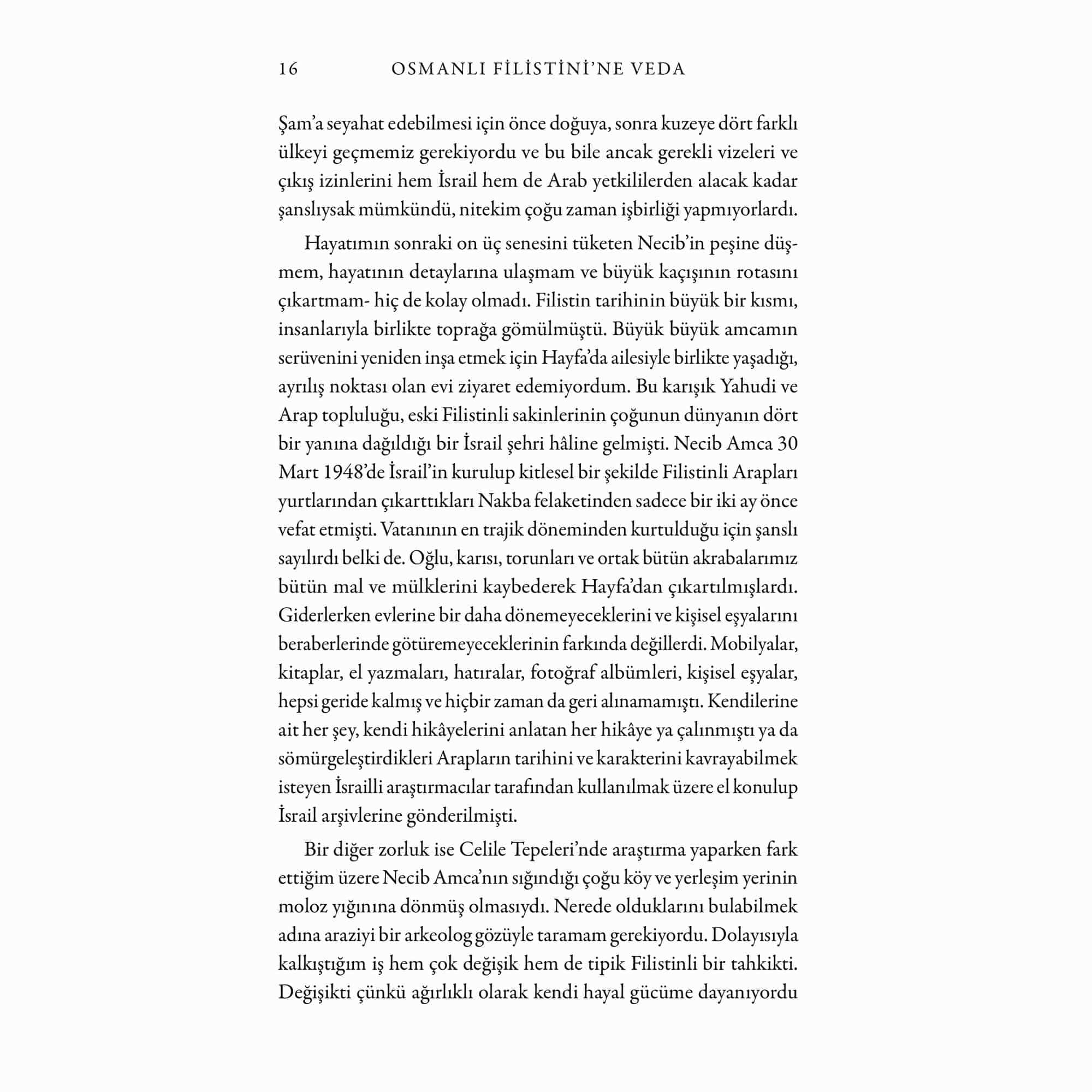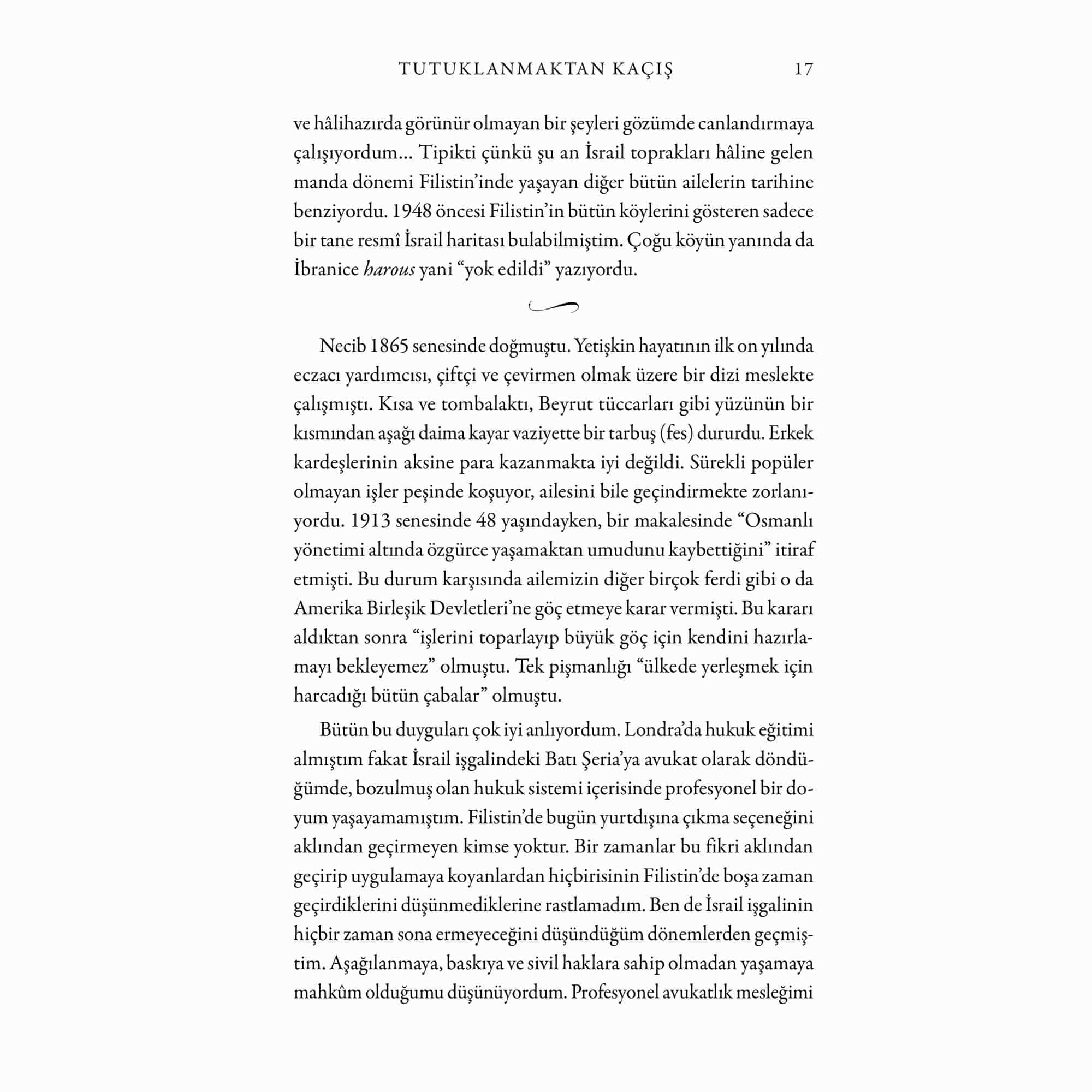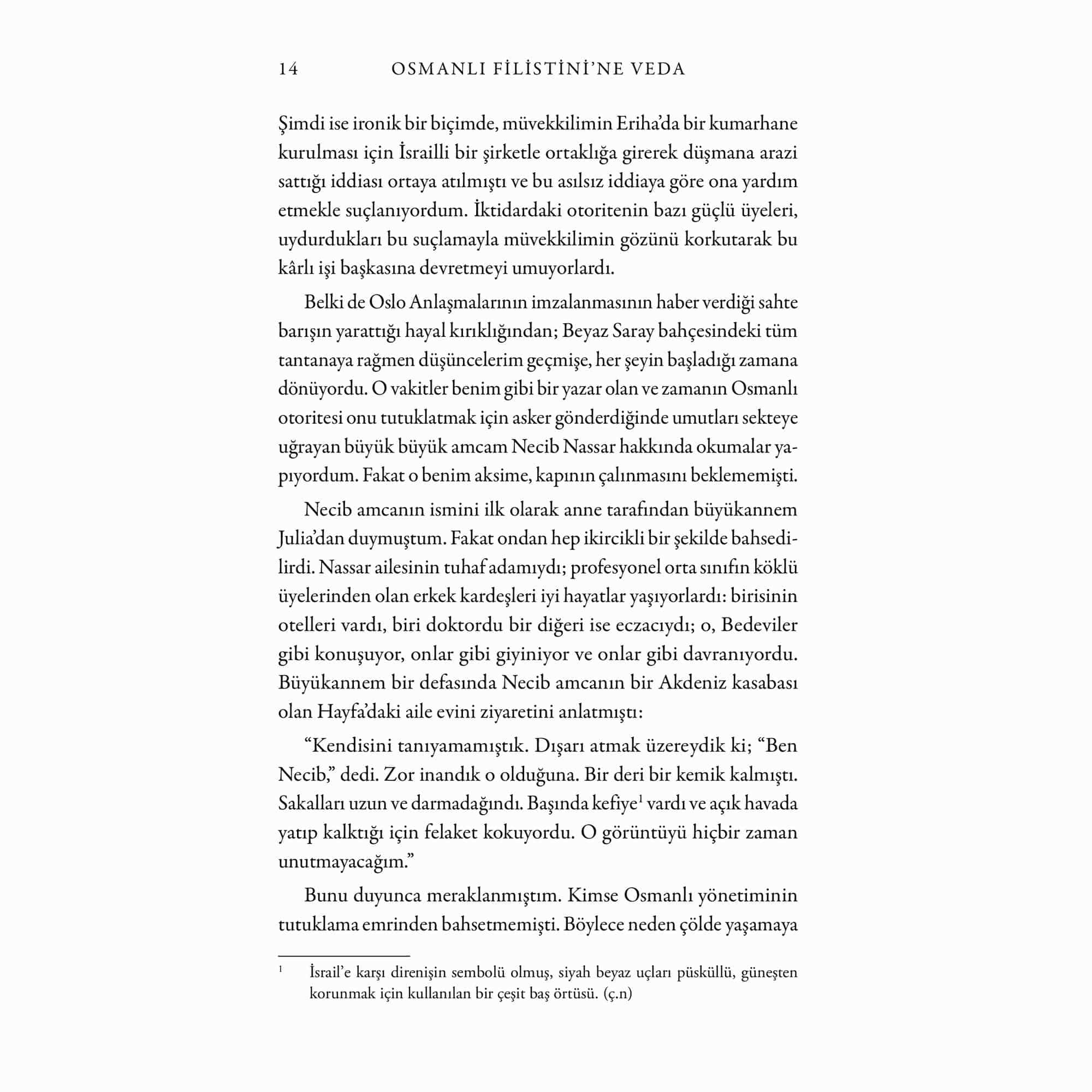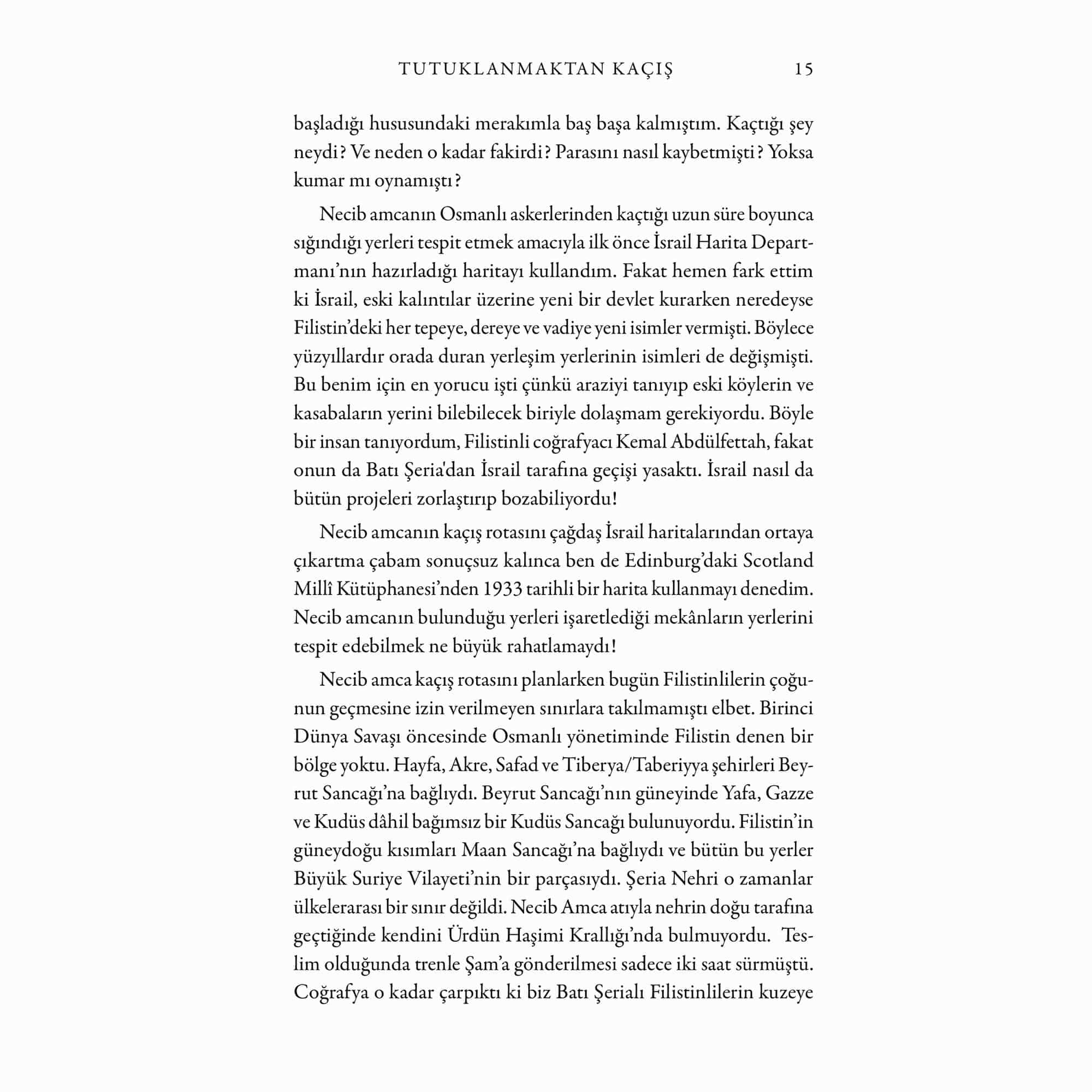 İnsan hakları örgütü El-Hak’ın kurucusu, “Orwell Prize for Books” (2008) ile “Moore Prize” (2020) ödüllerinin sahibi, Filistinli avukat ve yazar Raja Shehadeh’ten muhteşem bir Filistin tarihi…***Yazar Raja Shehadeh, aile tarihini araştırırken Osmanlı döneminde Filistin’de yaşamış büyük büyük amcası Necib Nassar’ı keşfeder. Hristiyan tebaadan bir entelektüel olan Necib Nassar reformlara sıcak baksa da Osmanlı’nın Orta Doğu’yu zaman içinde kaybetmesinden endişelidir. Bu gerekçeyle Osmanlı Devleti’nin I. Dünya Savaşı’na girmesine muhalefet ettiğinde ise hayatını altüst edecek bir gelişme yaşanır. Cemal Paşa’nın talimatıyla hakkında idam kararı çıkar. Devlet görevlileri üç yıl boyunca Necib’i ararken o da Filistin topraklarında gizlenir. Bu kaçış sürecinde köyler, bedevi çadırları ve dağlar onun yeni yuvası olur.Raja Shehadeh, bu aile tarihi anlatısında büyük büyük amcası Necib Nassar’ın kaçış yolculuğunu tekrarlıyor. Yolculuk sırasında amcasının uğradığı, konakladığı o hayat dolu yerlerin nasıl birer harabe hâline geldiğini gözlemliyor. Filistin’in bugün berbat bir hapishaneye dönüştüğünü, Necib amcası gibi özgürce dolaşmanın ise artık imkânsız olduğunu acı tecrübelerle keşfediyor.Zamandaki Kırılma: Osmanlı Filistin’ine Veda, siyonizmin bölgedeki ekolojik yapıyı, doğal kaynakları, huzuru, toplumsal hafızayı nasıl geri dönülmez biçimde mahvettiğini gözler önüne seren çarpıcı bir yolculuk öyküsü. Ancak her türlü kedere ve baskıya rağmen bir gün Filistin’in özgür olacağına inanan yazar, Necib amcasından miras kalan mücadeleci ruhu okuyucularına vermeyi başarıyor.