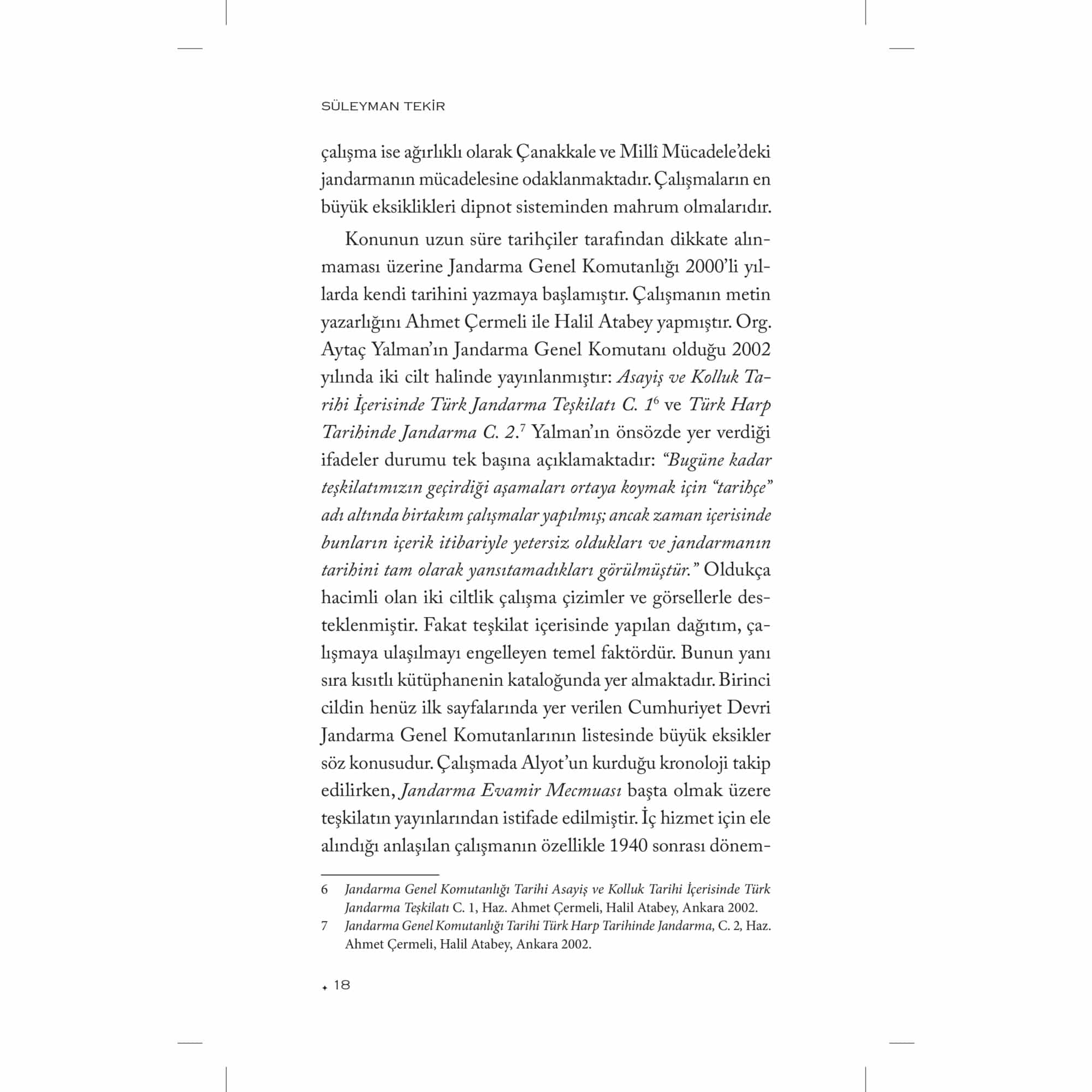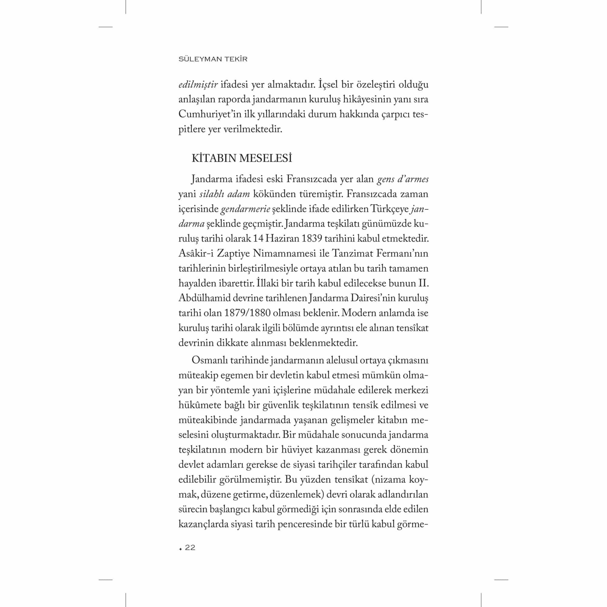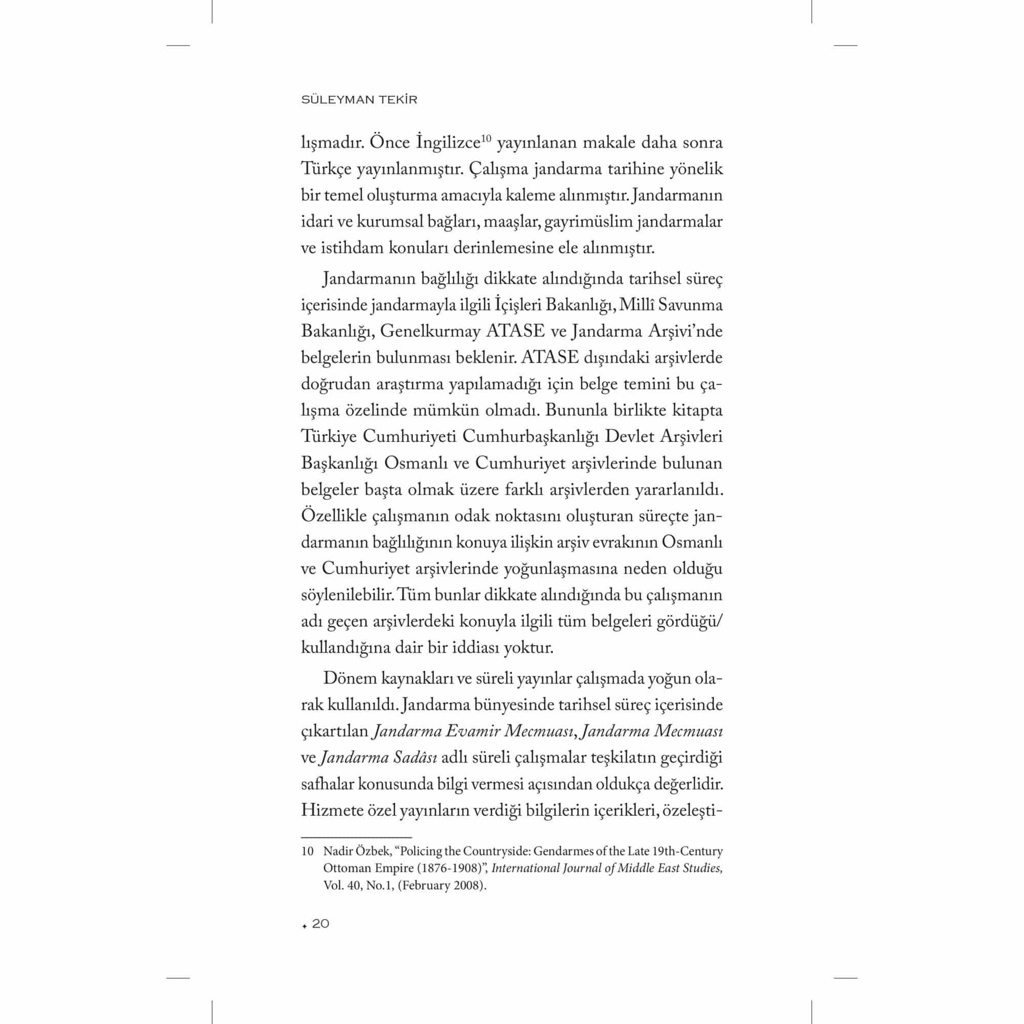 Askerî Tarih alanında yaptığı araştırmalarla tanıdığımız Süleyman Tekir bu çalışmasında, genel hatlarıyla Osmanlı İmparatorluğu’nda jandarmanın kuruluşundan erken Cumhuriyet yıllarına kadar bu teşkilatın geçirdiği safhaları ele almaktadır. Kurulmak istenilen jandarma teşkilatı, kuruluş sürecinde ortaya çıkan sorunlar ve jandarmaya olan ihtiyaç kitabın ana konusunu oluşturmaktadır. Tekir, birinci bölümde klasik dönemden itibaren modern jandarmaya giden süreci gözden geçirmektedir. Zaptiye Müşîriyeti ve jandarmanın kuruluşuna kadar geçen sancılı süreci bu bölümde ele almıştır. İkinci bölümü ise kendi içerisinde üç ayrı kısma ayırıyor: Birinci Dünya Savaşı, Mondros Mütarekesi ve Millî Mücadele Dönemi. İlk olarak Birinci Dünya Savaşı’nda cepheye sürülen jandarmaların kısa sürede cephelerde erimesini irdeliyor. Mütareke ahkâmına göre ülkenin tek silahlı unsuru haline gelen jandarmanın Millî Mücadele yıllarındaki teşkilatı ve faaliyetleri ise bölümün son kısmını teşkil ediyor. Yazar, kitabın üçüncü ve son bölümünde Atatürk devrinde uzun savaş yıllarında yıpranan jandarmanın yeniden teşkilatlandırılmasını, Cumhuriyet jandarmasının kuruluş sürecini ele alıyor. Arşiv belgeleri ve kaynak eserlerin ışığında devlet ve toplum arasında aracı bir teşkilat olan modern jandarmanın kuruluş hikâyesinin kronolojik olarak anlatıldığı bu çalışma Türk Askerî Tarihi alanında çok önemli bir boşluğu dolduruyor.