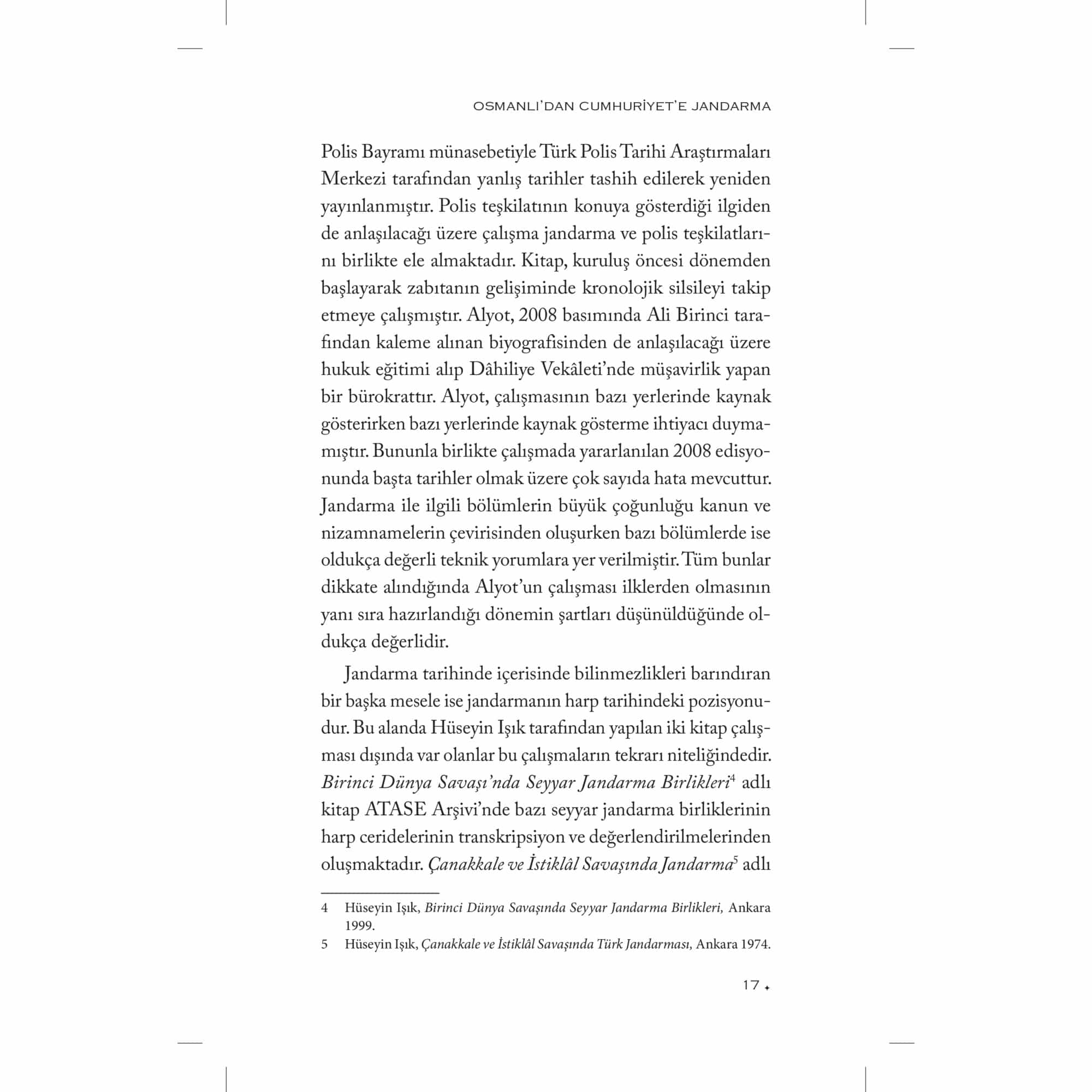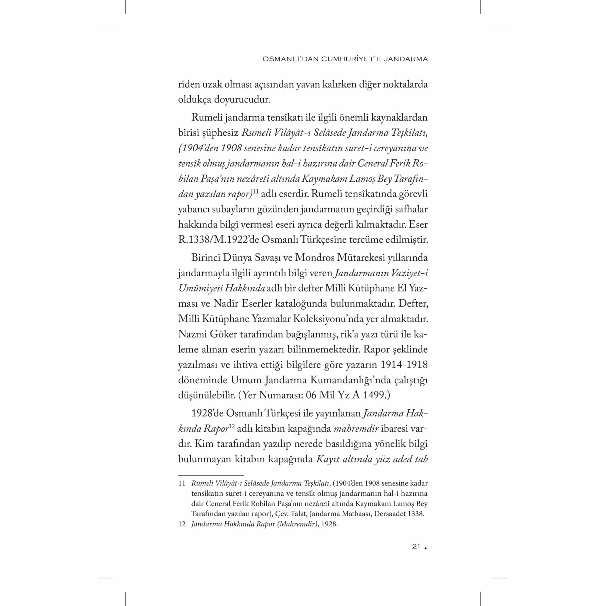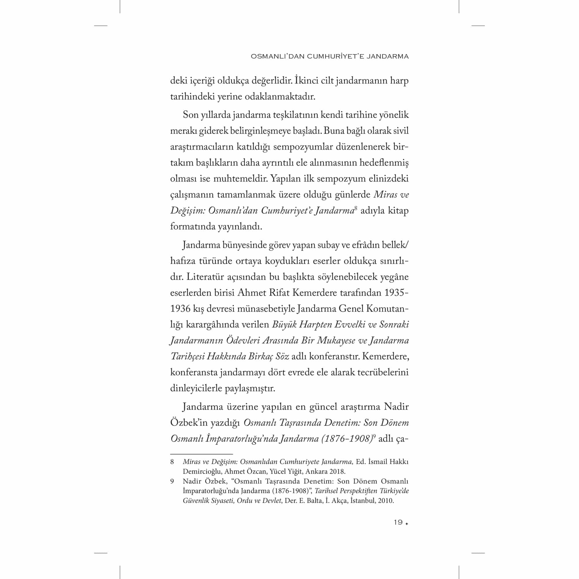 Askerî Tarih alanında yaptığı araştırmalarla tanıdığımız Süleyman Tekir bu çalışmasında, genel hatlarıyla Osmanlı İmparatorluğu’nda jandarmanın kuruluşundan erken Cumhuriyet yıllarına kadar bu teşkilatın geçirdiği safhaları ele almaktadır. Kurulmak istenilen jandarma teşkilatı, kuruluş sürecinde ortaya çıkan sorunlar ve jandarmaya olan ihtiyaç kitabın ana konusunu oluşturmaktadır. Tekir, birinci bölümde klasik dönemden itibaren modern jandarmaya giden süreci gözden geçirmektedir. Zaptiye Müşîriyeti ve jandarmanın kuruluşuna kadar geçen sancılı süreci bu bölümde ele almıştır. İkinci bölümü ise kendi içerisinde üç ayrı kısma ayırıyor: Birinci Dünya Savaşı, Mondros Mütarekesi ve Millî Mücadele Dönemi. İlk olarak Birinci Dünya Savaşı’nda cepheye sürülen jandarmaların kısa sürede cephelerde erimesini irdeliyor. Mütareke ahkâmına göre ülkenin tek silahlı unsuru haline gelen jandarmanın Millî Mücadele yıllarındaki teşkilatı ve faaliyetleri ise bölümün son kısmını teşkil ediyor. Yazar, kitabın üçüncü ve son bölümünde Atatürk devrinde uzun savaş yıllarında yıpranan jandarmanın yeniden teşkilatlandırılmasını, Cumhuriyet jandarmasının kuruluş sürecini ele alıyor. Arşiv belgeleri ve kaynak eserlerin ışığında devlet ve toplum arasında aracı bir teşkilat olan modern jandarmanın kuruluş hikâyesinin kronolojik olarak anlatıldığı bu çalışma Türk Askerî Tarihi alanında çok önemli bir boşluğu dolduruyor.