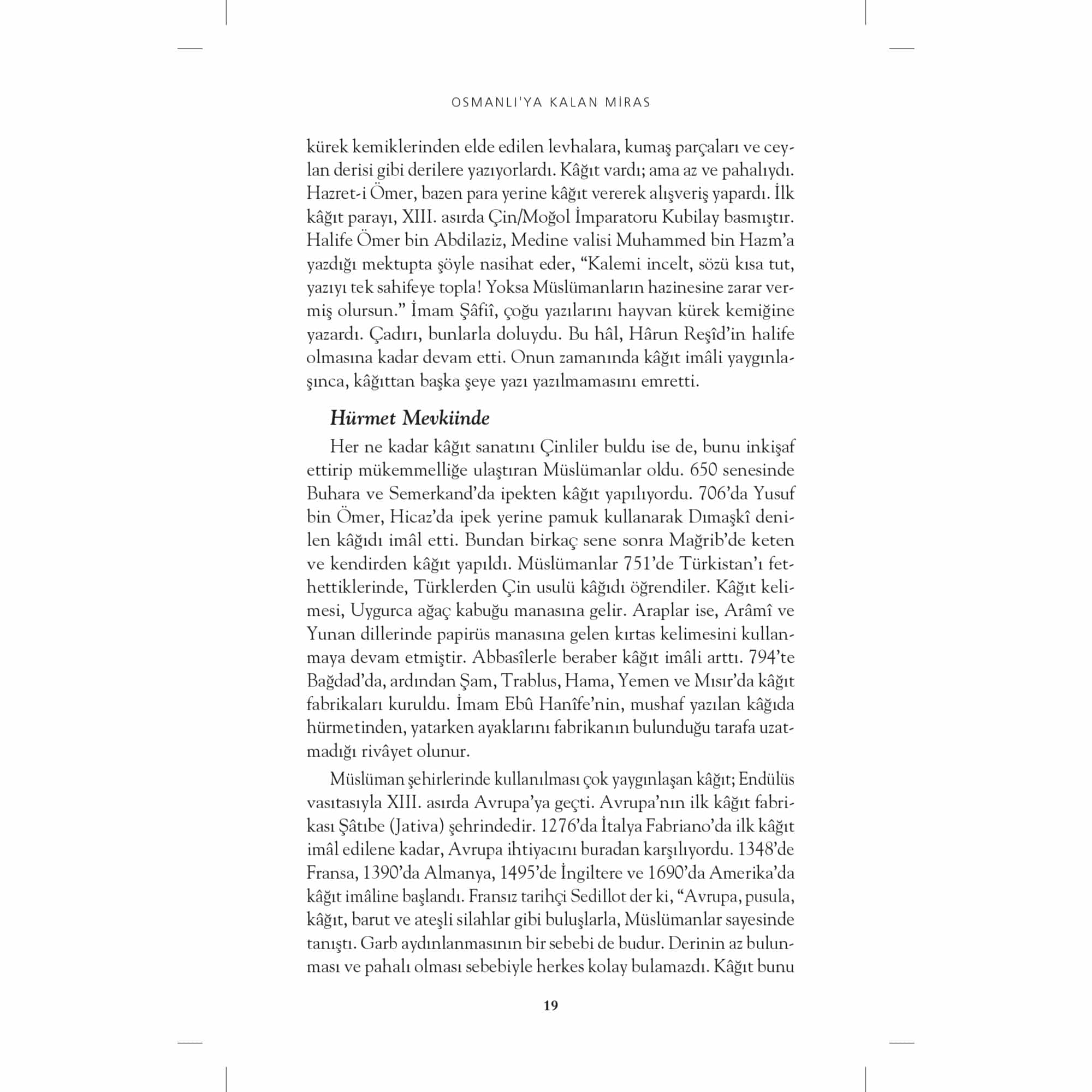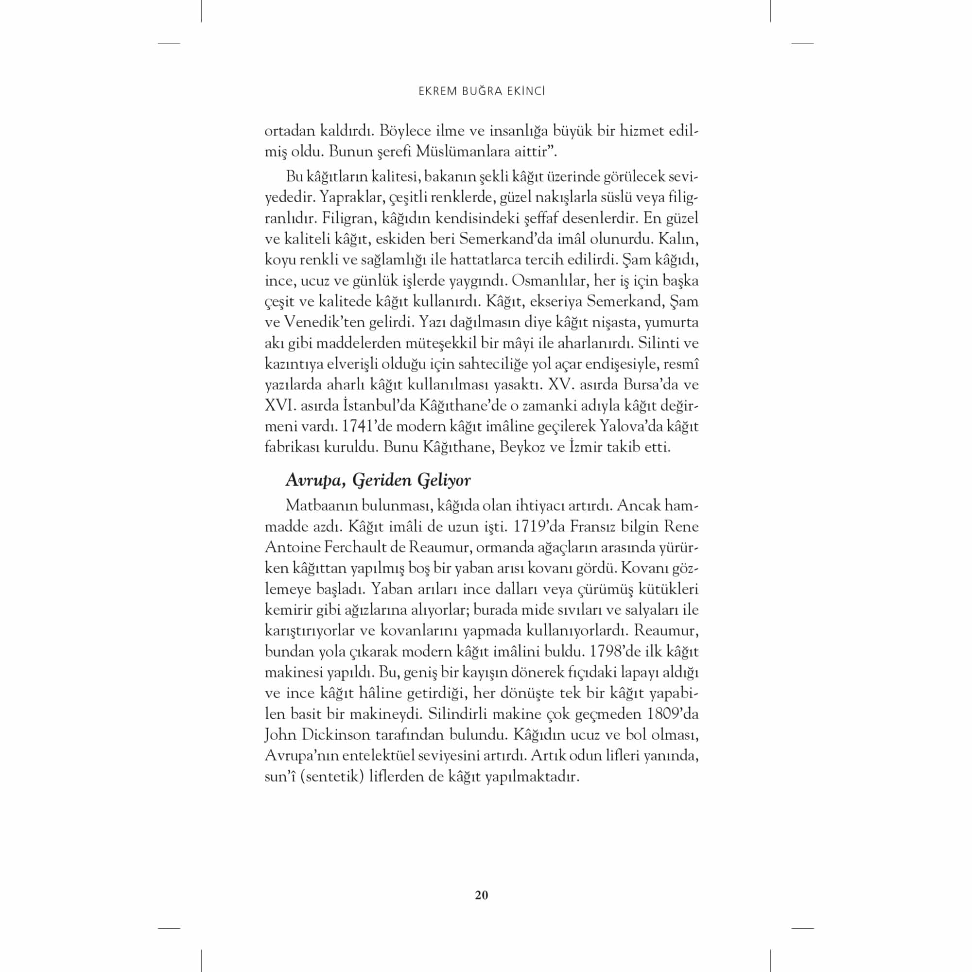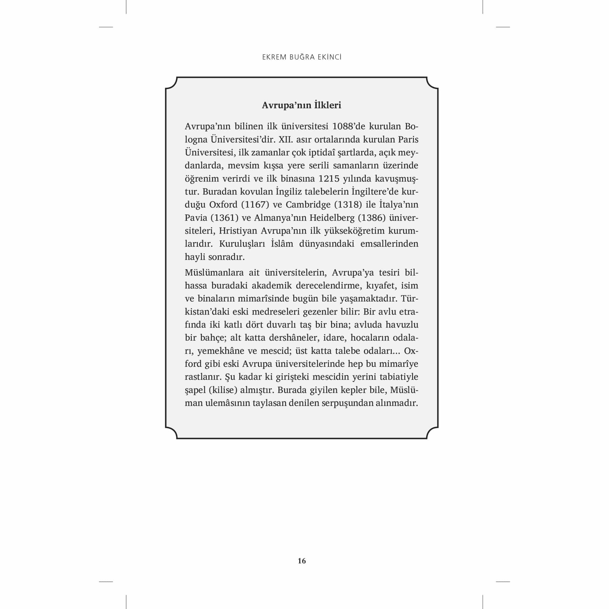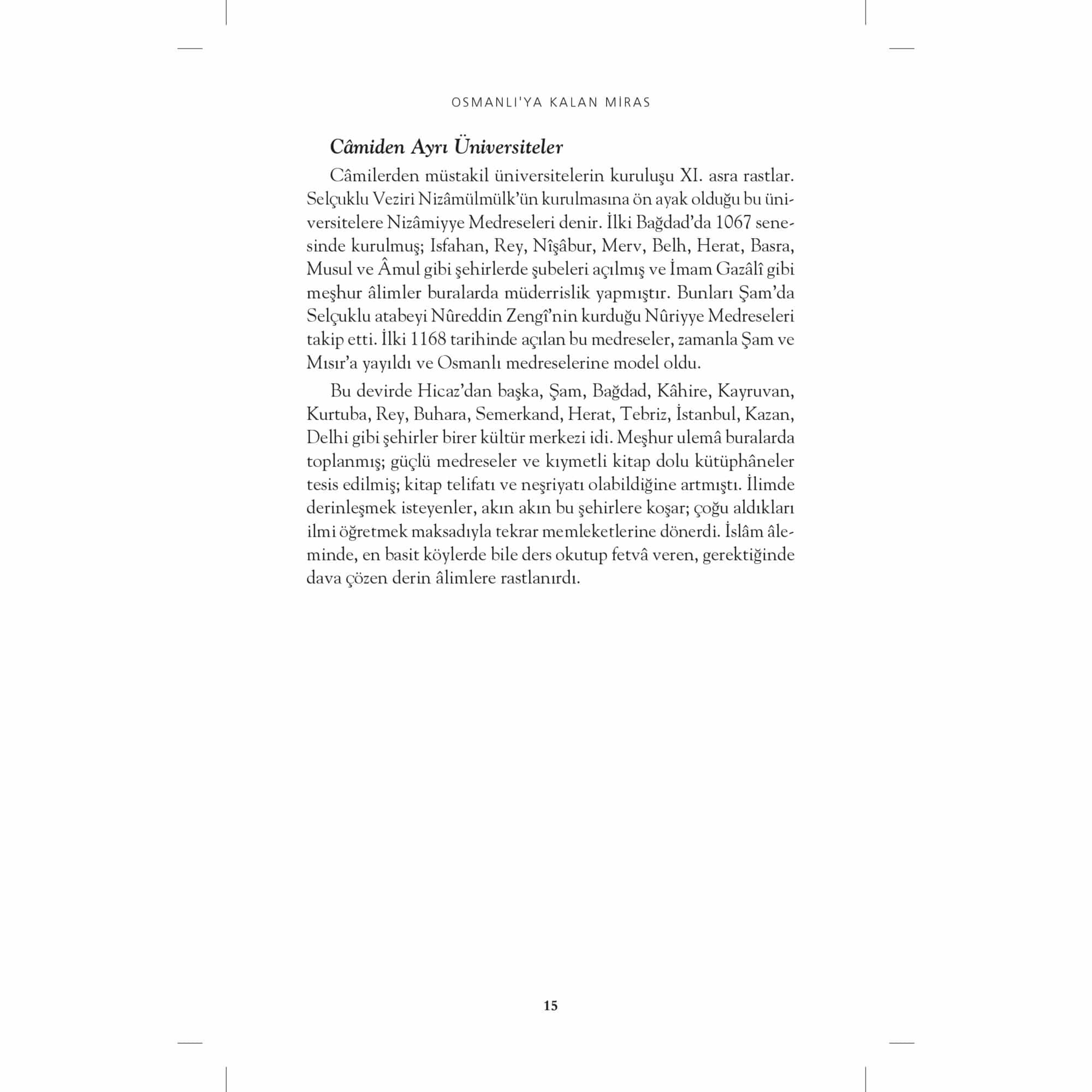 "Yakın tarihin altı asrına damgasını vuran Osmanlı Devleti, Avrupa ile en çok teması olan İslâm devleti idi. Öyle ki ecnebîler, İslâm deyince Türk’ü anlar; 'Müslüman oldu!' yerine 'Türk oldu!' derlerdi. Asırlarca Batı’nın Müslümanlığa açılan penceresi Osmanlılar oldu. Bu miras, onlara cihan hâkimiyetinin yolunu açtığı gibi, bugün bile özlenen apayrı bir dünya görüşünün de temsilcisi kıldı. Elinizdeki kitap, Osmanlı’ya kalan işte bu mirastan bahsetmektedir." Ekrem Buğra EkinciEkrem Buğra Ekinci Osmanlı’ya Kalan Miras kitabıyla Osmanlı medeniyetini meydana getiren ve asırlarca yaşatan maddi-manevi dinamikleri akıcı bir üslupla anlatıyor. Osmanlı sosyal hayatının her sahasında, o köklü medeniyeti kuran ve devamını temin eden birçok detayı yakalayıp rehber edineceğiniz bu çalışmada, aslında matbaanın zannedildiği gibi Osmanlılara geç gelmediğini; Müslümanların ilimde geri kalmadıklarını; atalarımızın yanmayan, yıkılmayan kütüphaneler inşa ederek ilme nasıl değer verdiklerini; Osmanlı cemiyetinde okur yazar nisbetinin zannedilenden daha fazla olduğunu; mahkemeye taşınan her türlü davanın kayda geçildiğini; Ramazan ayı ile birlikte oruç ve kurban gibi vecibelerin cemiyet hayatında nasıl yerine getirildiğini ve daha nice enteresan hâdiseleri birbirinden çarpıcı misallerle okuyacaksınız… Osmanlı’yı Osmanlı yapan, Hazret-i Peygamber’den Osmanlı’ya intikal eden mirasın “Osmanlı Medeniyeti”ni nasıl kurduğu ve birçoğunun hâlâ daha nasıl yaşadığı Ekrem Buğra Ekinci’nin enfes üslubuyla Osmanlı’ya Kalan Miras’ta…