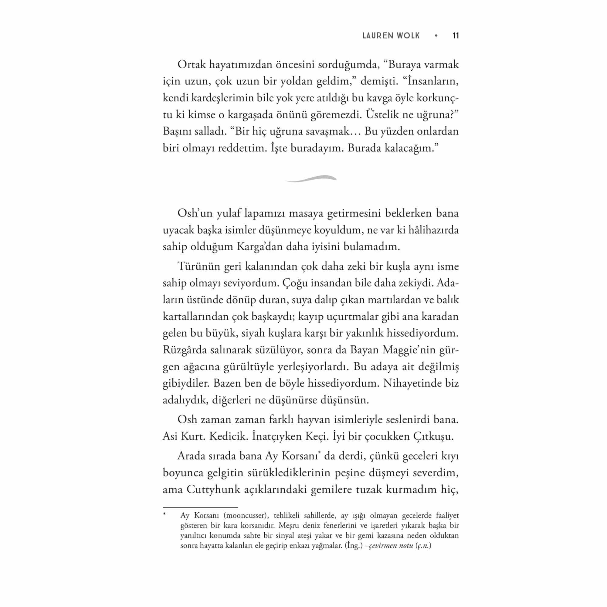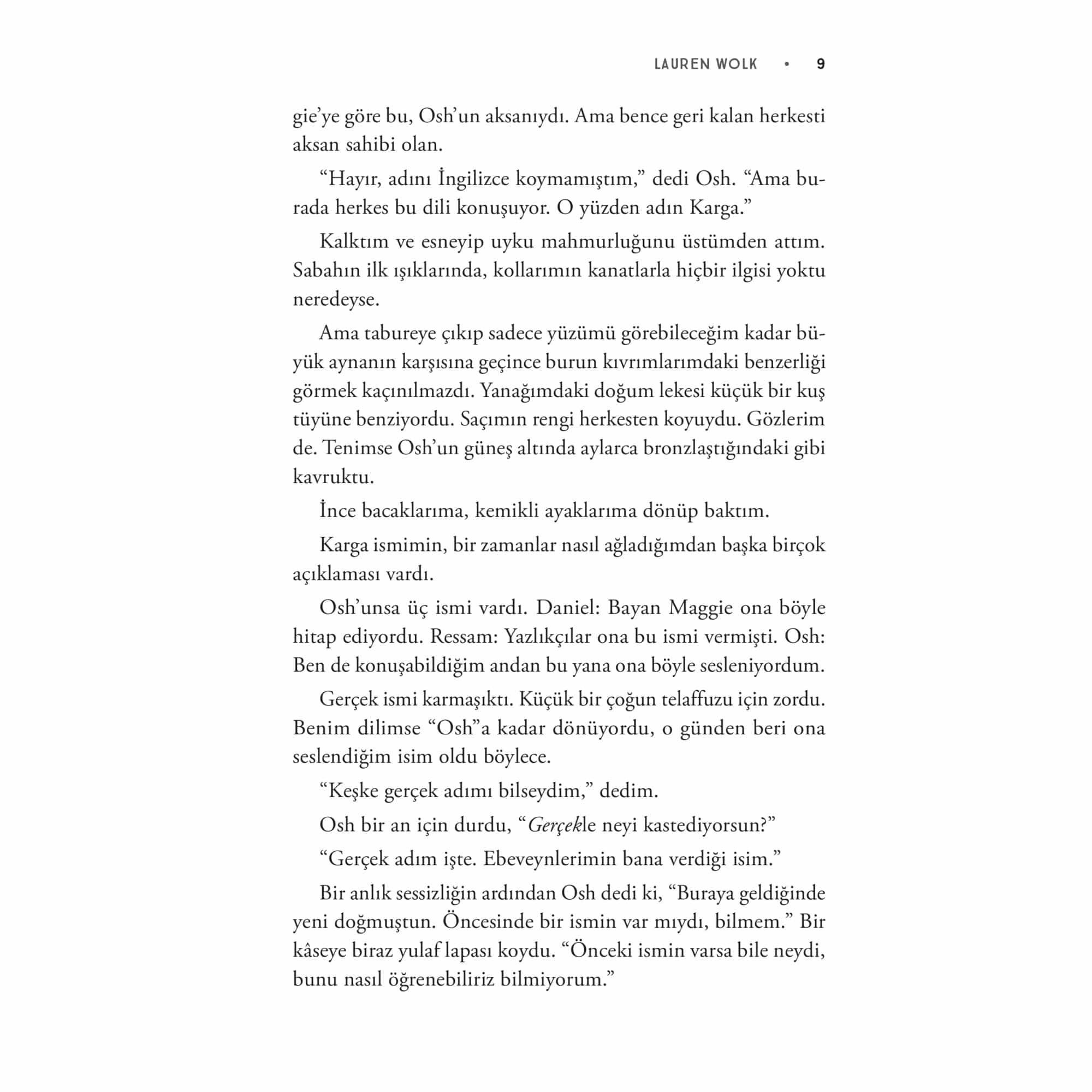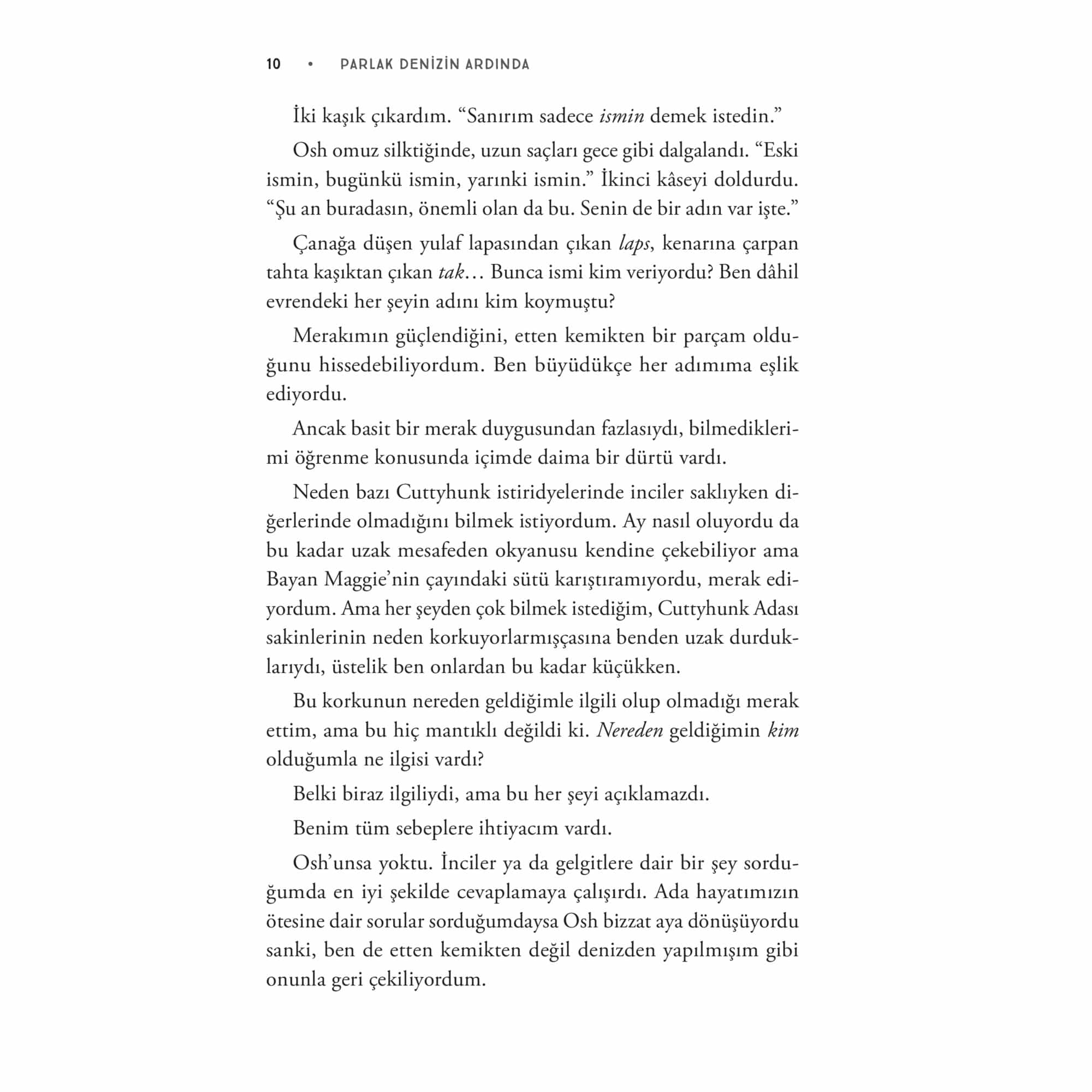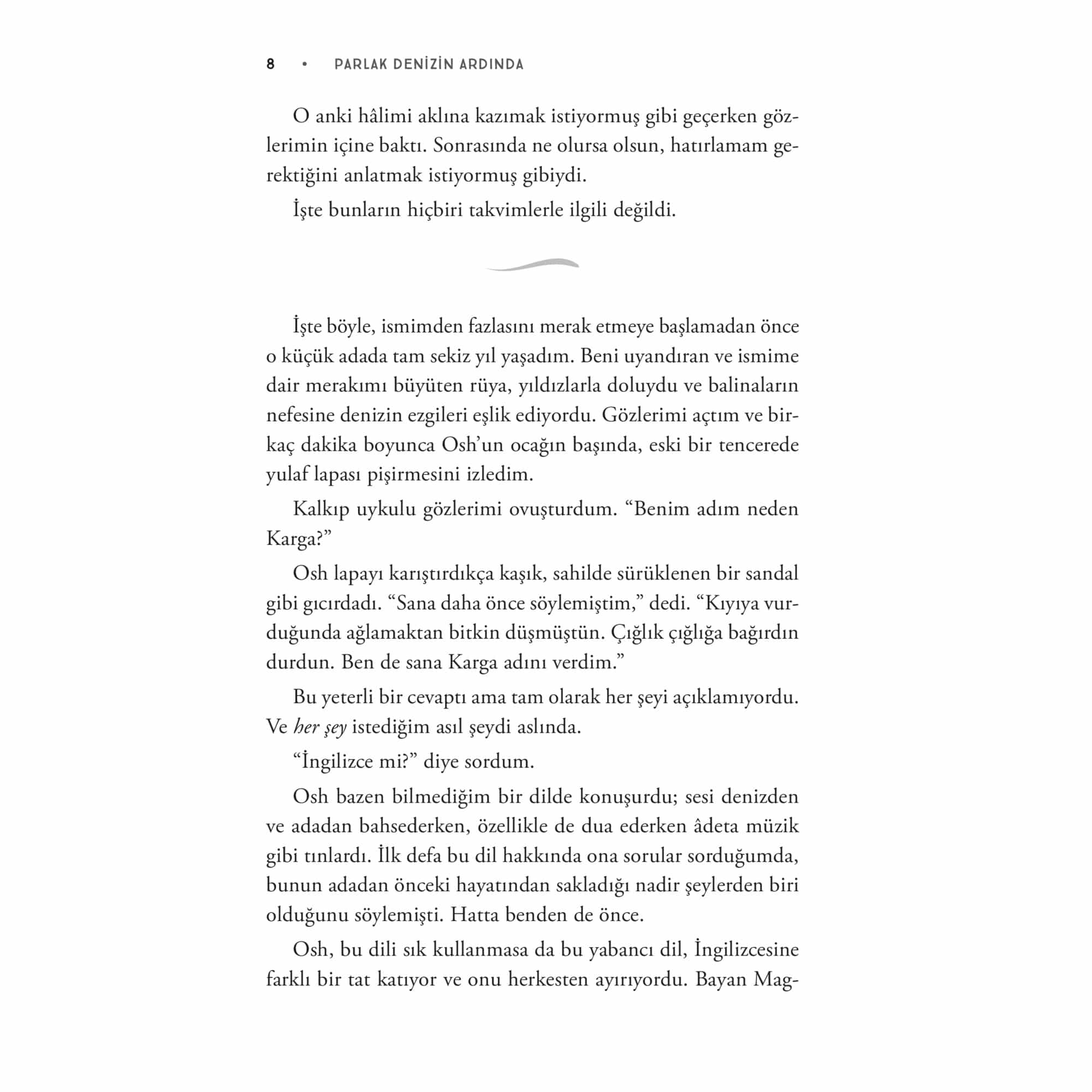 On iki yaşındaki Karga’nın herkesten farklı bir adı, farklı bir geçmişi var. İnsanların ailelerini ve geçmişlerini bildikleri dünyada, Karga yalnızca Osh’a ve Bayan Maggie’ye sahip. Karga’nın geçmişi hakkında bildiği tek şey, doğar doğmaz bir kayığa konup denize bırakıldığı. Ancak yaşadığı adadaki insanlar, Karga’nın, cüzzam hastalarının toplandığı ve tedavi edildiği Penikese’te doğduğundan ve onun da hasta olduğundan şüphe ediyorlar. Bu yüzden herkes Karga’dan uzak duruyor. Kimliğin ve ailenin gerçek anlamlarını, onları bulmak için çıktığı yolda öğrenen Karga, hedefine ulaşabilecek mi? “Uyarayım, Parlak Denizin Ardında’yı elinize aldınız mı bırakmak istemeyeceksiniz. Lauren Wolk’un her zamanki şiirsel kaleminden Karga’nın içgüdülerini dinleyip geçmişini keşfetme yolculuğunu okurken nefesinizi tutacaksınız.” -NPR Yılın Kitapları Seçkisi “Uzaktaki bir adada tüten ateş, kimi zaman dokunaklı, kimi zaman korkutucu başka olayların da fitilini ateşliyor ve Lauren Wolk, bunları, görülmemiş güzellikte bir dille sunuyor.” -The Wall Street Journal