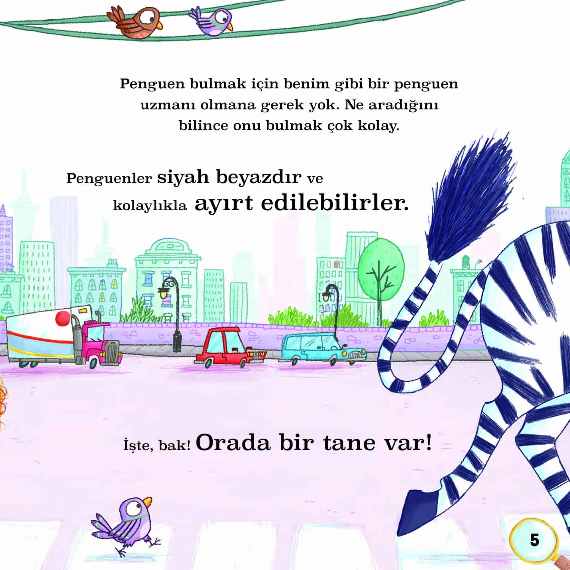 İki çocuk şehrin içinde gezen bir penguenin peşine düşerler. Kendini penguen uzmanı olarak tanımlayan kahramanımız gördüğü çeşitli hayvanları penguen zanneder. Ancak bunlardan hiçbiri gerçek bir penguen değildir. Kahramanlarımızla beraber pengueni bulmaya var mısın? Küçük okuyucular eğlenceli bir öykünün eşliğinde her sayfada gizlenmiş pengueni arayıp, diğer hayvanların ne olduğunu bulmaya çalışacaklar. Kitabın sonunda ise öyküde geçen tüm hayvanları hep beraber yakından tanıyacağız!