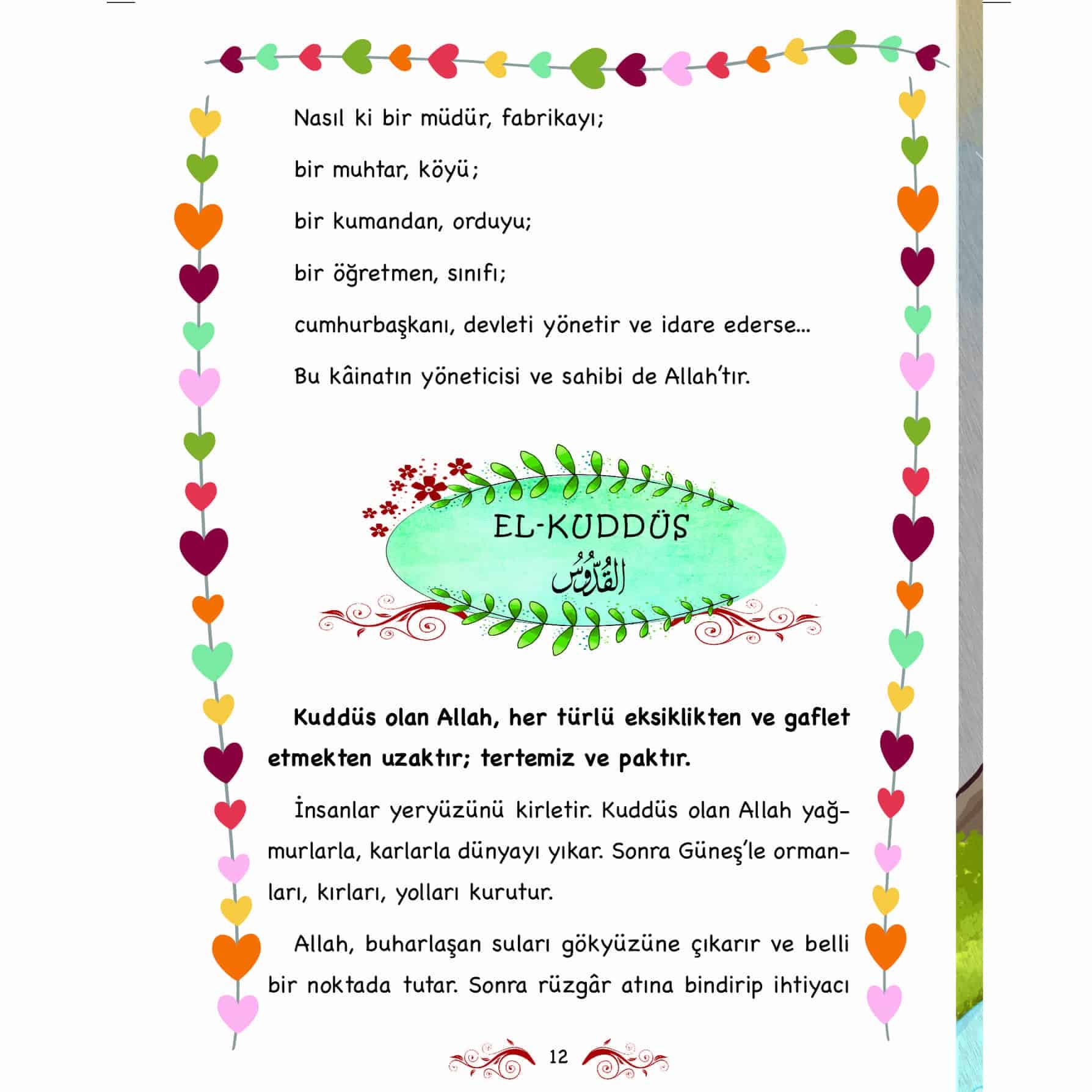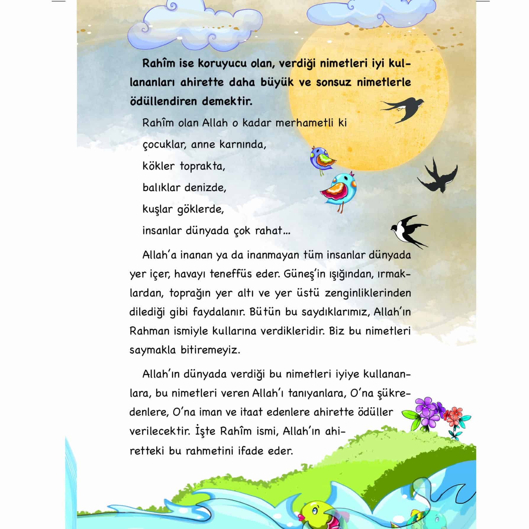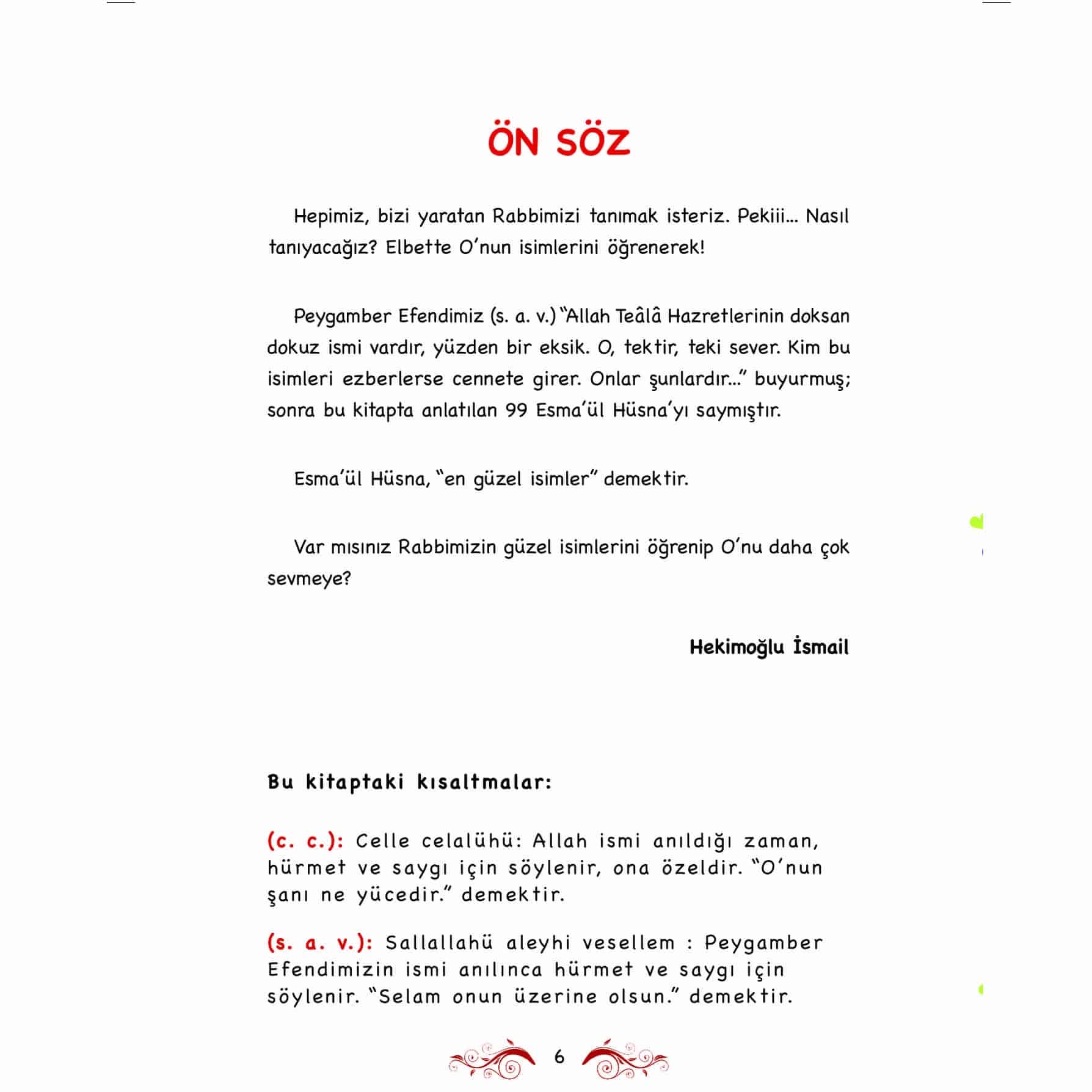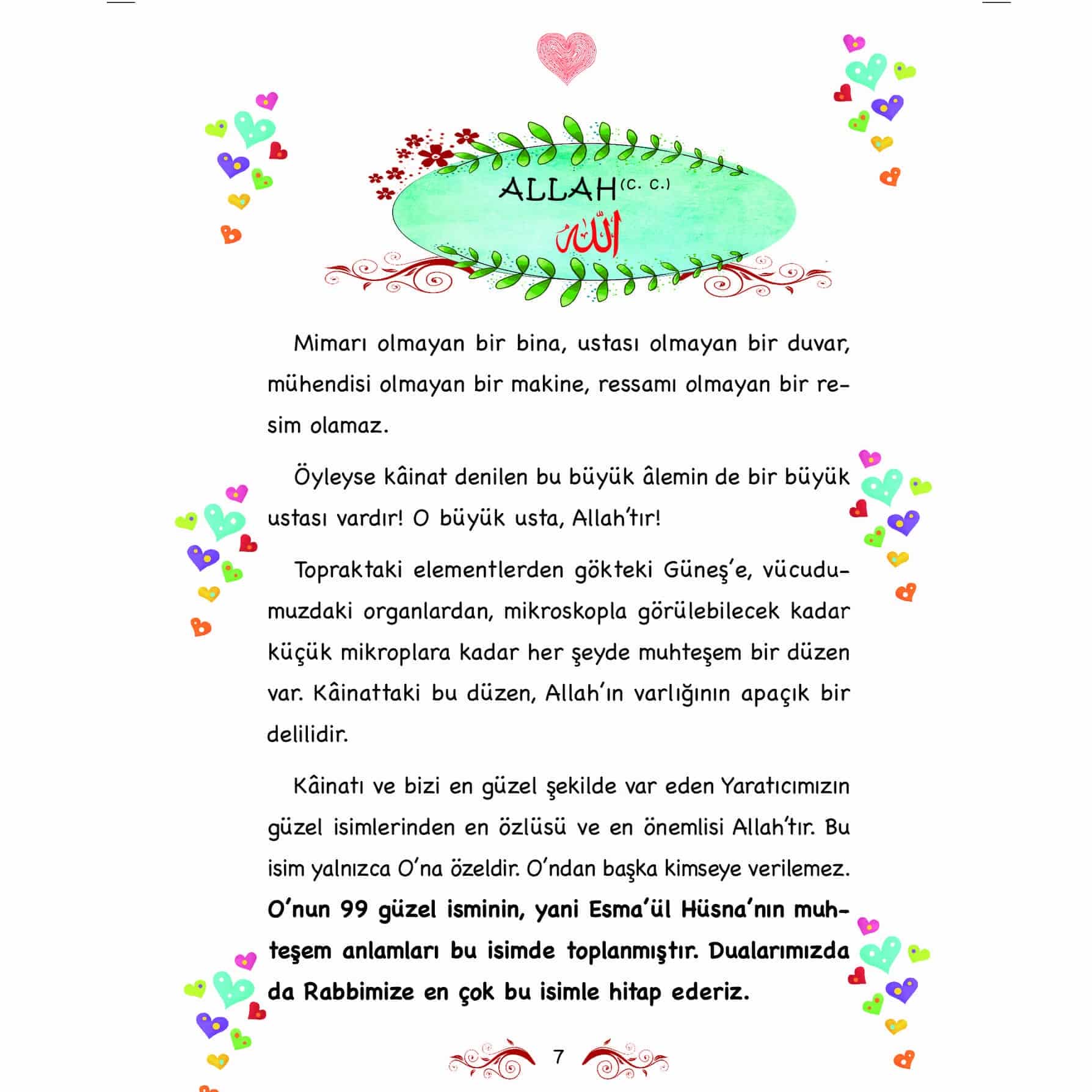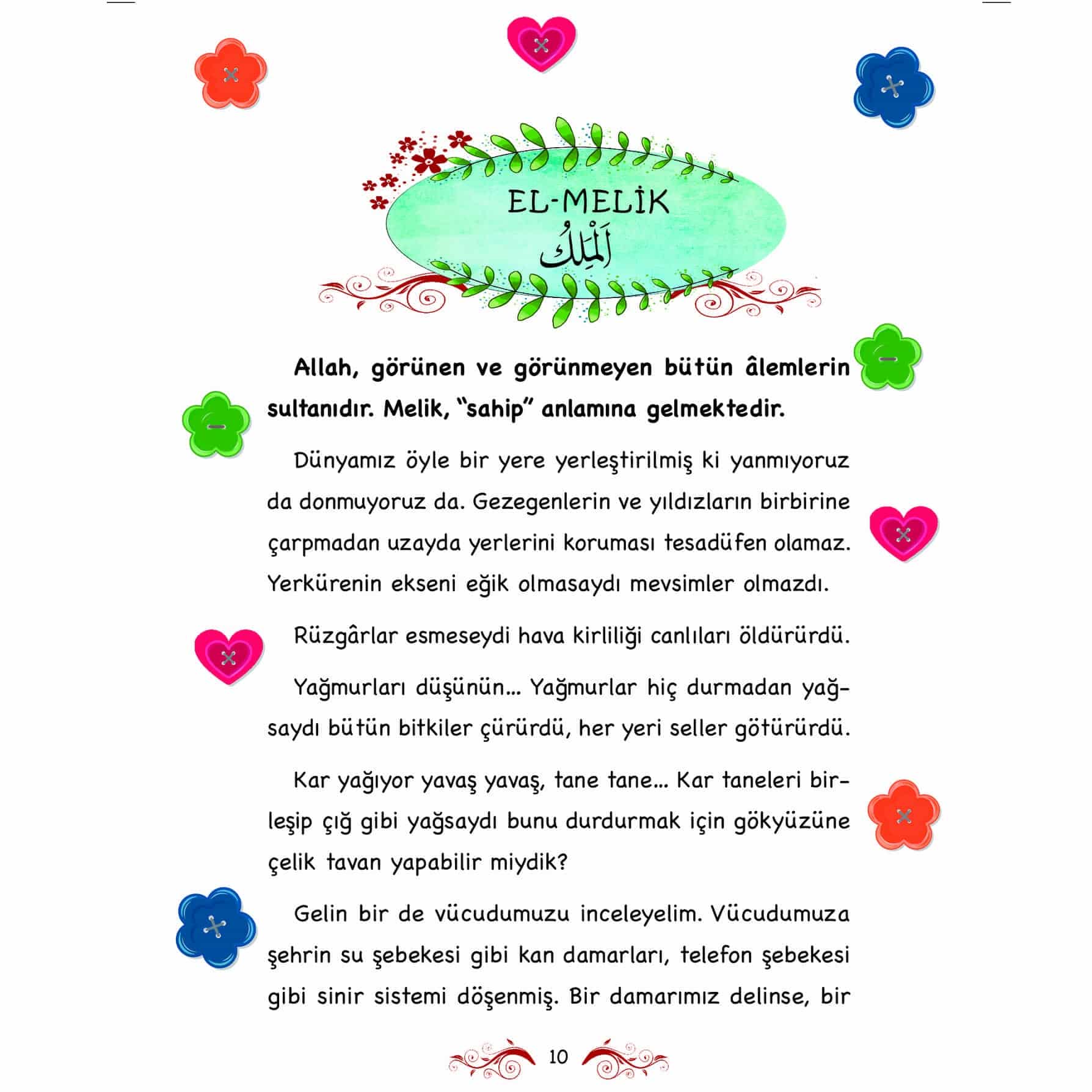 Kitabın ilk basımı "Biricik Rabbim Ne Güzel İsimlerin" ismiyle yayımlanmıştır. Allah, “Gizli bir hazineydim, bilinmek istedim.” buyuruyor. Bizden, O’nu tanımamızı ve bilmemizi istiyor. Peki, nasıl tanıyacağız? Elbette O’nun güzel isimlerini ve bunların anlamlarını öğrenerek! Peygamber Efendimiz, “Allah Teâlâ Hazretlerinin doksan dokuz ismi vardır, yüzden bir eksik. O, tektir, teki sever. Kim bu isimleri ezberlerse cennete girer. Onlar şunlardır...” buyuruyor. Sonra da bu kitapta anlatılan 99 Esmaü'l Hüsna’yı sayıyor. Esma’ül Hüsna, “en güzel isimler” anlamına geliyor. Var mısınız Rabbimizi bu güzel isimleriyle tanımaya ve O’nu daha çok sevmeye?