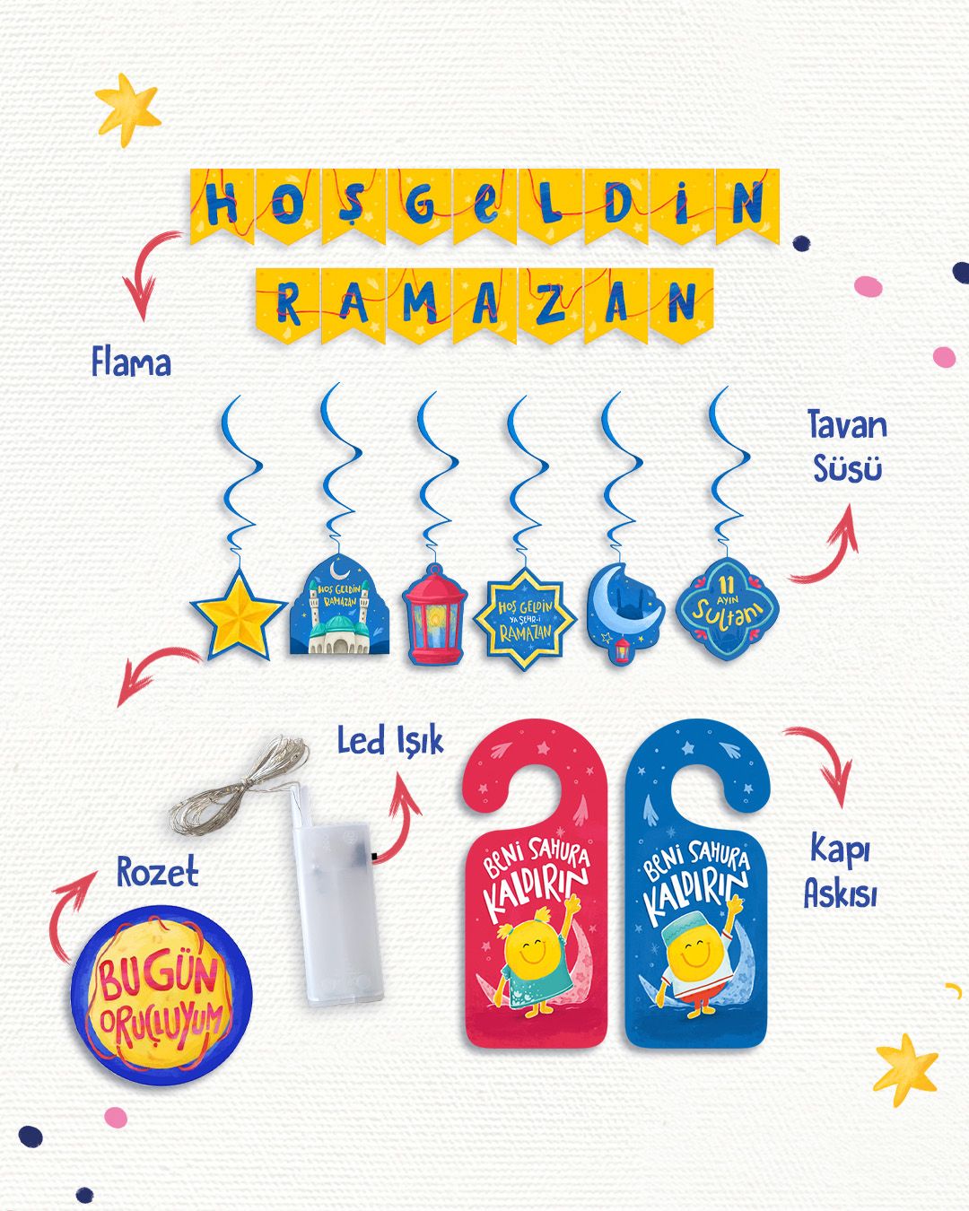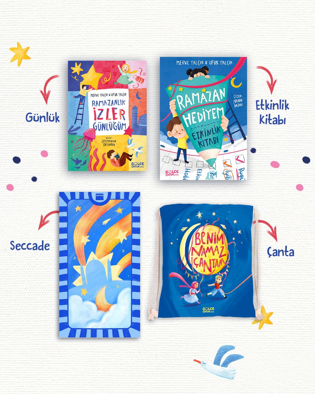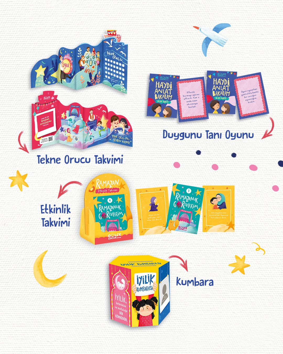 “Ramazan Hediyem” sadece bir kutu değil; Ramazan’ı çocuklar için anlamlı ve unutulmaz kılan bir deneyimdir. Kutuda yer alan etkinlik kitabı; iyilik, sabır, şükür gibi değerleri sade ve samimi bir anlatımla sunarken, dua ve görev sayfaları Ramazan’ı aktif olarak yaşamaya teşvik eder. Kutunun içindeki özel ürünlerle çocuklar kendi Ramazan atmosferlerini oluşturur, ibadetle ve aileyle geçirilen zamanı daha anlamlı hale getirir. Kutuda Neler Var: Etkinlik kitabı, Ramazan Günlüğü, Namaz Çantası, Seccade, Rozet, Kapı Askısı, Etkinlik Takvimi, İyilik Kumbarası, Duygunu Tanı Oyunu, Led Işık, Hoş Geldin Ramazan Yazısı, Tavan Süsü, Tekne Orucu Takvimi