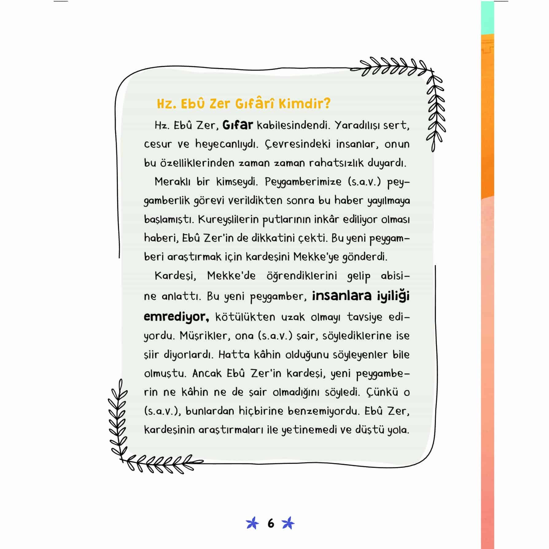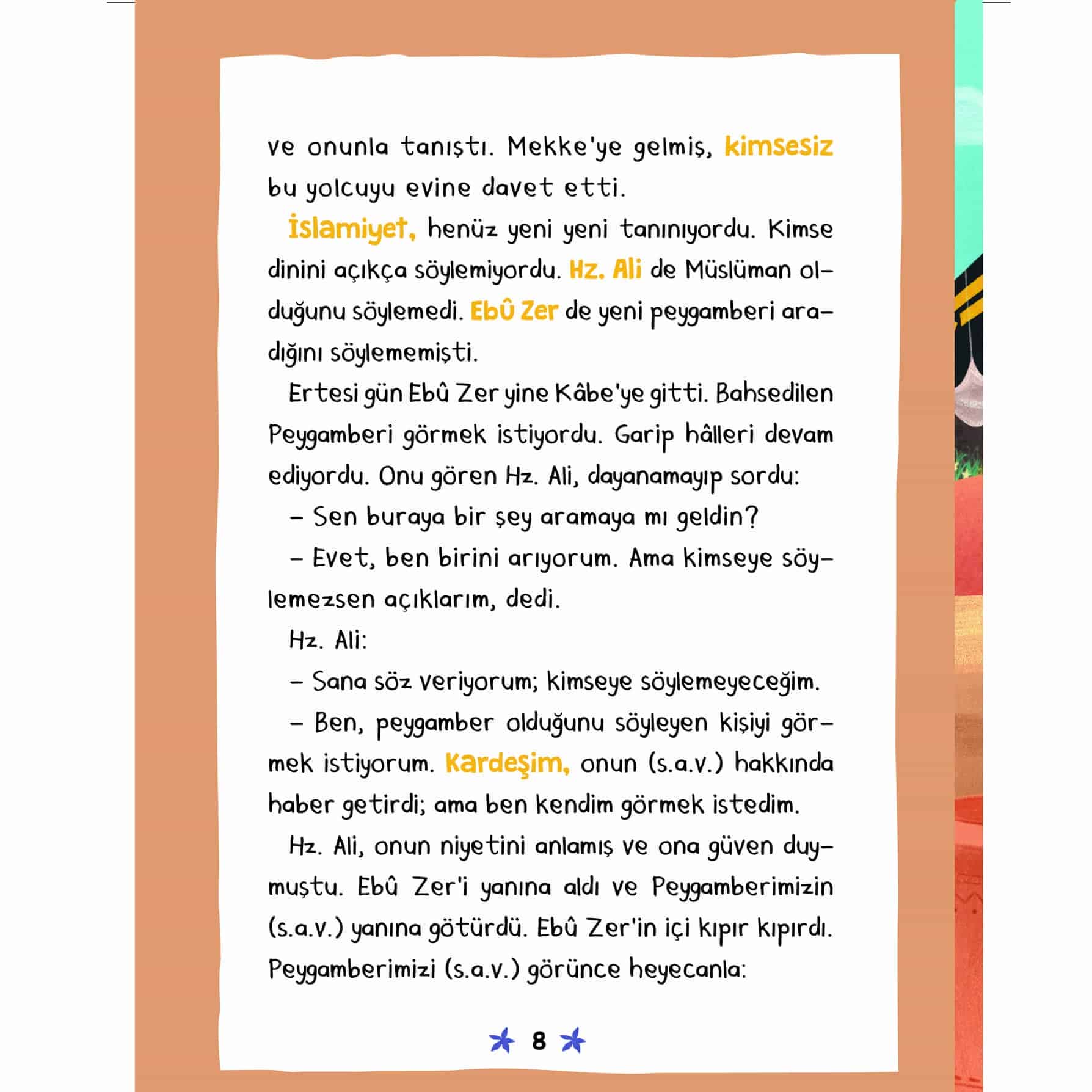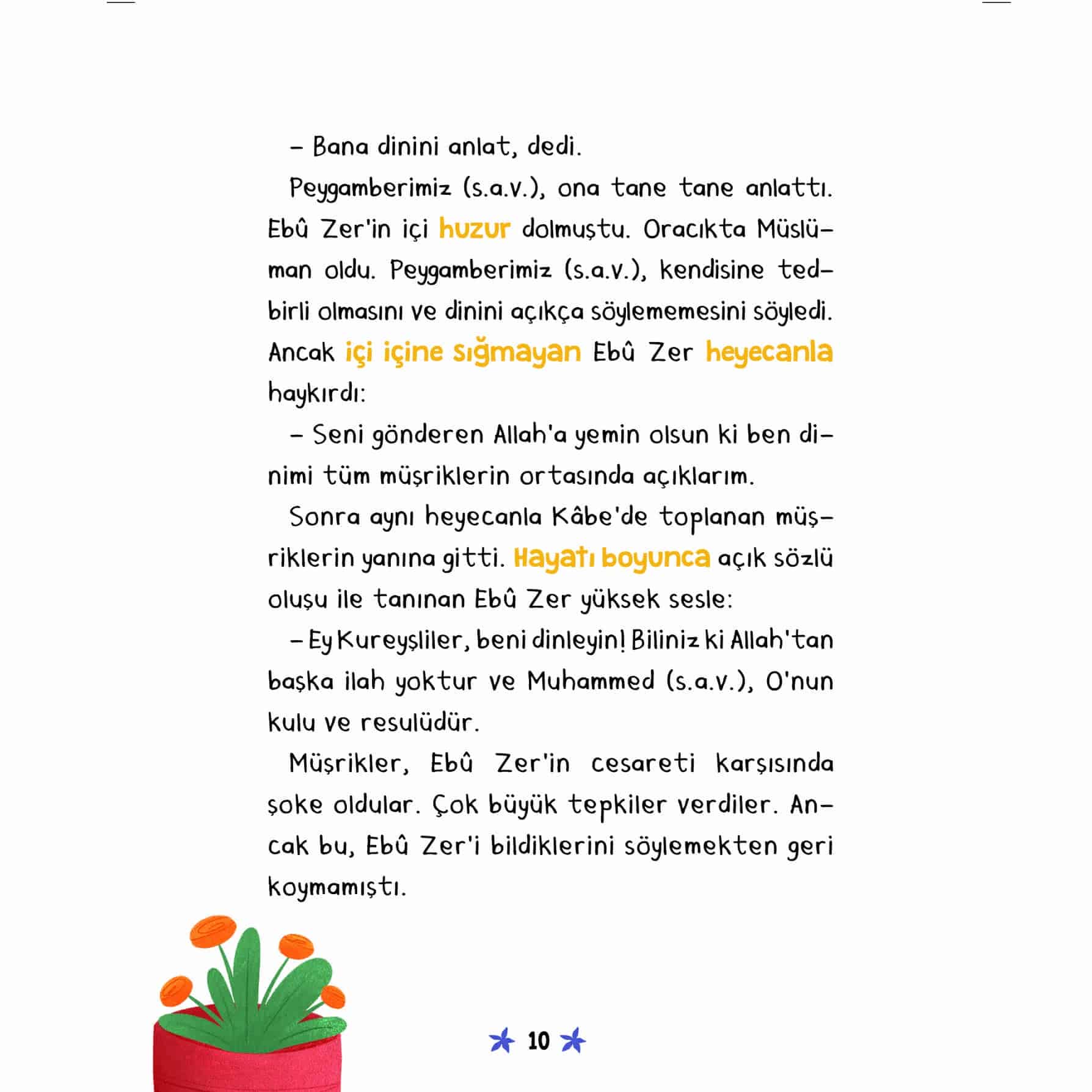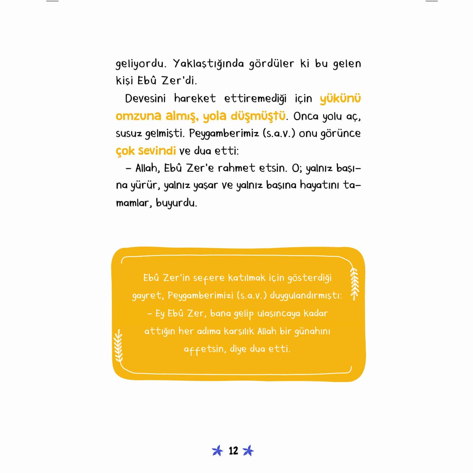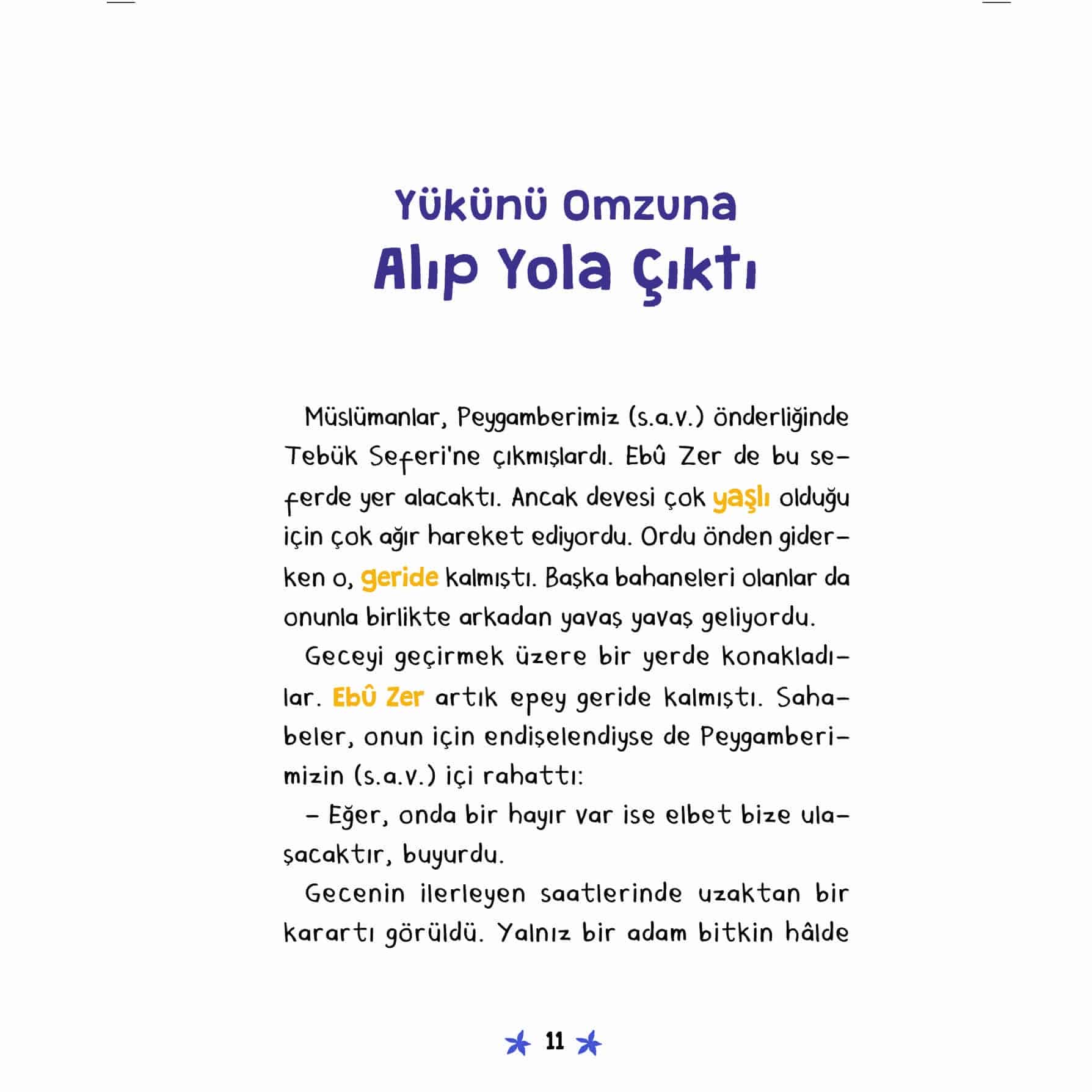Peygamberimizin (s.a.v.) arkadaşları bir yıldız gibi yolumuzu aydınlatıp bize rehber oluyor. Bu kitapta; Ebu Zer Gıfari’den doğru sözlü olmayı, Abdullah bin Mesud’dan Allah’ın rahmetini ümit etmeyi, Esma binti Ebubekir’den kanaatkar olmayı, Üseyd bin Hudayr’dan yeteneklerini doğru kullanmayı öğreneceğiz.