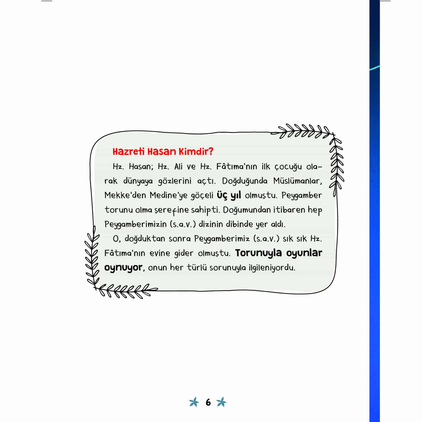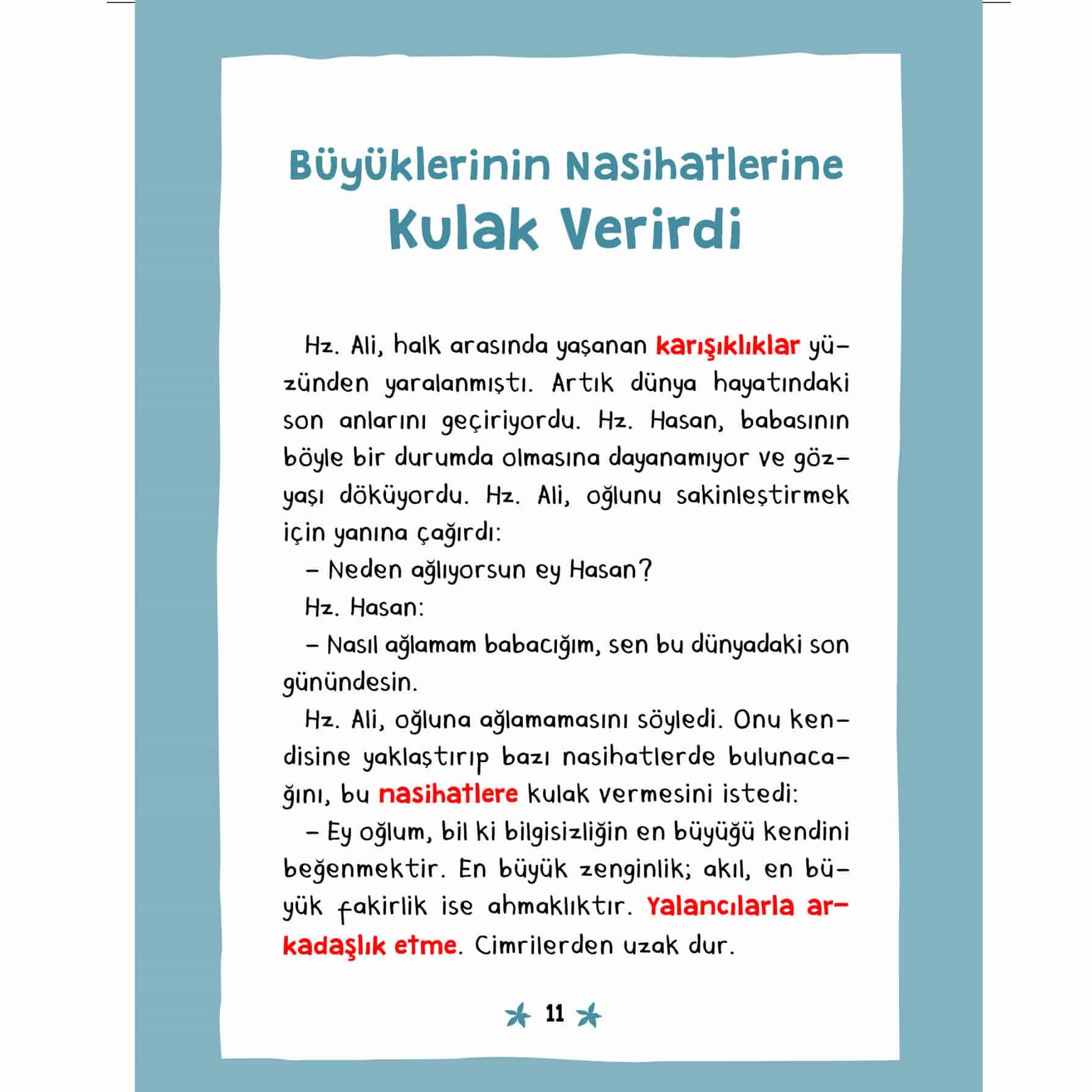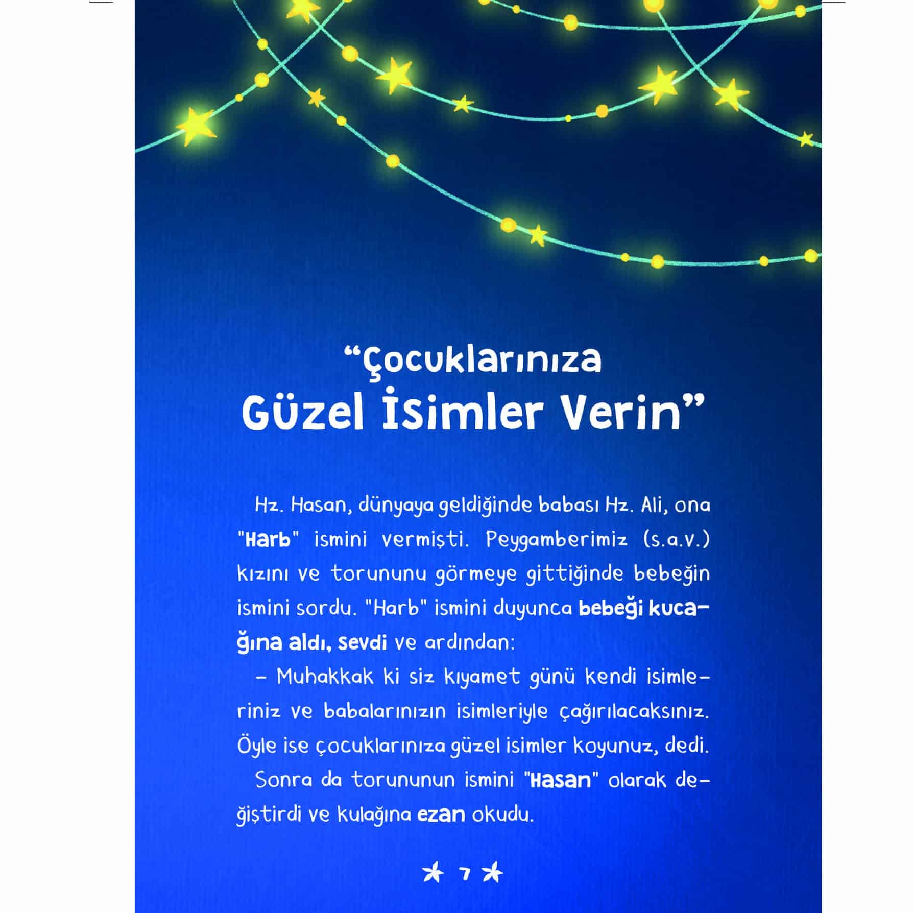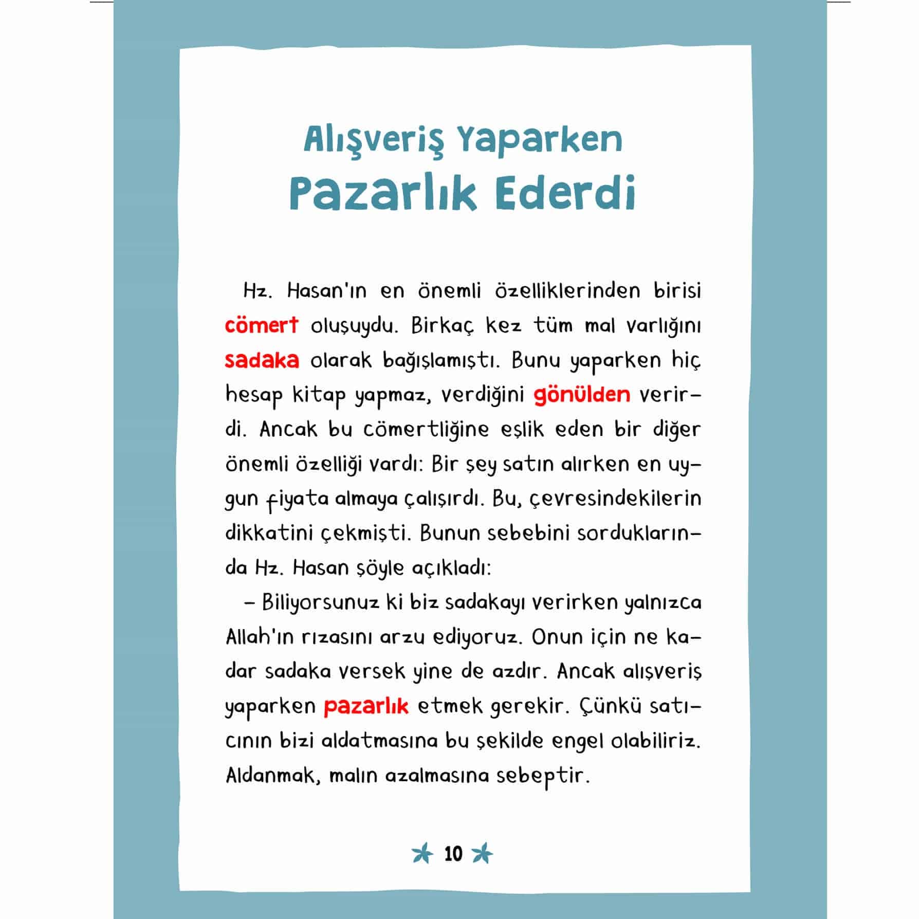 Peygamberimizin (s.a.v.) arkadaşları bir yıldız gibi yolumuzu aydınlatıp bize rehber oluyor. Bu kitapta; Hz. Hasan’dan fedakarlık yapmayı, Hz. Hüseyin’den hatayı yüze vurmamayı, Abdullah bin Ömer’den bilmediği konuyu konuşmamayı, Amr bin As’dan yanlışa engel olmayı öğreneceğiz.
