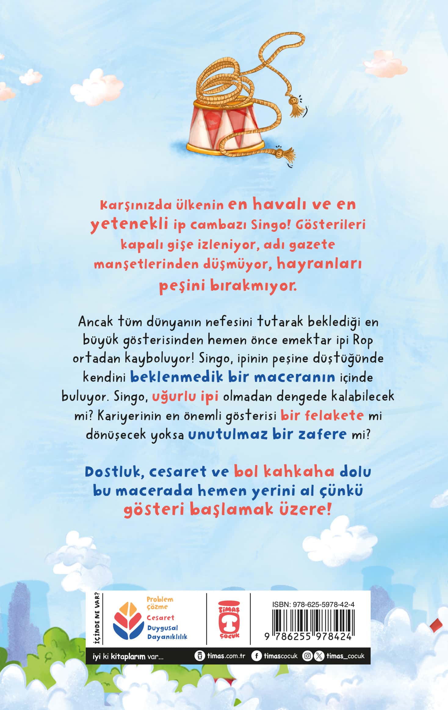 Karşınızda ülkenin en havalı ve en yetenekli ip cambazı Singo! Gösterileri kapalı gişe izleniyor, adı gazete manşetlerinden düşmüyor, hayranları peşini bırakmıyor. Ancak tüm dünyanın nefesini tutarak beklediği en büyük gösterisinden hemen önce emektar ipi Rop ortadan kayboluyor! Singo, ipinin peşine düştüğünde kendini beklenmedik bir maceranın içinde buluyor. Singo, uğurlu ipi olmadan dengede kalabilecek mi? Kariyerinin en önemli gösterisi bir felakete mi dönüşecek yoksa unutulmaz bir zafere mi? Dostluk, cesaret ve bol kahkaha dolu bu macerada hemen yerini al çünkü gösteri başlamak üzere!