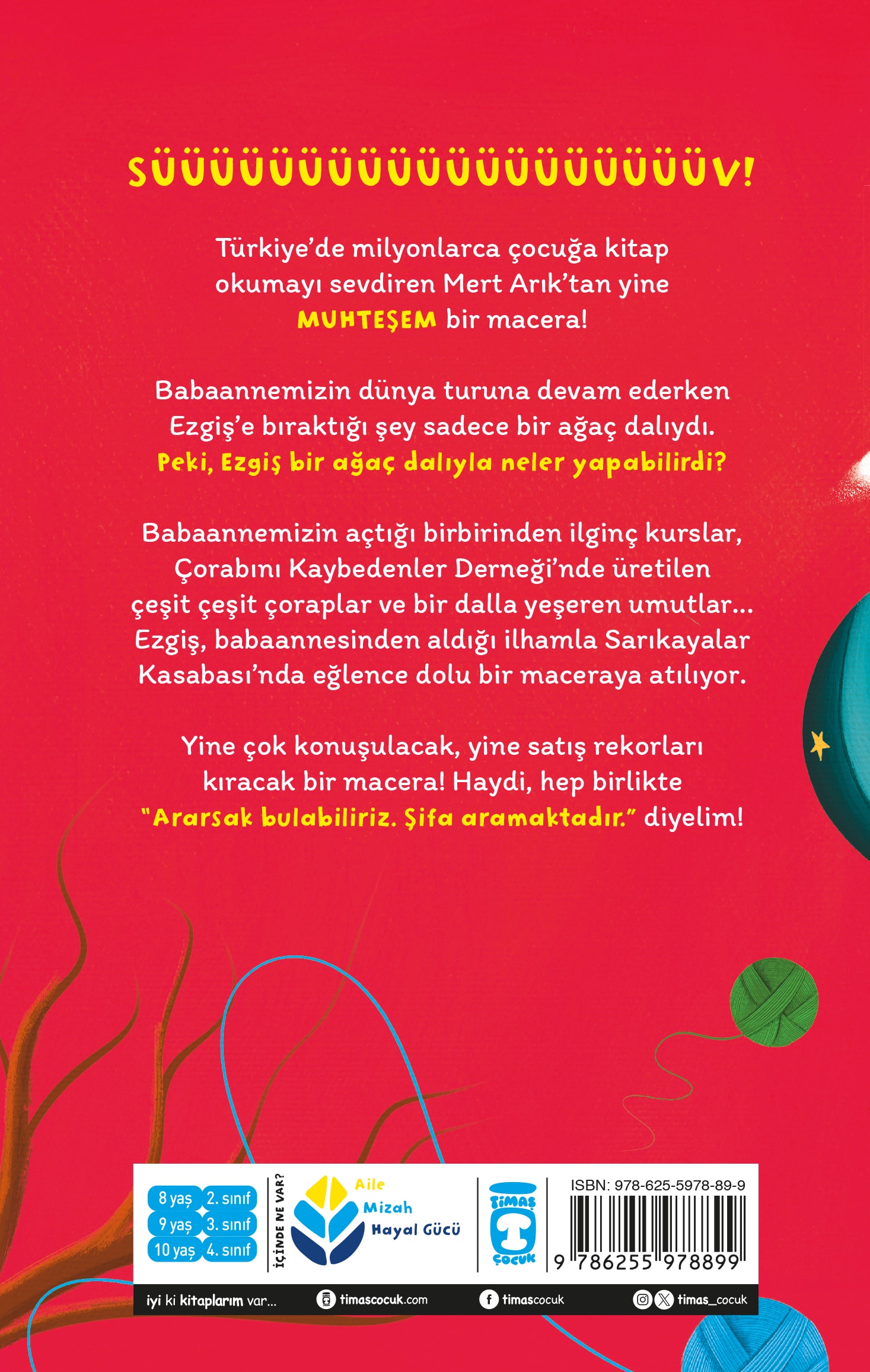 SÜÜÜÜÜÜÜÜÜÜÜÜÜÜÜÜÜÜÜV!Türkiye’de milyonlarca çocuğa kitap okumayı sevdiren Mert Arık'tan yine MUHTEŞEM bir macera!Babaannemizin dünya turuna devam ederken Ezgiş'e bıraktığı şey sadece bir ağaç dalıydı. Peki, Ezgiş bir ağaç dalıyla neler yapabilirdi?Babaannemizin açtığı birbirinden ilginç kurslar, Çorabını Kaybedenler Derneği’nde üretilen çeşit çeşit çoraplar ve bir dalla yeşeren umutlar... Ezgiş, babaannesinden aldığı ilhamla Sarıkayalar Kasabası'nda eğlence dolu bir maceraya atılıyor.Yine çok konuşulacak, yine satış rekorları kıracak bir macera! Haydi, hep birlikte "Ararsak bulabiliriz. Şifa aramaktadır.” diyelim!
