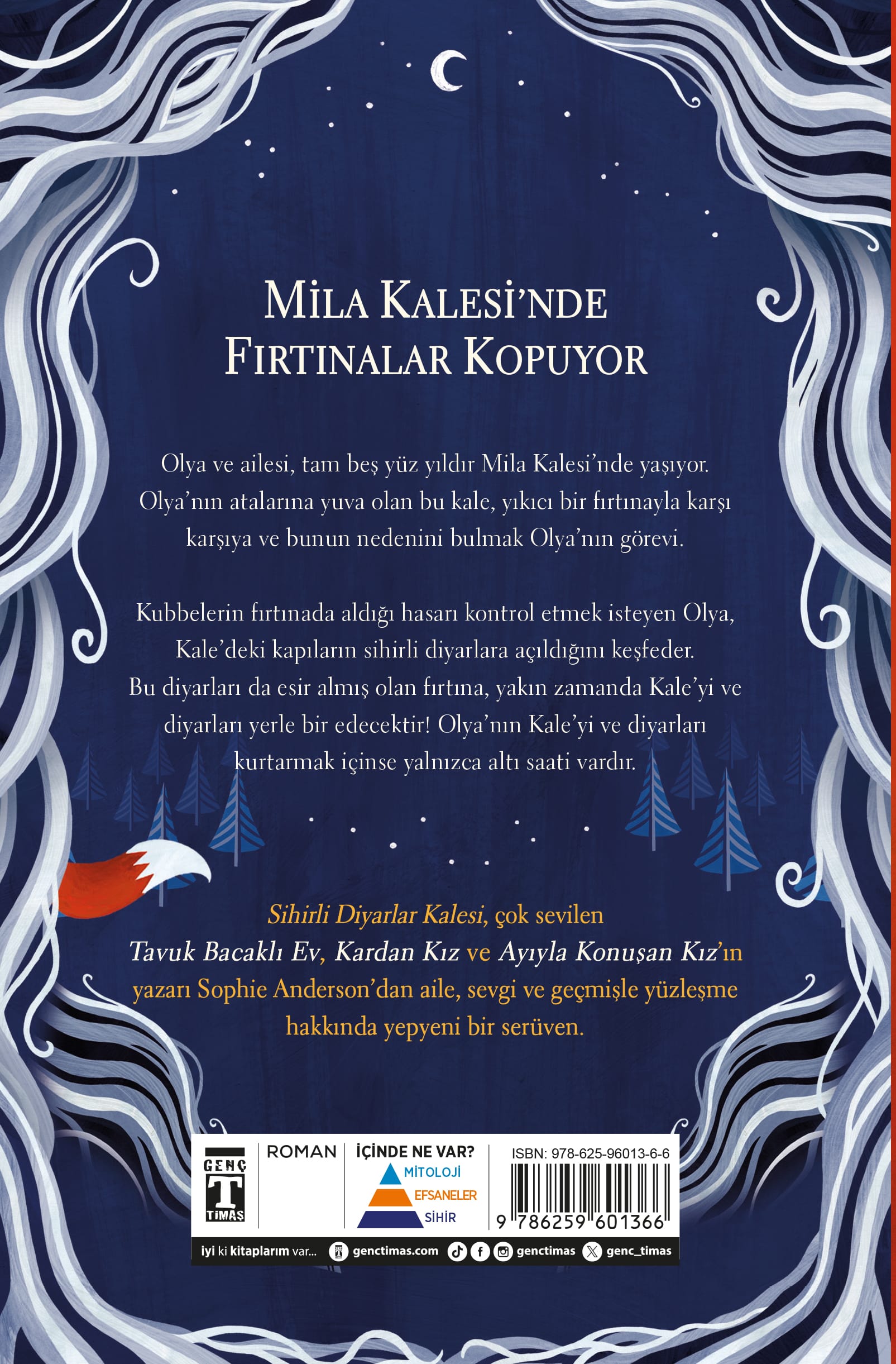 MİLA KALESİ’NDE FIRTINALAR KOPUYOR Olya ve ailesi, tam beş yüz yıldır Mila Kalesi’nde yaşıyor. Olya’nın atalarına yuva olan bu kale, yıkıcı bir fırtınayla karşı karşıya ve bunun nedenini bulmak Olya’nın görevi.Kubbelerin fırtınada aldığı hasarı kontrol etmek isteyen Olya, Kale’deki kapıların sihirli diyarlara açıldığını keşfeder. Bu diyarları da esir almış olan fırtına, yakın zamanda Kale’yi ve diyarları yerle bir edecektir! Olya’nın Kale’yi ve diyarları kurtarmak içinse yalnızca altı saati vardır.Sihirli Diyarlar Kalesi, çok sevilen Tavuk Bacaklı Ev, Kardan Kız ve Ayıyla Konuşan Kız’ın yazarı Sophie Anderson’dan aile, sevgi ve geçmişle yüzleşme hakkında yepyeni bir serüven.