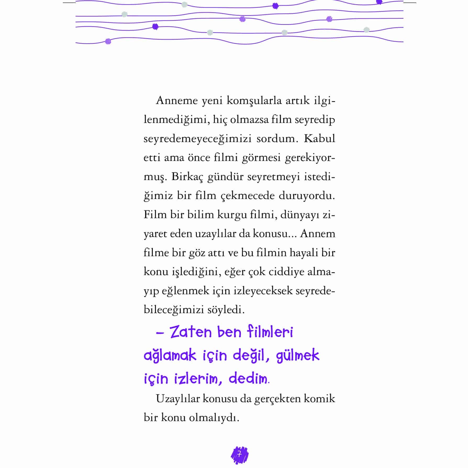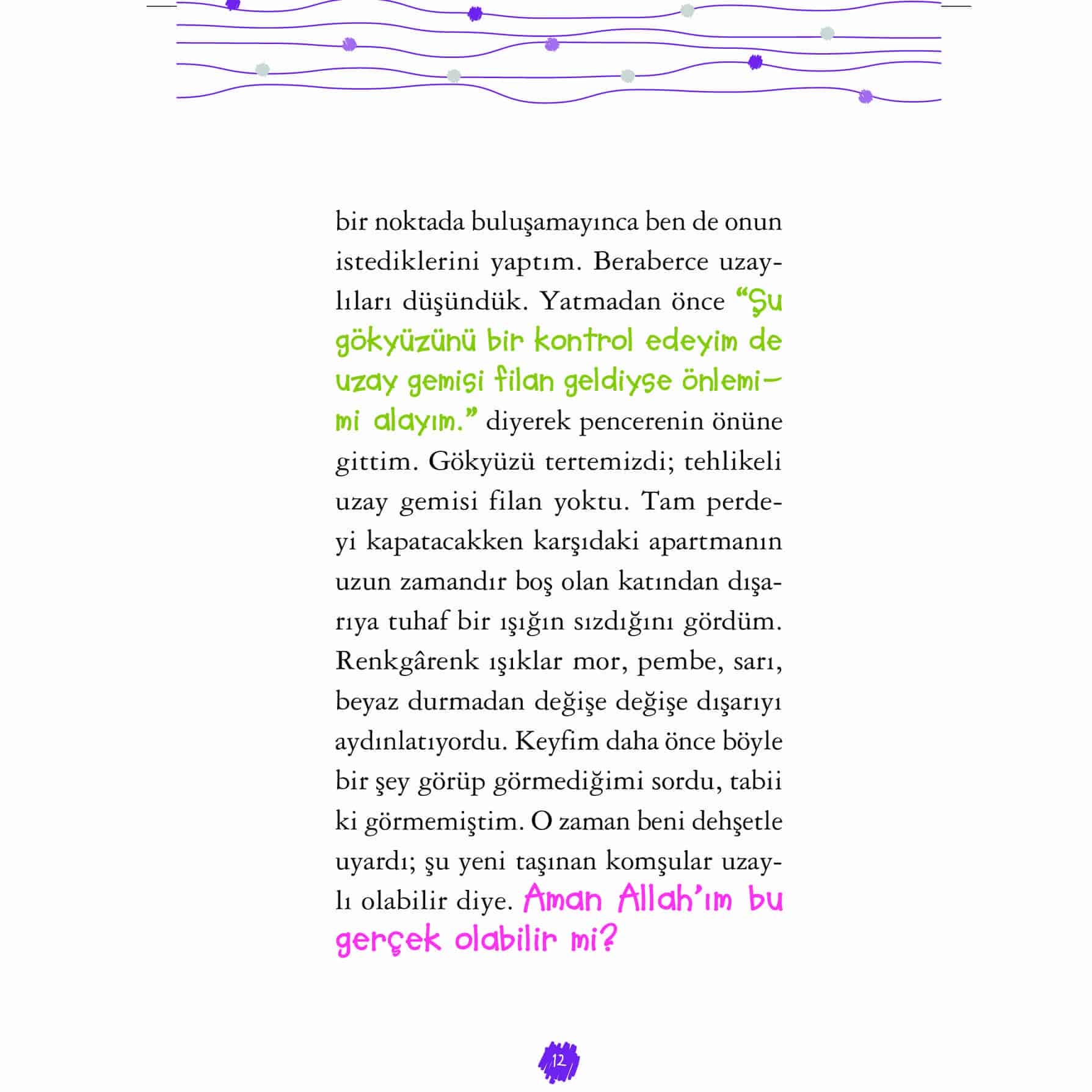 “Pencere içinde gördüğüm kabloyu takip etmeye başladım ve iki saniye sonra da ona bağlı vericiyi buluverdim. Vericinin üzeri acayip bilgilerle doluydu. Ayrıca dijital ekranında güneş resmi vardı. Demek ki uzay gemileri güneşe yakın bir yerlerde saklanıyordu. Ayrıca 8 rakamı da kocaman yazılmıştı ve ekranın neredeyse yarısını kaplıyordu. Başka rakamlar da vardı ama benim onları incelemek yerine önce bu aleti arkadaşlarıma atmam gerekiyordu.” Uzaylılar dünyayı istila etmeye kalkarsa, Şirin buna müsaade eder mi? O ve arkadaşları, kötü kalpli uzaylılara engel olmak için ellerinden geleni yapıyorlar. Tabii bu arada önlerine çıkan her filmi izlememeleri gerektiğini de öğreniyorlar!