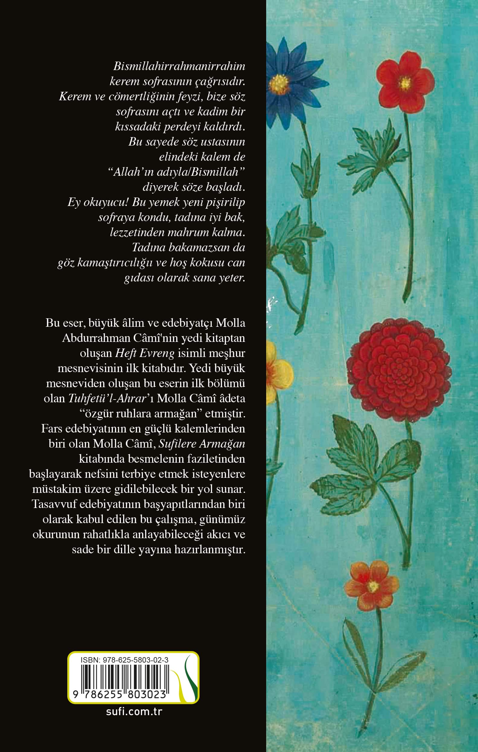 Bismillahirrahmanirrahim kerem sofrasının çağrısıdır. Kerem ve cömertliğinin feyzi, bize söz sofrasını açtı ve kadim bir kıssadaki perdeyi kaldırdı. Bu sayede söz ustasının elindeki kalem de “Allah’ın adıyla/ Bismillah” diyerek söze başladı. Ey okuyucu! Bu yemek yeni pişirilip sofraya kondu, tadına iyi bak, lezzetinden mahrum kalma. Tadına bakamazsan da göz kamaştırıcılığıı ve hoş kokusu can gıdası olarak sana yeter. Bu eser, büyük âlim ve edebiyatçı Molla Abdurrahman Câmî'nin yedi kitaptan oluşan Heft Evreng isimli meşhur mesnevisinin ilk kitabıdır. Yedi büyük mesneviden oluşan bu eserin ilk bölümü olan Tuhfetü’l-Ahrar’ı Molla Câmî âdeta “özgür ruhlara armağan” etmiştir. Fars edebiyatının en güçlü kalemlerinden biri olan Molla Câmî, Sufilere Armağan kitabında besmelenin faziletinden başlayarak nefsini terbiye etmek isteyenlere müstakim üzere gidilebilecek bir yol sunar. Tasavvuf edebiyatının başyapıtlarından biri olarak kabul edilen bu çalışma, günümüz okurunun anlayacağı sade ve akıcı bir dille yayına hazırlanmıştır.