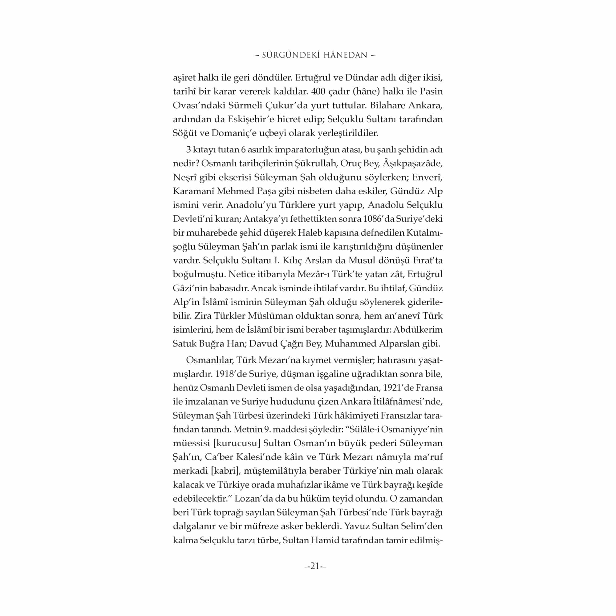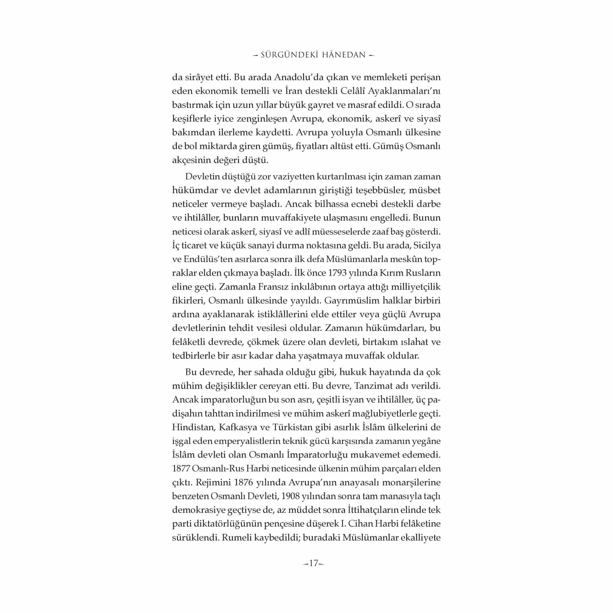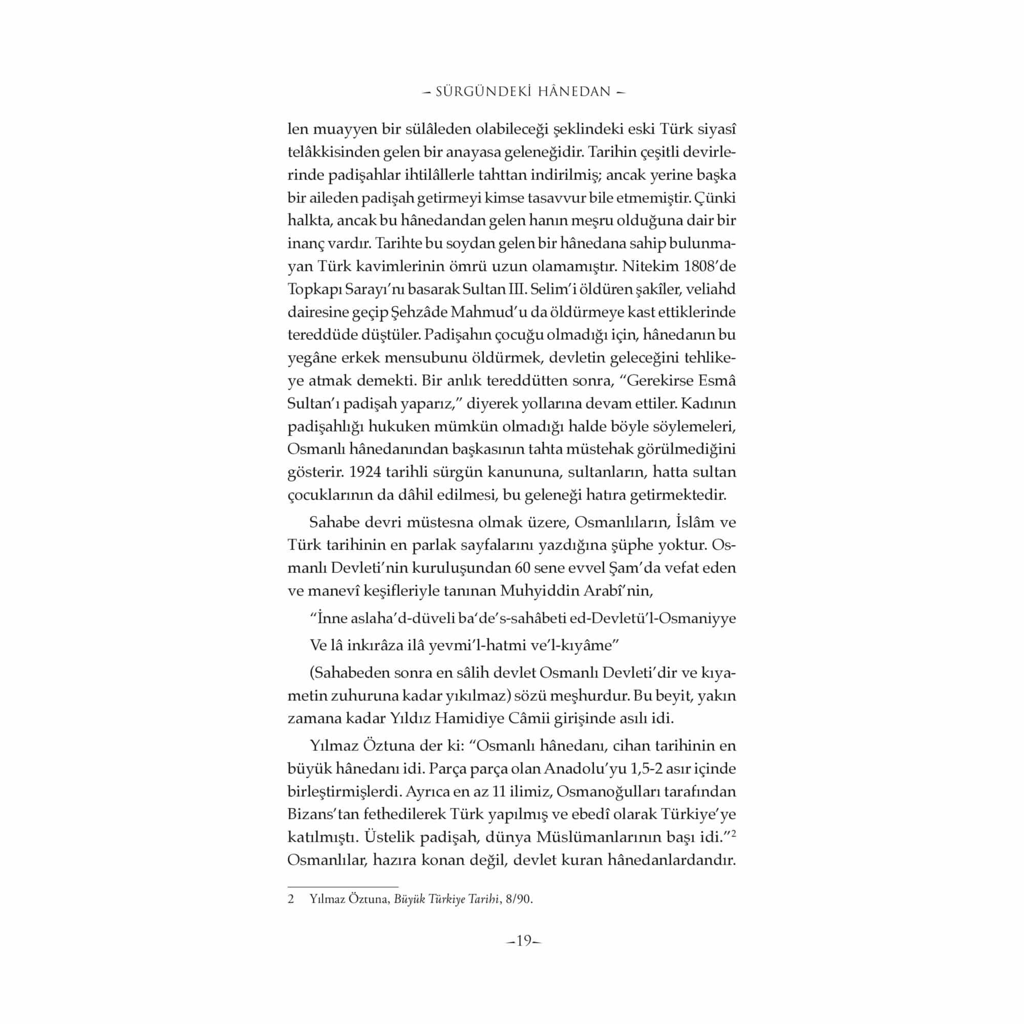“Bir gece çamaşırlarımızı dahi alamadan bu memleketten nasıl kovulduğumuzu düşündükçe fena olurum. İnsan hizmetçisini bile kovarken eşyalarını almasına müsaade eder. 600 senelik bir ailenin bu memlekette hiç mi hakkı yoktu? Osmanlı hânedanına mensup kızlar ve kadınlar, atıldıkları Avrupa memleketlerinin kendilerine yabancı olan şehirlerinde açlıktan kıvrandılar, süründüler; fakat namuslarından asla fedakârlık etmediler.” Şehzâde Selim Efendi’nin kızı Emine Nemîka Sultan 3 Mart 1924 itibarıyla Türk-İslâm tarihinde yeni bir sayfa açıldı. Müslümanların en eski müessesesi olan halifelik kaldırıldı; ayrıca tarihin en uzun ömürlü hânedanlarından Osmanlı ailesinin takriben 200 ferdi, vatandaşlıktan çıkarılarak vatan toprakları dışına sürüldü. Bu, yaşlısından beşikteki bebeğe kadar hepsi için sıkıntılı bir hayatın başlangıcı oldu. Hemen hepsi sürgünde vatansız, pasaportsuz olarak yaşadı. Bankalarda paraları, yanlarında nakitleri ve yurt dışında akrabaları olmayan bu insanların çoğu tarifsiz acılar çekti. İlaç parası bulamadığı için dilenenler; konu komşunun getirdiği bir tas çorba ile yaşayanlar; açlıktan ölenler; sefalet sebebiyle intihar edenler; aklını kaçıranlar; kimsesizler mezarlığına gömülenler oldu. Ama her zaman asalet ve şereflerine uygun yaşamaya çalıştılar. Tarihin en eski hânedanlarından Osmanlı ailesi, siyaset sahnesinden böylece çekilmiş oldu. 1952 yılında hânedanın hanımlarına, 1974 yılında da erkeklerine memlekete dönme izni verildi. Ancak iyi-kötü yurt dışında bir hayat kuran insanların, çoğunun geri dönme imkân ve ihtimali kalmadıktan sonra… Osmanlı Tarihi’ne dair yazdığı yazılar ve yaptığı televizyon programlarıyla tanınan hukuk tarihçisi Ekrem Buğra Ekinci Sürgündeki Hânedan kitabıyla Osmanlı İmparatorluğu’nun son vârisleri hakkında literatürde benzeri bulunmayan bir monografi hazırladı. Hânedanın tüm üyelerinin sürgünde neler yaşadığını kendi anlatımlarıyla dinlemeye hazır mısınız?