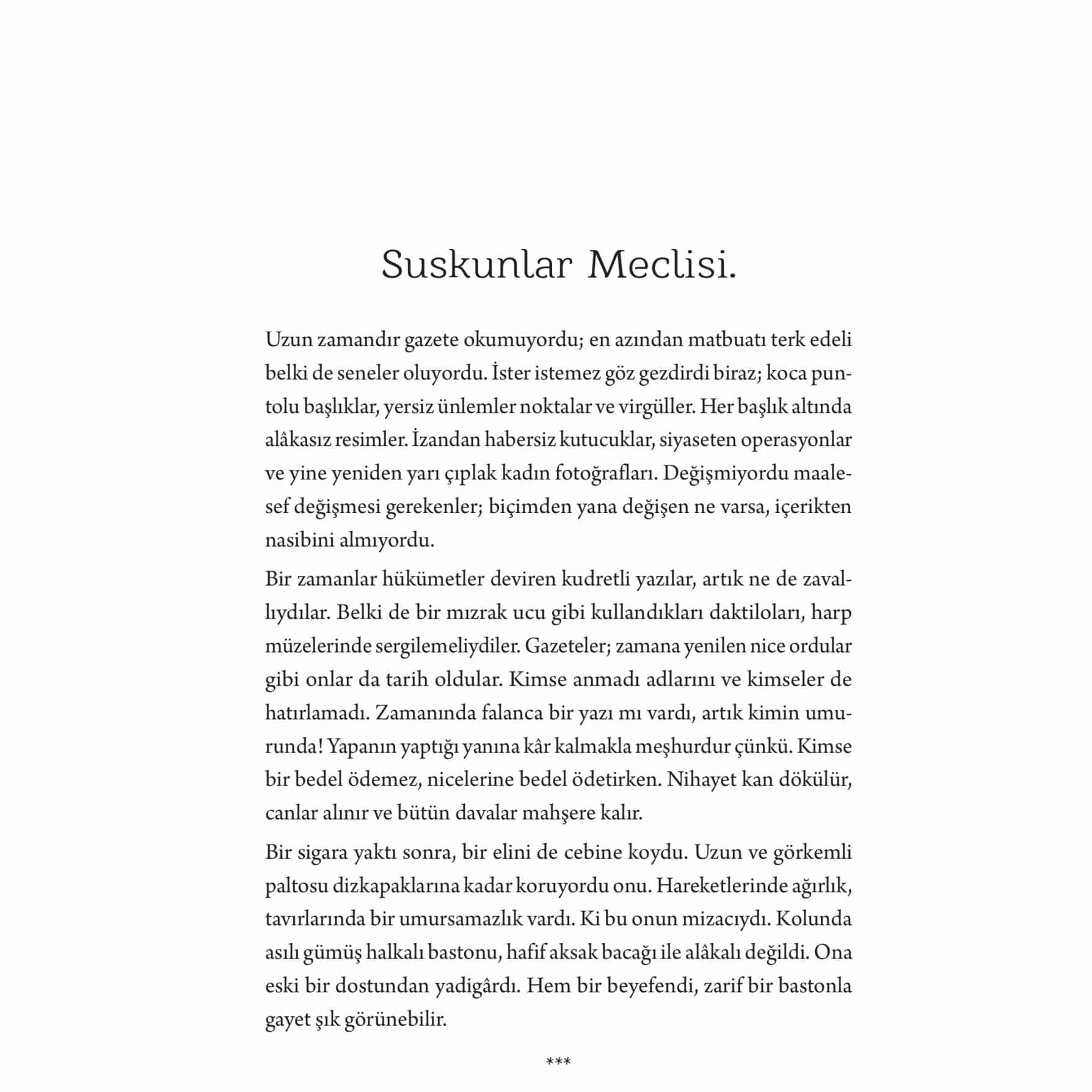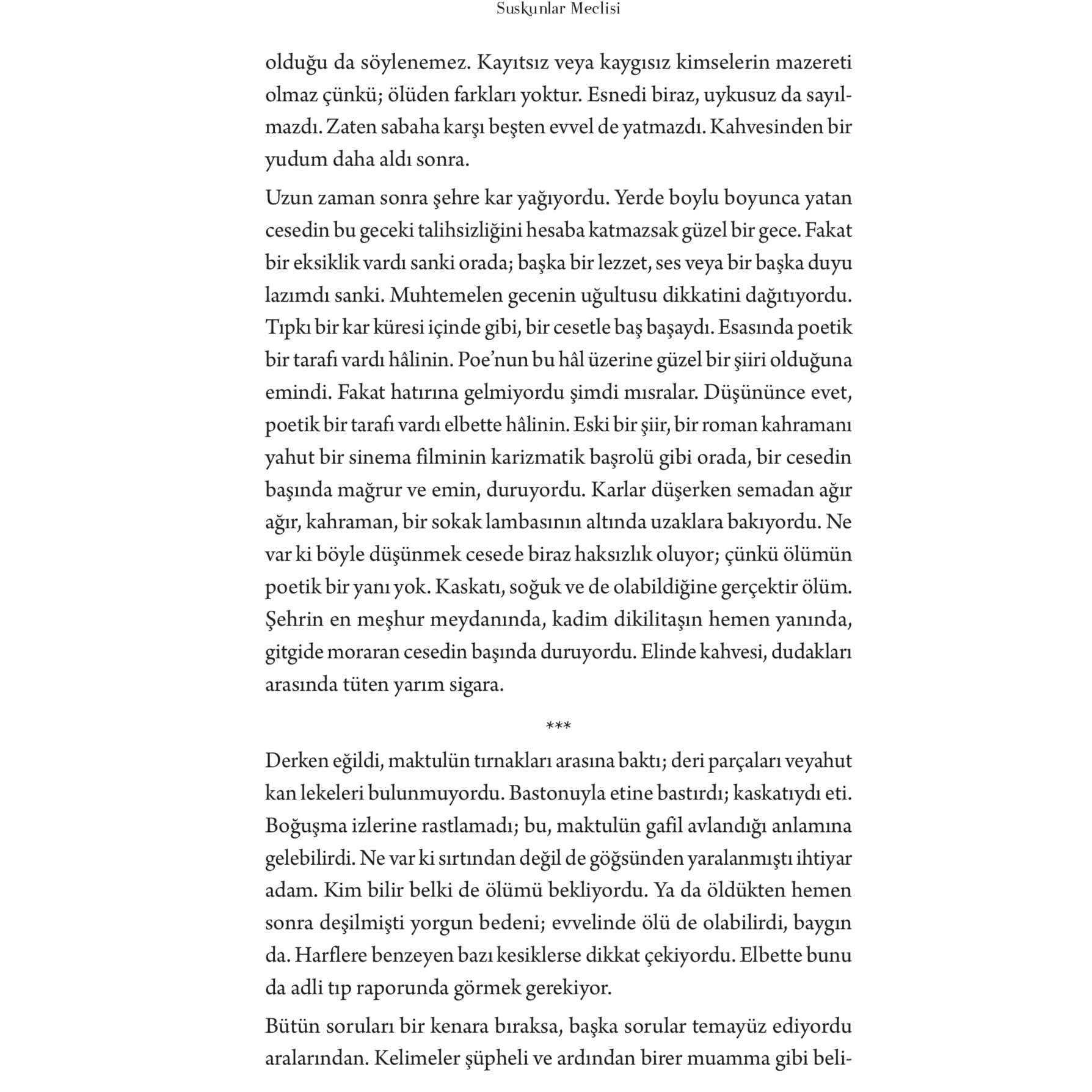 İstanbul’un kalbinde, Sultanahmet Meydanı’nda başlayan bir cinayet, dedektif Eşref Kalender'i karanlık ve karmaşık bir dünyanın içine sürükler. Yaşlı ayakkabı tamircisi Nahit Söylemez’in cesedi üzerindeki garip bir bıçak yarasıyla kazınmış Latince söz dikkat çeker: Acta est fabula, yani oyun bitti! Eşref Kalender’in ulaştığı birtakım izler, onu “Suskunlar Meclisi” adında gizemli bir tarikatın varlığını keşfetmeye götürür. Arkası kesilmeyen cinayetlerin sonunda Kalender kendisini büyük bir komplonun tam ortasında bulur. İşkenceler, kaçışlar ve uluslararası bir kovalamaca... Güvenecek kimsesi yoktur. Peki, Eşref Kalender bu karanlık labirentten çıkabilecek mi? Suskunlar Meclisi’nin sırları açığa çıkacak mı? Hermes’in ilmi şeytanlardan kaçırılabilecek mi? Ve en önemlisi, hakikat galip gelebilecek mi? Cihan Çetinkaya, Suskunlar Meclisi romanıyla gizemli bir dünyanın kapılarını şiirsel üslubuyla aralıyor. Sürükleyici bir polisiye hikâye, mitolojiyle kurulmuş gizemle birlikte çok katmanlı bir hâl alıyor. Ezoterizm ve okültizmin doruklarına kadar hissedildiği bu yapıt, aynı zaman felsefi sorgulamalarla bir boyut daha inşa ediyor.