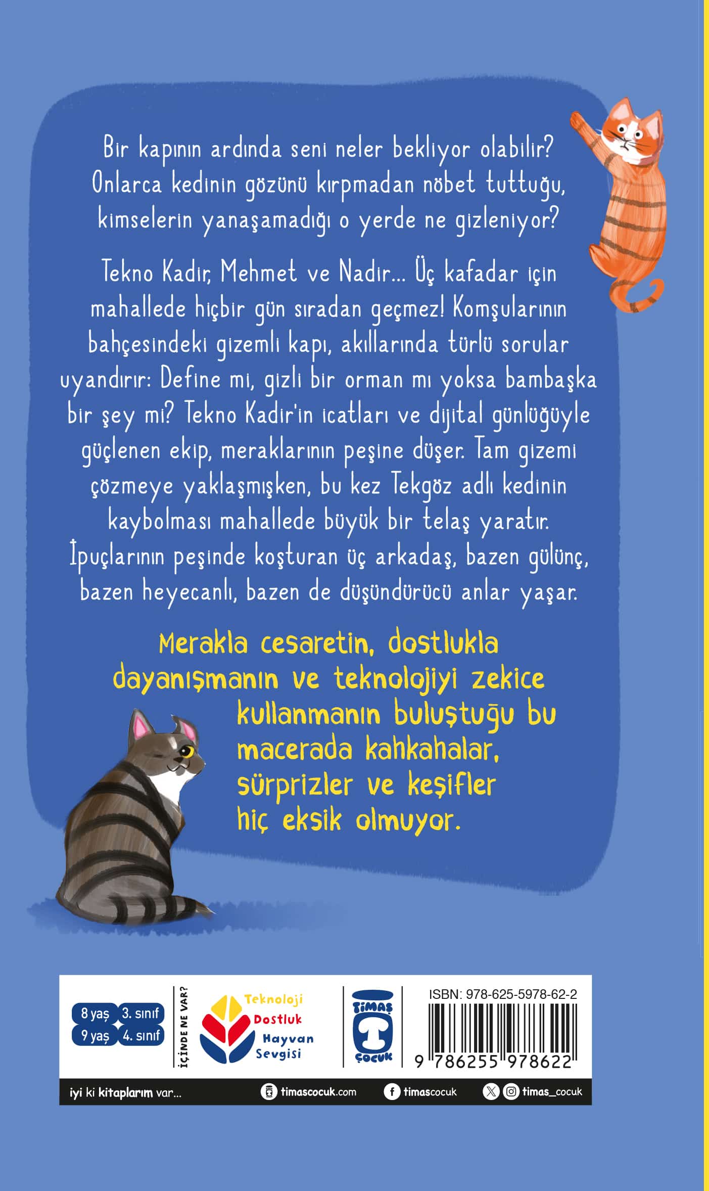 Bir kapının ardında seni neler bekliyor olabilir? Onlarca kedinin gözünü kırpmadan nöbet tuttuğu, kimselerin yanaşamadığı o yerde ne gizleniyor?Tekno Kadir, Mehmet ve Nadir… Üç kafadar için mahallede hiçbir gün sıradan geçmez! Komşularının bahçesindeki gizemli kapı, akıllarında türlü sorular uyandırır: Define mi, gizli bir orman mı yoksa bambaşka bir şey mi? Tekno Kadir'in icatları ve dijital günlüğüyle güçlenen ekip, meraklarının peşine düşer. Tam gizemi çözmeye yaklaşmışken, bu kez Tekgöz adlı kedinin kaybolması mahallede büyük bir telaş yaratır. İpuçlarının peşinde koşturan üç arkadaş, bazen gülünç, bazen heyecanlı, bazen de düşündürücü anlar yaşar. Merakla cesaretin, dostlukla dayanışmanın ve teknolojiyi zekice kullanmanın buluştuğu bu macerada kahkahalar, sürprizler ve keşifler hiç eksik olmuyor.