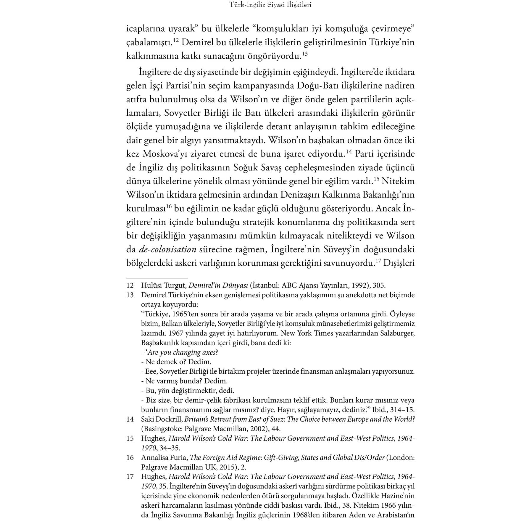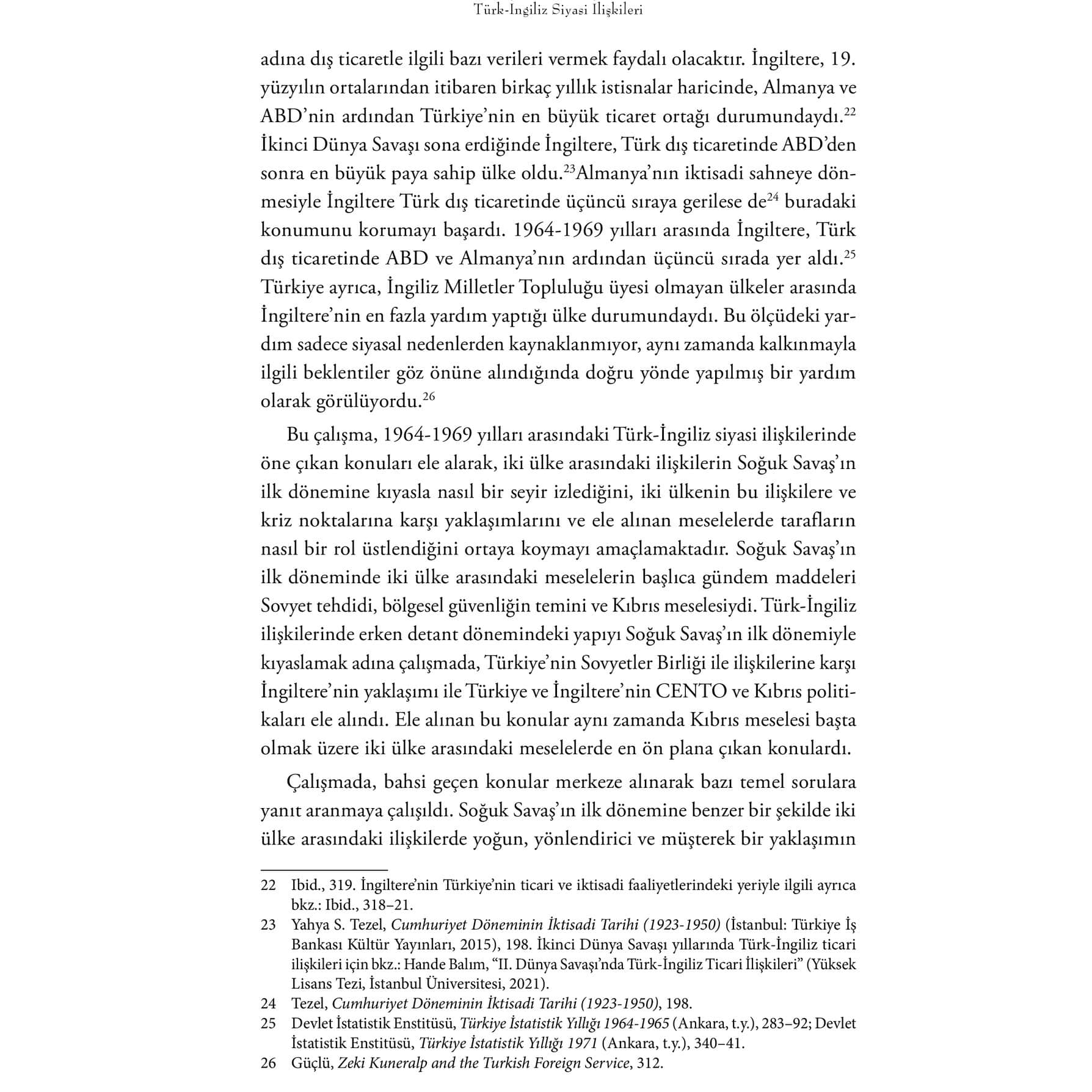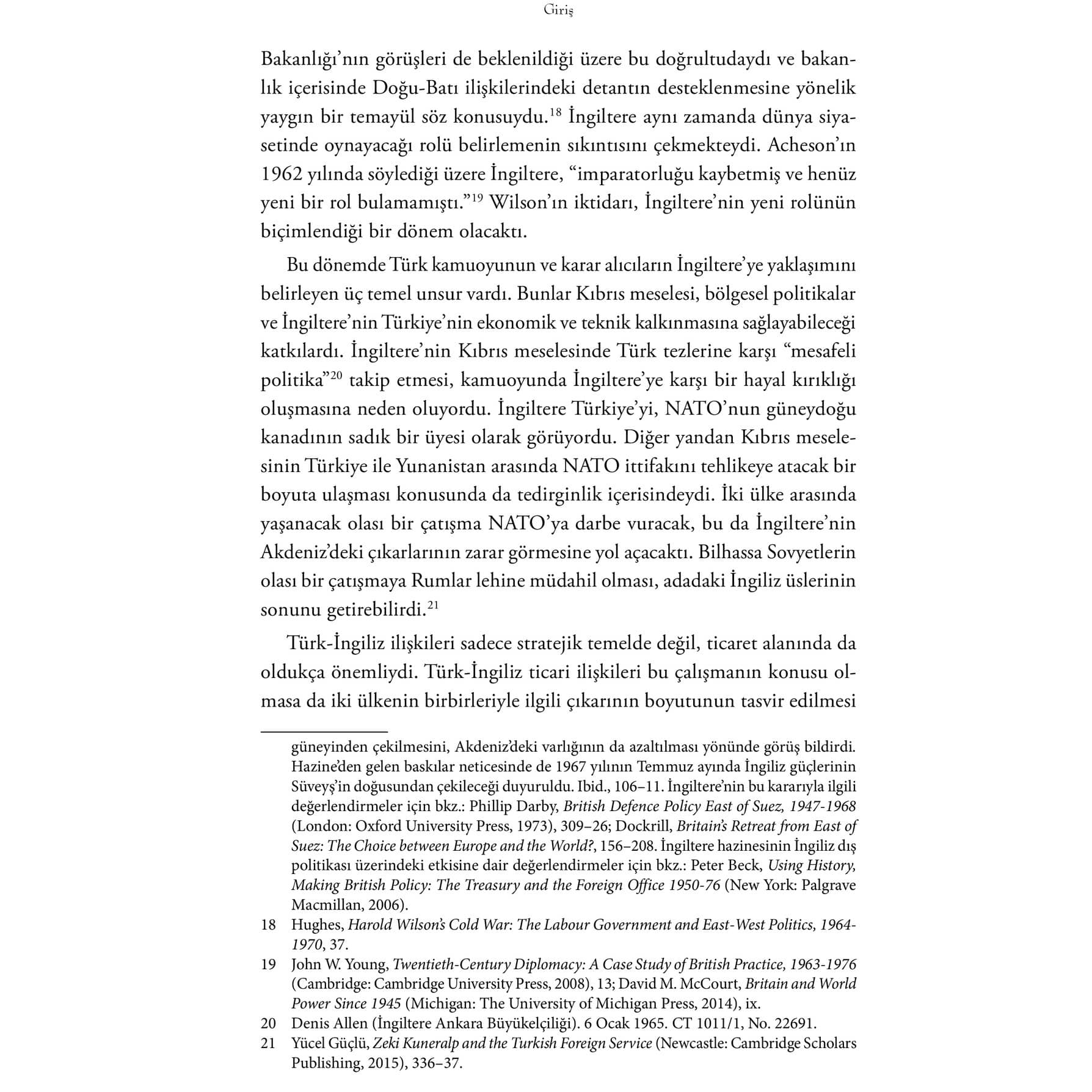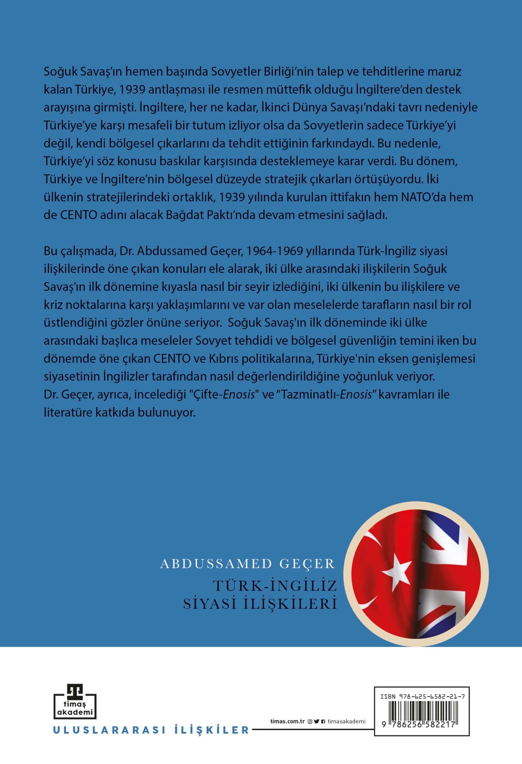 Soğuk Savaş’ın hemen başında Sovyetler Birliği’nin talep ve tehditlerine maruz kalan Türkiye, 1939 antlaşması ile resmen müttefik olduğu İngiltere’den destek arayışına girmişti. İngiltere, her ne kadar, İkinci Dünya Savaşı’ndaki tavrı nedeniyle Türkiye’ye karşı mesafeli bir tutum izliyor olsa da Sovyetlerin sadece Türkiye’yi değil, kendi bölgesel çıkarlarını da tehdit ettiğinin farkındaydı. Bu nedenle, Türkiye’yi söz konusu baskılar karşısında desteklemeye karar verdi. Bu dönem, Türkiye ve İngiltere’nin bölgesel düzeyde stratejik çıkarları örtüşüyordu. İki ülkenin stratejilerindeki ortaklık, 1939 yılında kurulan ittifakın hem NATO’da hem de CENTO adını alacak Bağdat Paktı’nda devam etmesini sağladı. Bu çalışmada, Dr. Abdussamed Geçer, 1964-1969 yıllarında Türk-İngiliz siyasi ilişkilerinde öne çıkan konuları ele alarak, iki ülke arasındaki ilişkilerin Soğuk Savaş’ın ilk dönemine kıyasla nasıl bir seyir izlediğini, iki ülkenin bu ilişkilere ve kriz noktalarına karşı yaklaşımlarını ve var olan meselelerde tarafların nasıl bir rol üstlendiğini gözler önüne seriyor. Soğuk Savaş'ın ilk döneminde iki ülke arasındaki başlıca meseleler Sovyet tehdidi ve bölgesel güvenliğin temini iken bu dönemde öne çıkan CENTO ve Kıbrıs politikalarına, Türkiye'nin eksen genişlemesi siyasetinin İngilizler tarafından nasıl değerlendirildiğine yoğunluk veriyor. Dr. Geçer, ayrıca, incelediği "Çifte-Enosis" ve “Tazminatlı-Enosis” kavramları ile literatüre katkıda bulunuyor.