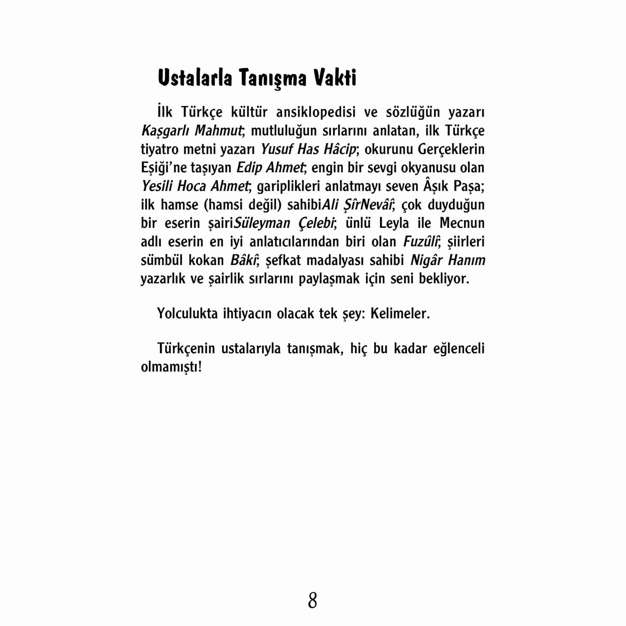Türkçenin Ustaları kitabı, konuştuğumuz dili daha iyi tanımamız, daha sağlıklı konuşmamız ve kökenlerine hâkim olmamız için büyük bir fırsat sunuyor. Dilimizi, Türkçeyi en iyi kullananların yaşam ve çalışma hikâyelerinden verilen örneklerinden okumak hem konuşma hem anlama hem de yazma yeteneğimize katkıda bulunacak. Kendimizi daha iyi ifade etme adına da önemli kazanımlara vesile olan kitap, okuma alışkanlığına da katkı sağlayacak. Türkçenin Ustaları aynı zamanda 4, 5, 6 ve 7. Sınıf Türkçe dersi müfredatını destekliyor.