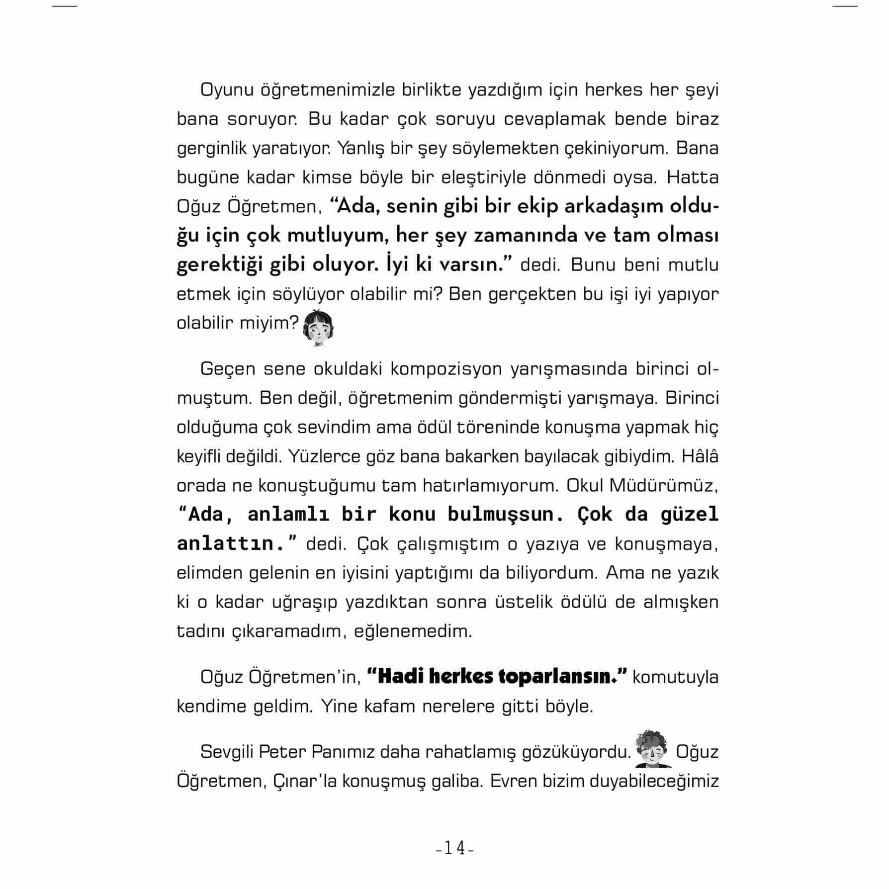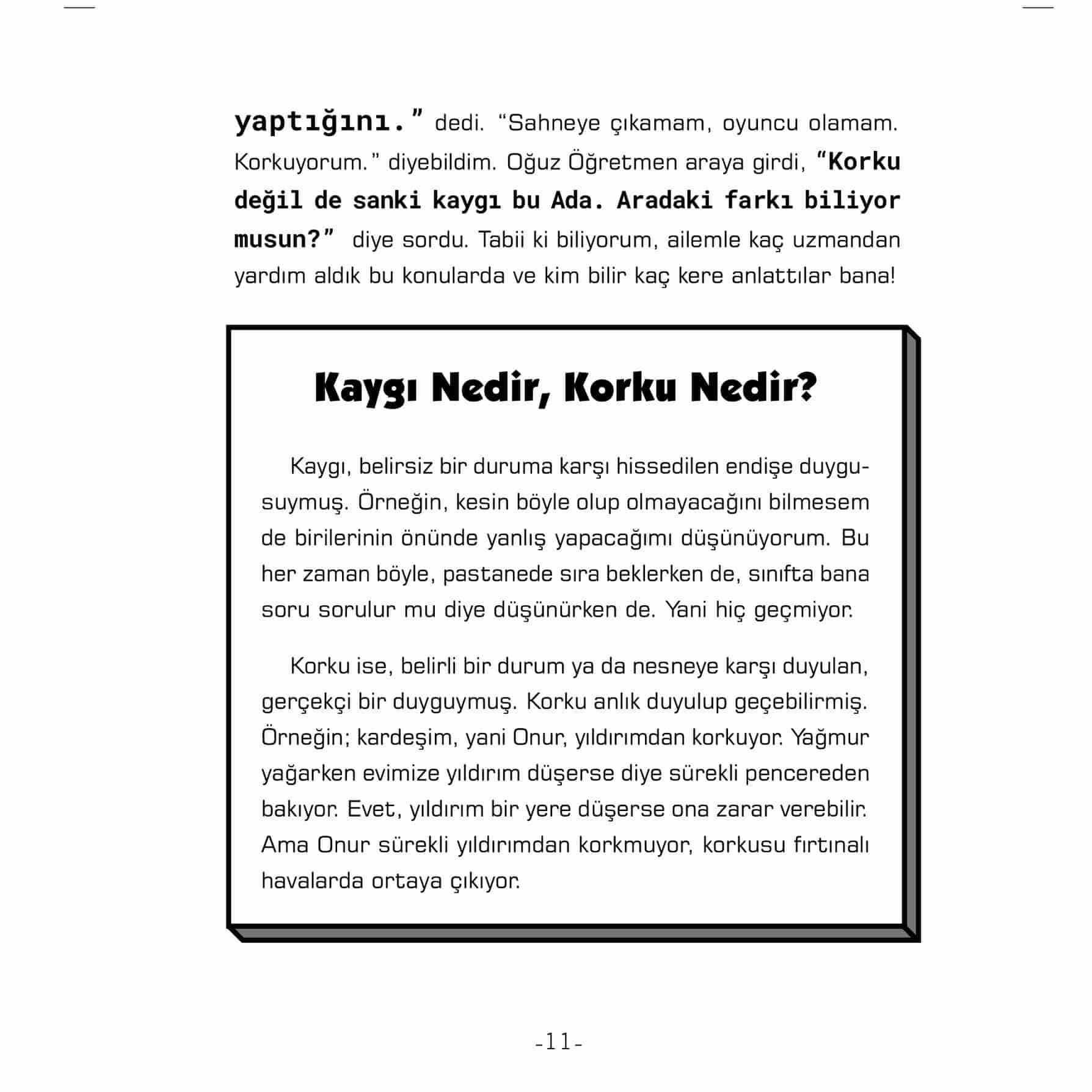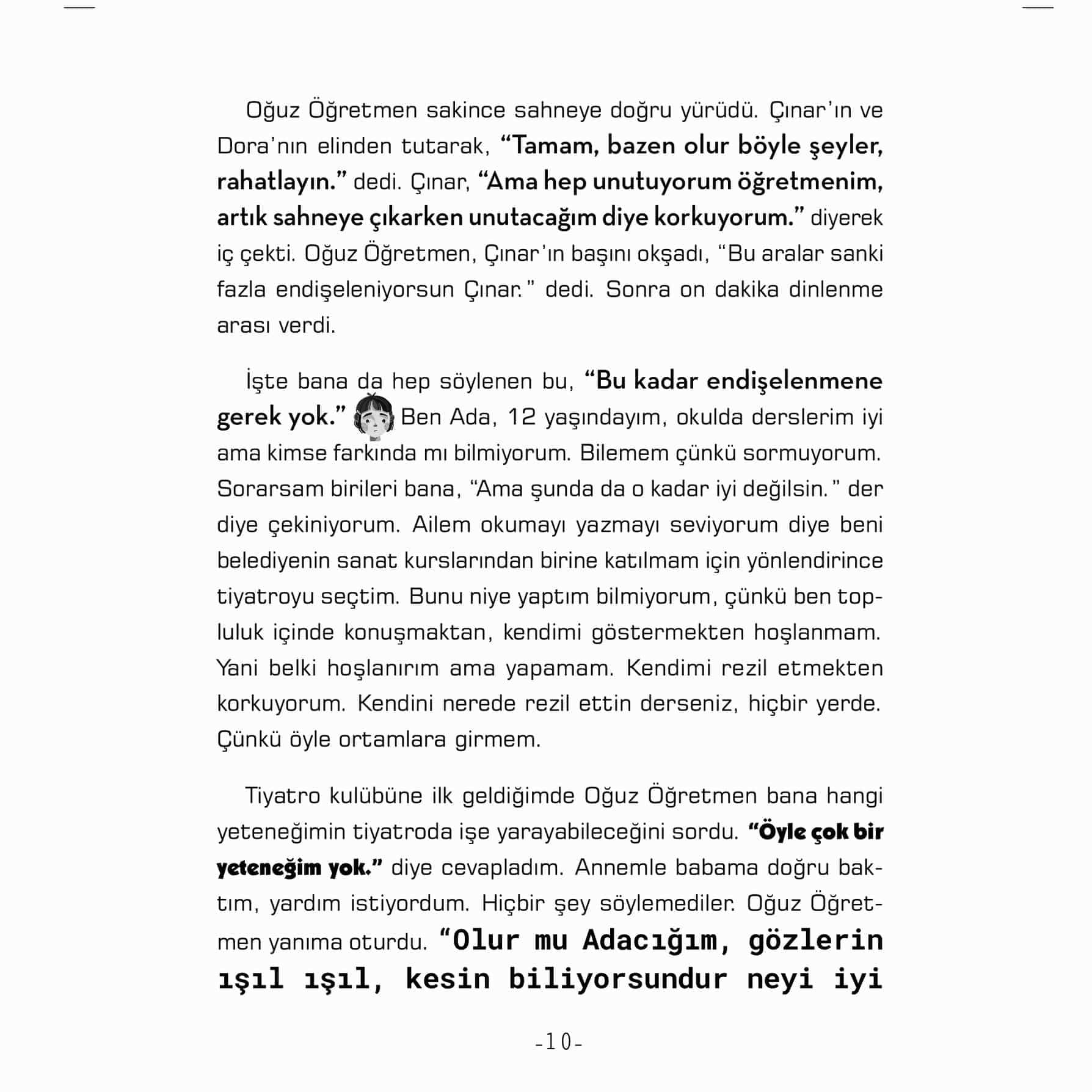 Merhaba arkadaşlar, ben Ada. 12 yaşındayım, okulda derslerim iyi ama kimse farkında mı bilmiyorum. Bilemem çünkü sormuyorum. Sorarsam birileri bana, “Ama şunda da o kadar iyi değilsin.” der diye çekiniyorum. Ailem okumayı yazmayı seviyorum diye beni belediyenin sanat kurslarından birine katılmam için yönlendirince tiyatroyu seçtim. Bunu niye yaptım bilmiyorum, çünkü ben topluluk içinde konuşmaktan, kendimi göstermekten hoşlanmam. Yani belki hoşlanırım ama yapamam, kaygılarım izin vermez. Kaygılı olmak ne demek, nasıl aşabiliriz merak ediyorsanız hikâyemi okuyun. Merhaba arkadaşlar, ben Çınar. Tiyatro kursunda “Peter Pan” oyununu oynamaya karar verdiğimiz gün hayatım değişti. Üstelik başroldeyim ve bu beni biraz kaygılandırıyor. Genelde bu durumlarda büyükler bana; “aman niye endişeleniyorsun”, “endişelenmene gerek" yok ya da "endişelenme, sen yaparsın” gibi şeyler derler. Sanki endişelenmek benim elimdeymiş, bir tek ben endişelenmemeyi beceremiyormuşum gibi hissediyorum. Kim ‘ya başaramazsam’ diye kaygılanmaz ki! Sizin de böyle kaygılarınız varsa hikâyemi anlatayım. Ufak Tefek Kaygılar’da çocukların gözünden kaygı ne demek, neler yaşatıyor, nasıl aşmaya çalışılıyor ve gerçek çözüm nerede sorularının cevabını bulacaksınız. Çocukların çocuklara kaygının nasıl yönetildiğini anlattığı bir ilk gençlik kitabı.