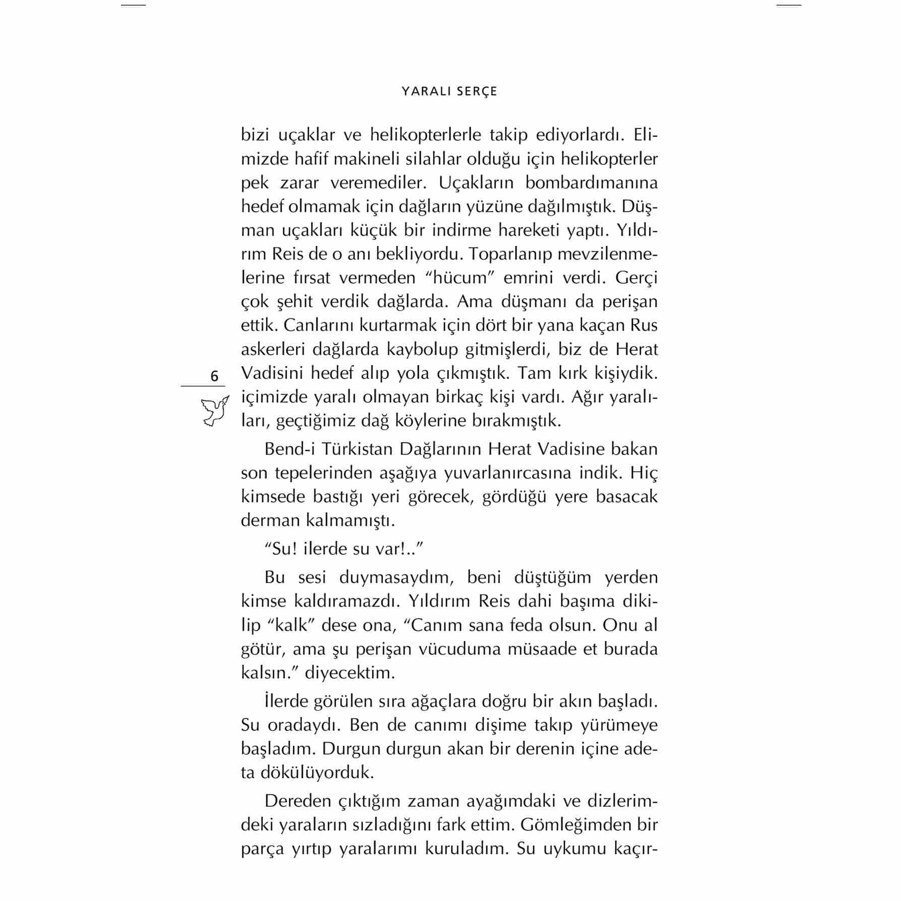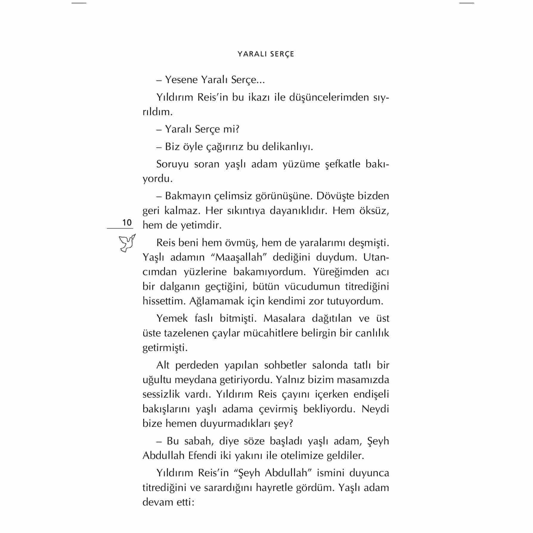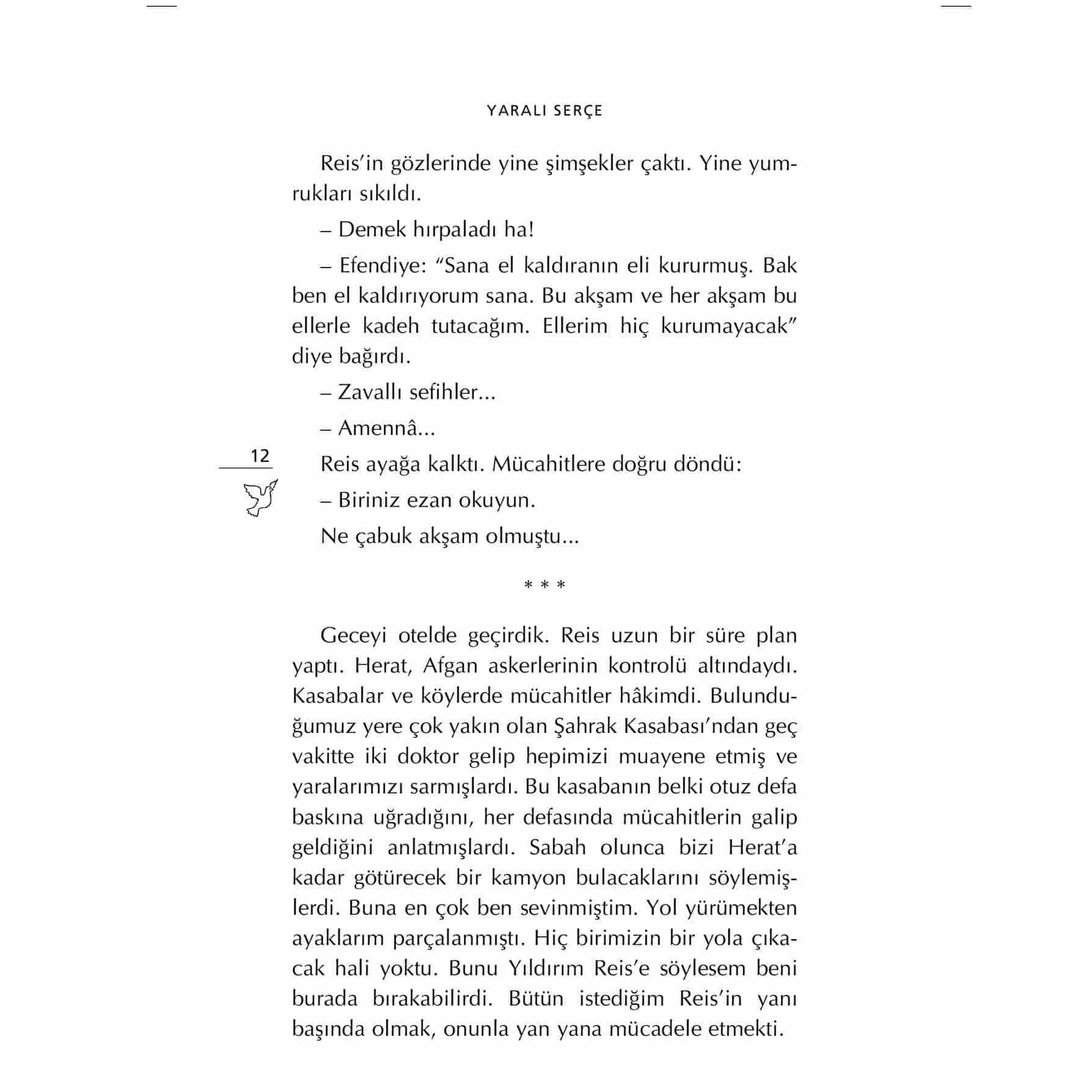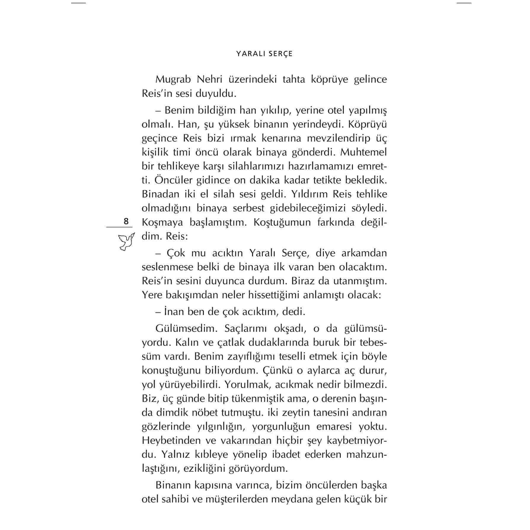Ay ışığında karlı dağların seyrine doyum olmaz. Gündüzleri güneş ısısıyla çözülen, yumuşayan kar, geceleri sertleşir ve buz tutar. Sivri tepeler bir ayna gibi ışıldar. Ay ışığında seyrine doyum olmaz bu dağların, ama sıcak bir evin penceresinden seyredebilirseniz... Sığınacak bir eviniz yoksa ve dağlarda kalmaya mecbursanız, çektiğiniz sıkıntılar size bu güzellikleri fark ettirmez.Yaralı Serçe, Yıldırım Reis ve beraberinde dağlarda bağımsızlık mücadelesi veren Kerim’in gösterdiği kahramanlıkların hikâyesi…