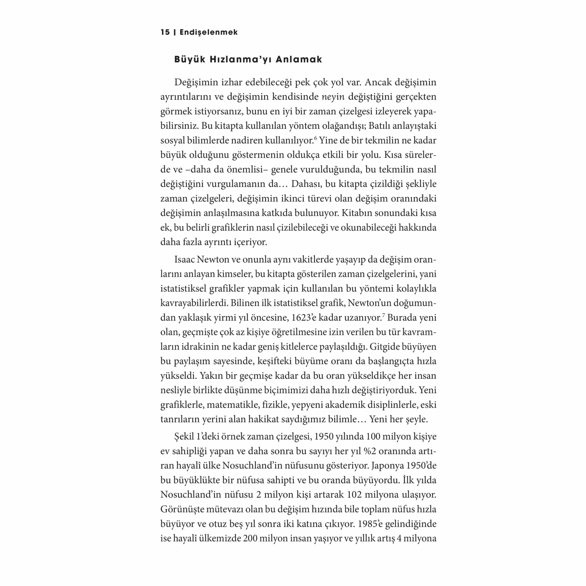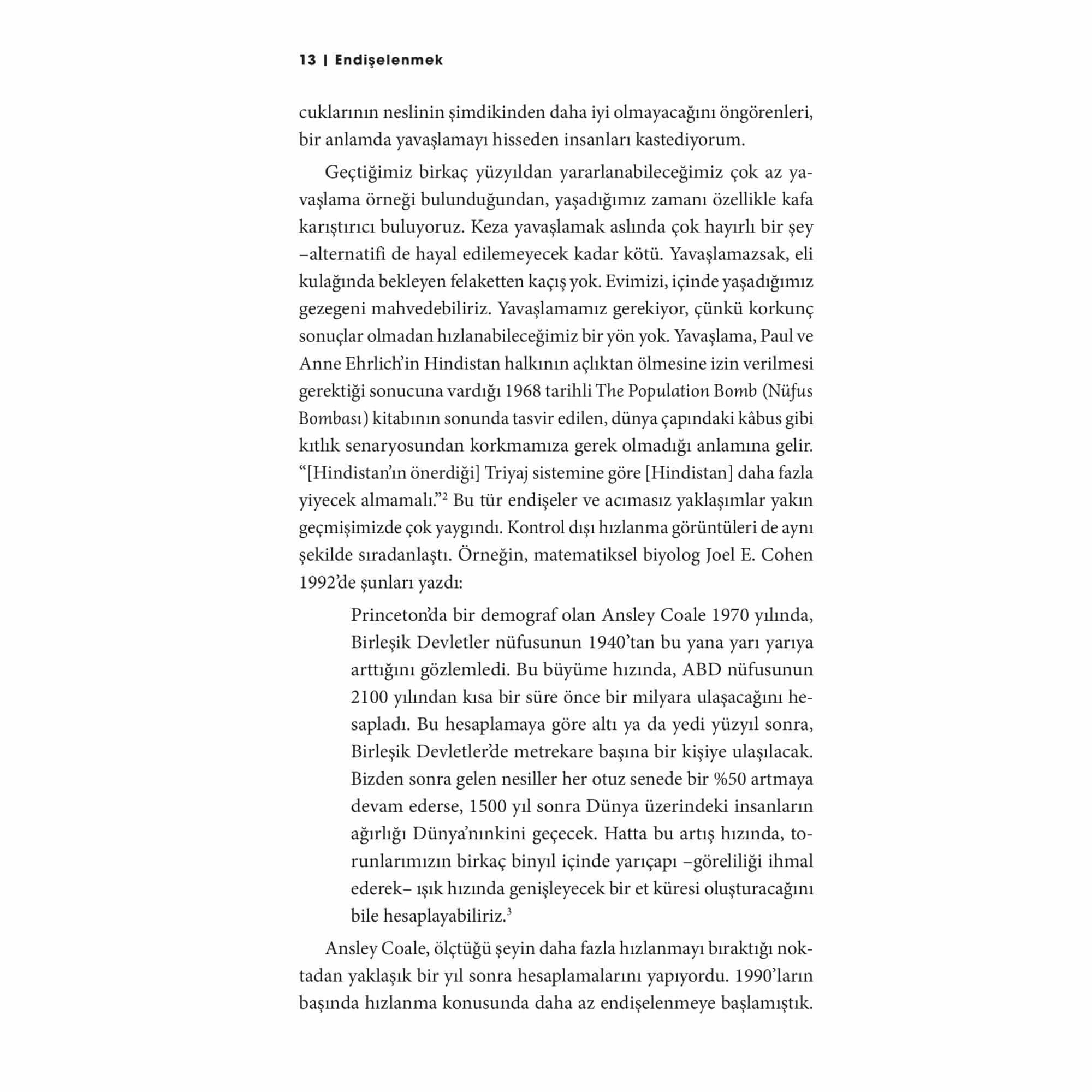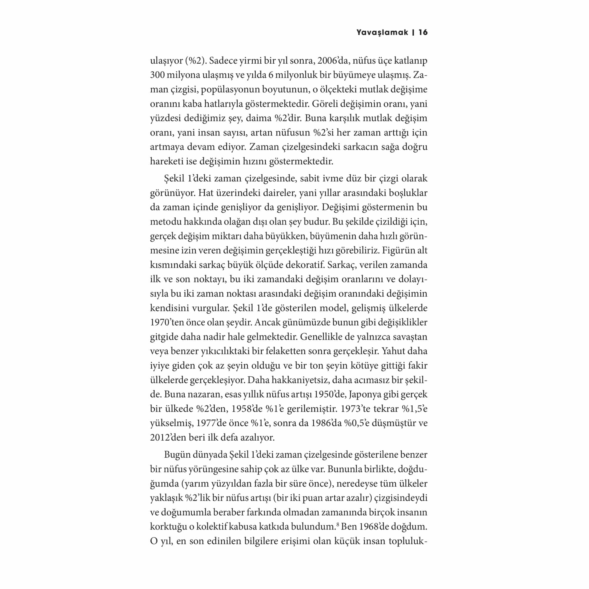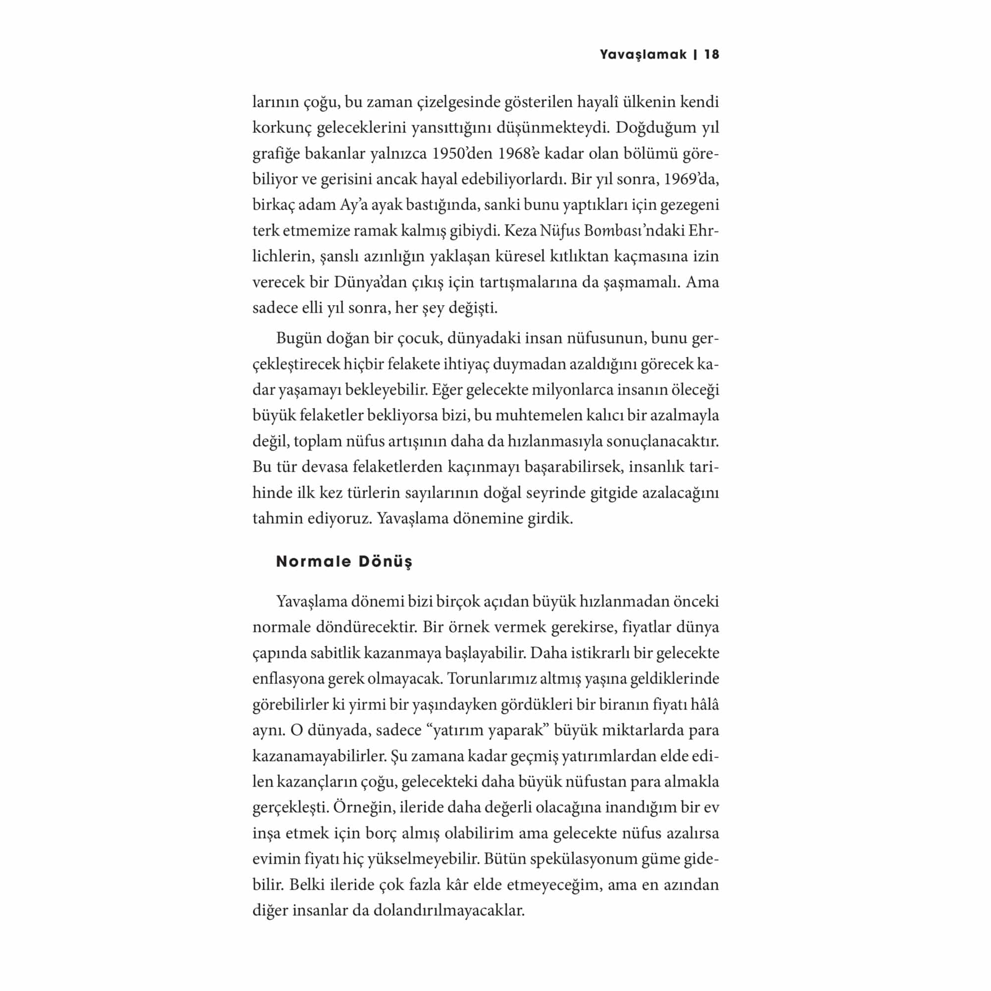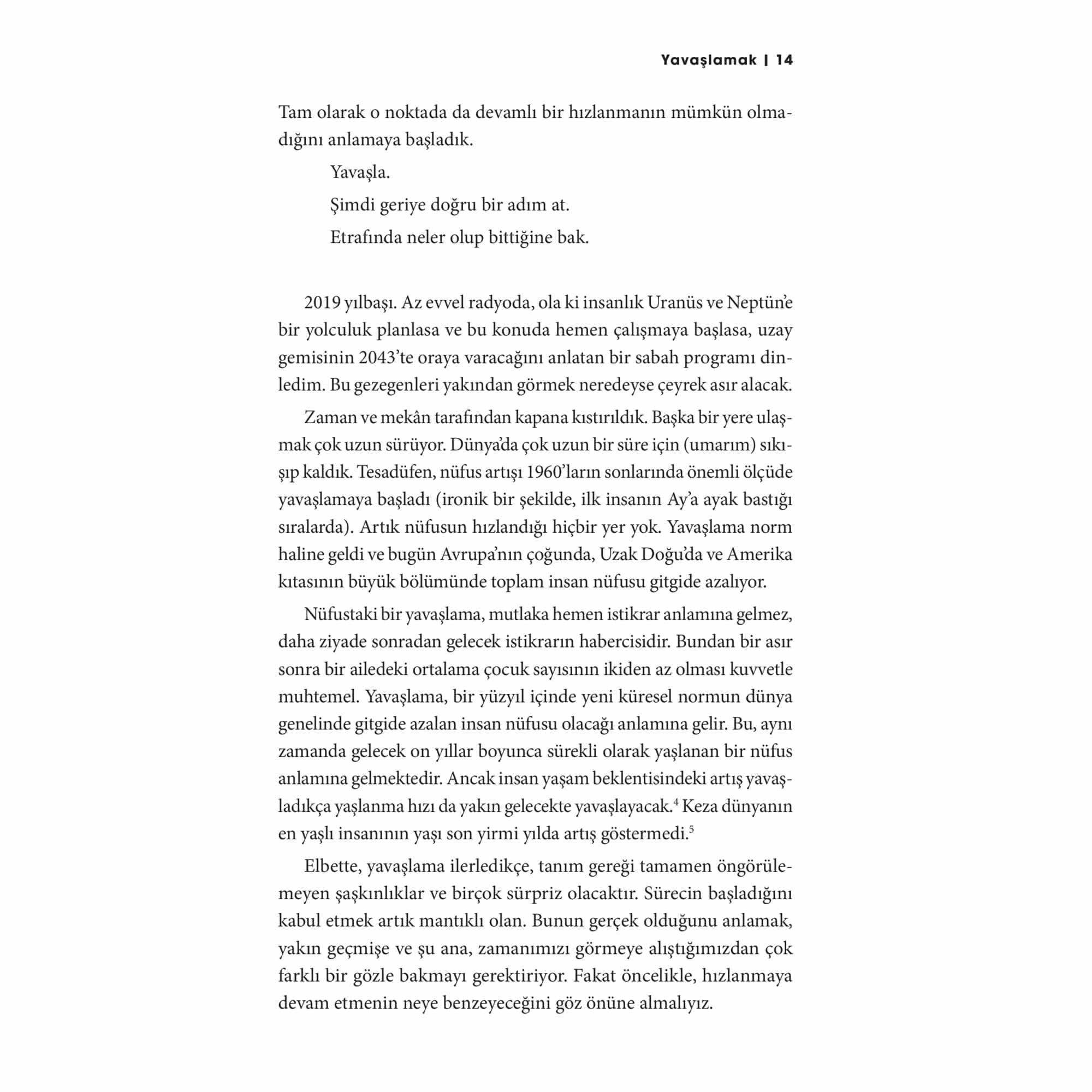 Hızla büyüyen dünyamız, aslında ekonomik krizler ve salgınlardan çok daha önce sonun eşiğine geldi. Uygarlığımızı son sürat ileriye taşıdığına inanılan teknolojik gelişmeler, yaygın kanının aksine gitgide yavaşlıyor. Nüfusumuzun büyüme hızı düşüyor. Gidişata bakıldığında mevcut yavaşlama, hızlanma beklentisine karşı büyük bir meydan okumayı ve bilinmeyene doğru bir adımı temsil ediyor. Fakat bu durum, kulağa korkutucu gelse de, insanlık ve gezegenimiz için bir umut ışığı olabilir. Danny Dorling, farklı disiplinleri bir araya getirdiği Yavaşlamak’ta küresel çapta tecrübe ettiğimiz yavaşlamanın faydalarına dair güncel ve alışılmışın dışında bir argüman ortaya koyuyor. İlk kez 1890’larda kullanılan ve temelde “daha yavaş ilerleme” anlamına gelen bu olguyu iklim, demografi, ekonomi, jeopolitik gibi disiplinler bağlamında inceliyor; analizini doğurganlık oranlarından banka kredileri ve toplumsal hareketlerin sıklığına uzanan bir veri çeşitliliğiyle zenginleştiriyor. Dorling, bu çalışmasıyla “Nasıl bir gelecek tasavvur etmeliyiz?” sorusuna sürdürülebilir bir cevap arıyor. “Çoğumuz, bir ilerleme kültü gözümüzü kör ettiğinden, Dorling’in açıkça ortaya koyduğu yavaşlamanın farkına varamıyoruz. Gerçek bir entelektüel olan Dorling, hayatta kalmayı başarırsak Dünya’nın daha yavaş –ve muhtemelen daha iyi– olacağını gösteriyor.” —Paul Chatterton “Dünya, istikrarlı ve ardından azalan nüfustan oluşan yeni bir ‘’e geçerken yavaşlayan büyüme hızının devasa zorluklarını zekice ortaya koyan Dorling’in iyimserliği bulaşıcı.” —Vicky Pryce “Güçlü, kışkırtıcı ve zamanın ruhuna uygun bir metin. Profesör Dorling, devasa kâr ve sermayeye yönelik özgürlüklerin yanı sıra, gitgide artan iş yoğunluğunun insanları ve gezegeni ayakta tutmaya yetmeyeceğini zekice ortaya koyuyor. Daha güçlü sendikalardan daha yeşil bir ekonomiye, bizi, daha ümitvar ve insancıl bir geleceği seçmenin yolları olduğuna ikna ediyor.” —Frances O’Grady