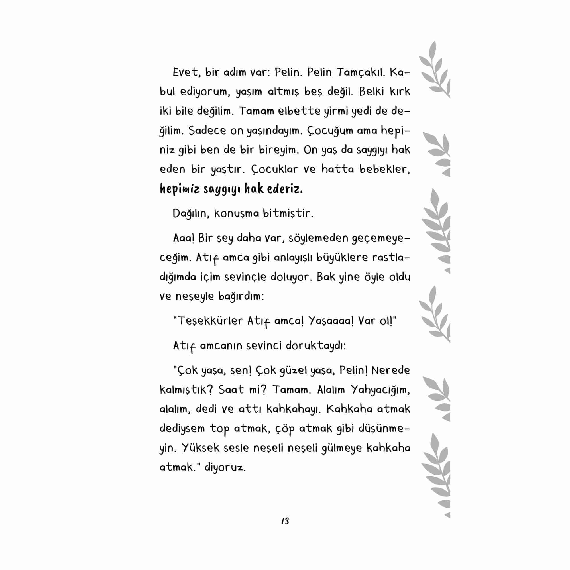 “Bir gece yatağıma yatmıştım. Boş boş tavana bakarken ne kadar sıkıcı bir hayatım olduğunu düşünüyordum. Sonra... Sonra ne oldu dersin? Hiç. Hiçbir şey olmadı. Sonra yine tavana baktım.” Pelin, böyle bir başlangıç yaptı yaşadıklarını anlatırken. Tıpkı birçok insan gibi... Ancak sonrası hiç de öyle “tavana bakmakla” devam etmedi. Çünkü “Her şey gelen bir ayet mesajıyla renklendi.” Çok akıllı bir saat, ilginç bir aile, pandemi, okula dönüş ve tabii ki Pelin… Bütün gizemiyle bizi bekliyor.