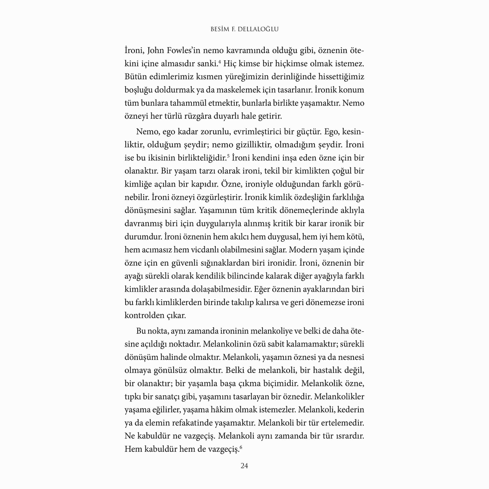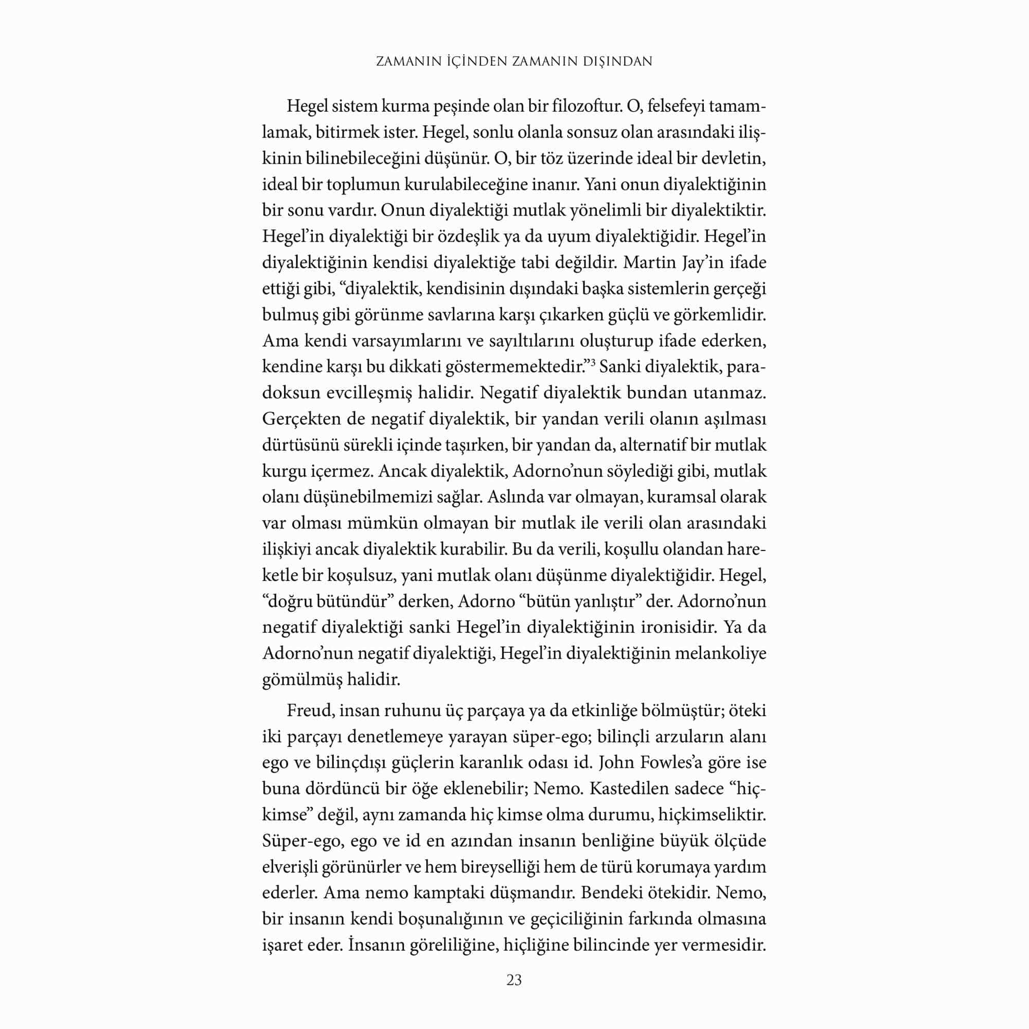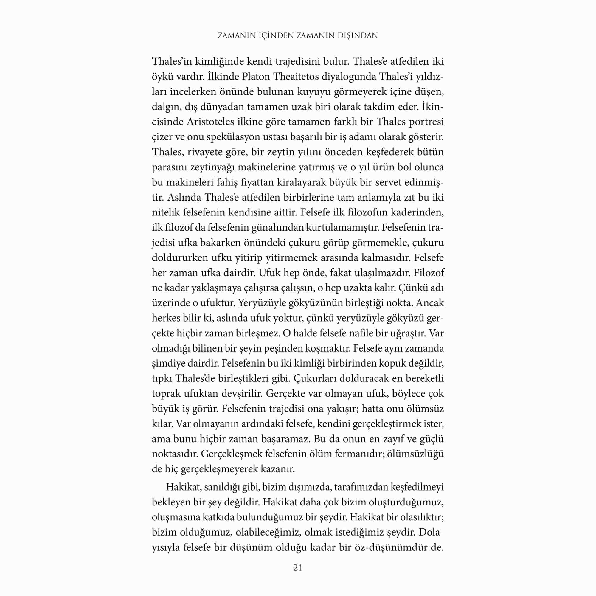 Vicdan bendeki ötekidir. Hatta tüm ötekilerdir. Ben'in tüm ötekileri içinde hissetmesidir. Vicdanın olmadığı yerde her şey artık bir kuru gürültüdür. [...] Hakikat duygusu, bizim ideolojimiz dışında birinin söylediği bir cümlede hakikate dair bir şey varsa eğer onun hakkını teslim etmemizi sağlayan şeydir Besim F. Dellaloğlu Zamanın İçinden Zamanın Dışından: Gelenek ve Modernlik Arasında’da bir sosyolog olarak gündelik kavramlar üzerinden bir Türkiye panoraması çıkarıyor. İdeolojik mahallelerin hangi kelimeler ve kavramlar üzerinden meseleleri nasıl yanlı/ş yorumladıklarını örnekleriyle anlatıyor, iç içe geçmiş kavramların röntgenini çekiyor. Modernlik, çağdaşlık, gelenekselcilik, ilericilik, laiklik, muhafazakârlık, felsefe, sanat gibi gerçek anlamını pek merak etmediğimiz fakat kullanmayı çok sevdiğimiz “şık” kavramları nasıl ve neden sadece şeklen benimsediğimizi okurla birlikte çözmeye çalışıyor, medeniyet üretemememizi sorguluyor. Zamanın İçinden Zamanın Dışından: Gelenek ve Modernlik Arasında, “okuryazar”ların zihin masasında yer bulması elzem bir yol haritası.