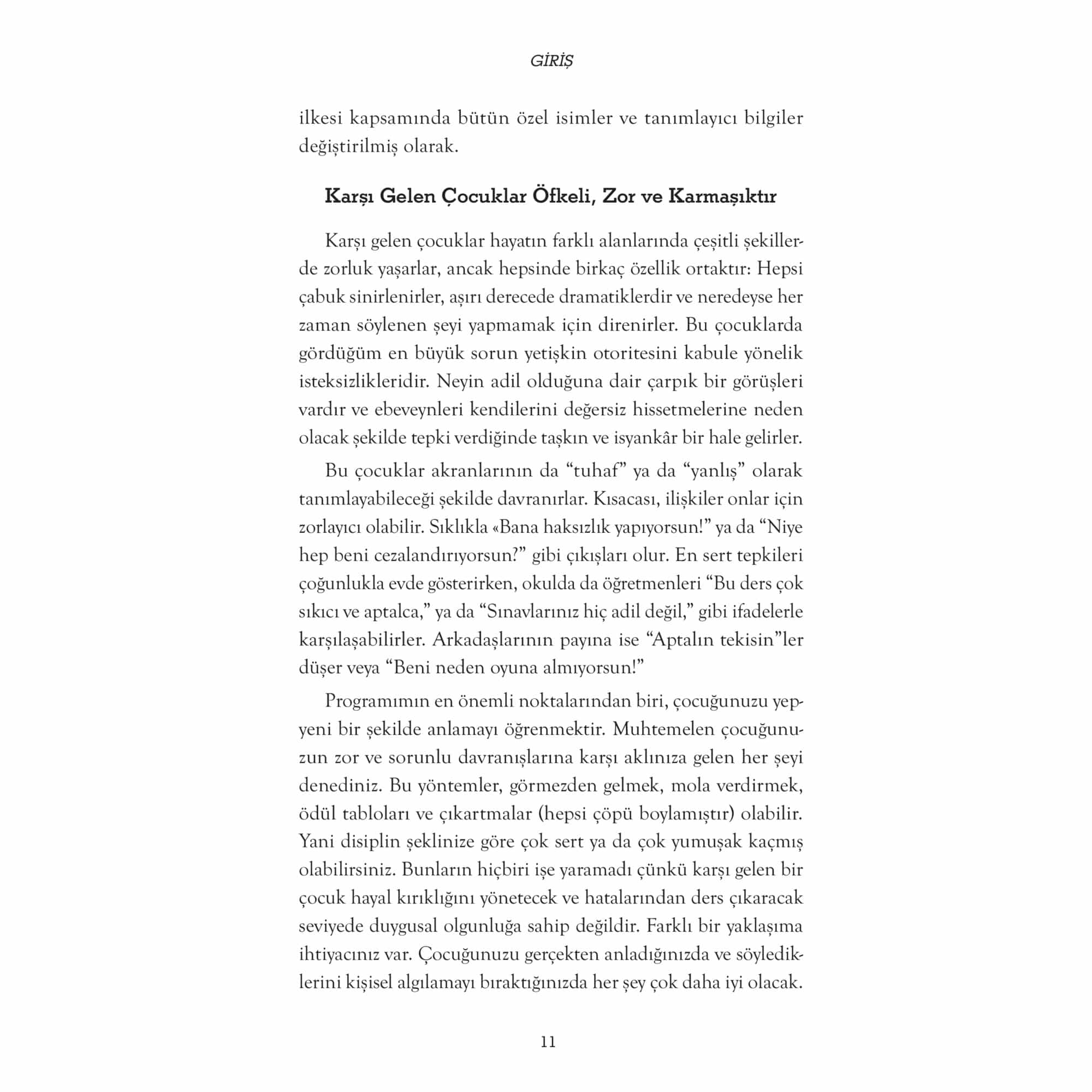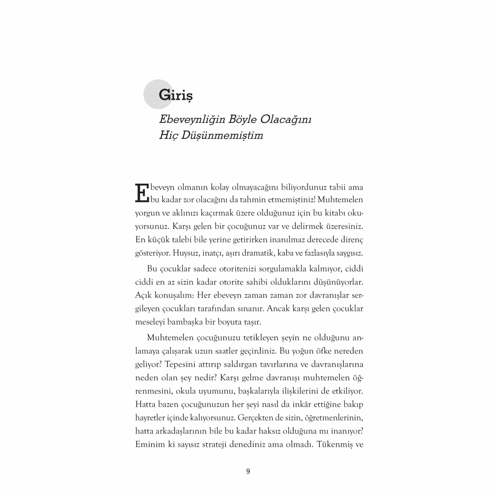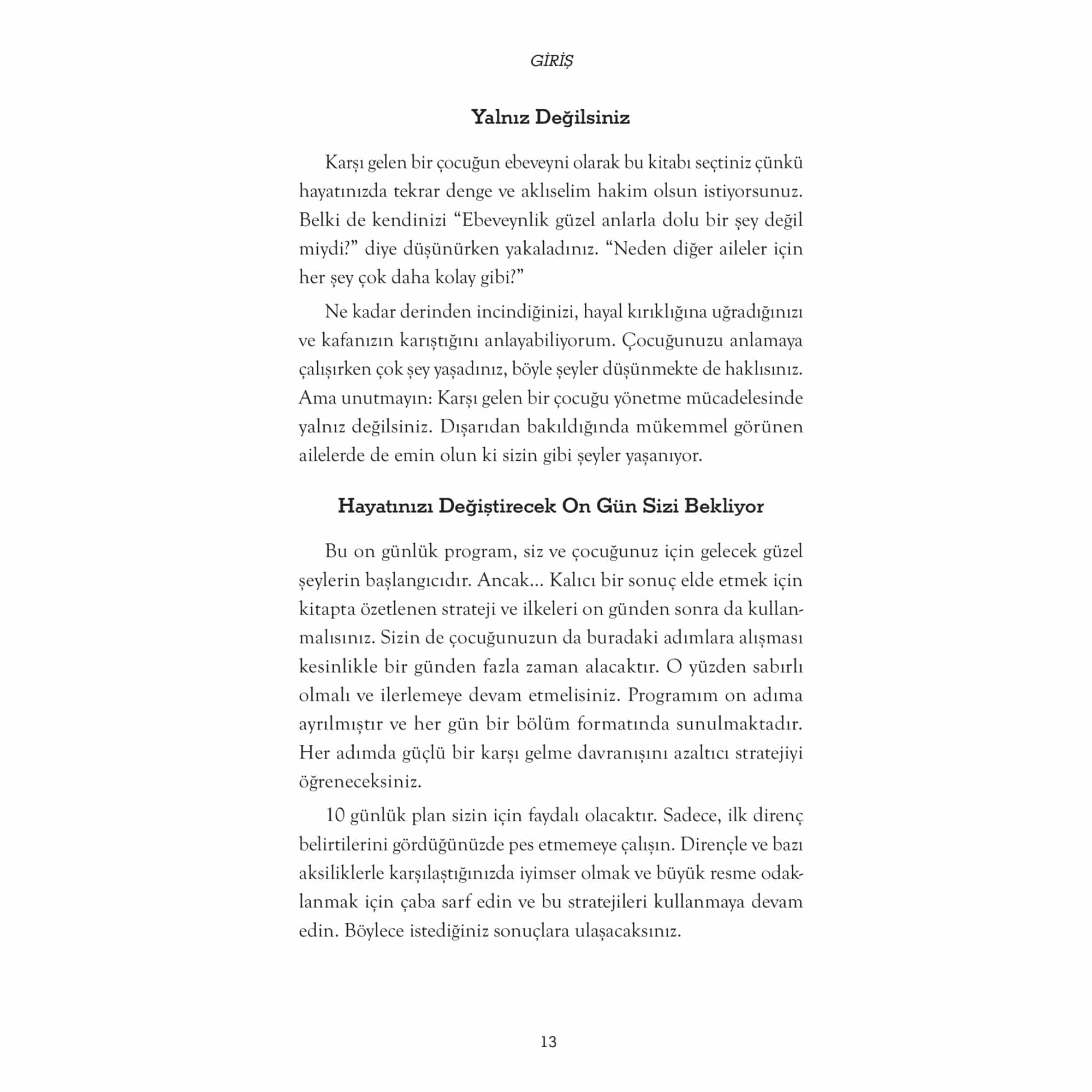Ebeveynliğin böyle olacağını hiç düşünmemiştiniz. Kolay olmayacağını biliyordunuz tabii ama bu kadar zor olacağını da tahmin etmemiştiniz. En küçük talebinize bile itiraz ediyor; yemek yemeye, yatma saatine, aile içinde geçerli kurallara, ödev yapmaya, bilgisayar oyununu bırakmaya direniyor. Onu bu kadar çabuk öfkelendiren şeyin ne olduğunu, nasıl bu kadar çabuk tetiklendiğini anlamaya çalışmaktan yorgun; evdeki çatışmalar karşısında bunalmış hissediyorsanız önce derin bir nefes alın ve bu kitaba bir bakın! Dr. Jeffry Bernstein, yirmi beş yılını karşı gelen çocuklar ve aileleriyle geçiren, üç binden fazla aileye bu konuda rehberlik eden bir uzman olarak size ışığın hiç de uzakta olmadığını gösteriyor. Hazırladığı “10 Günlük Program” ile evdeki çatışmaları adım adım ilerleyerek nasıl çözeceğinizi, çocuğunuzun inatçı ve karşı gelen tavrını birlikte nasıl değiştirebileceğinizi açıklıyor. Birbirini takip eden 10 adımla her gün biraz daha iyiye gittikçe bu programa duyduğunuz güveni pekiştirecek; sakin, kararlı ama kontrolcü olmayan bir ebeveynlik tutumu geliştirerek evinizde bambaşka hava estireceksiniz. “Bu kitabı okuma kararı aldığınız için sizi alkışlıyorum. Sayfalar ilerledikçe kitabın çocuğunuzun karşı gelme seviyesini ciddi oranda azaltacak bir sürü güçlü strateji yüklü olduğunu fark edecek ve bunları uygulayıp çocuğunuzla ilişkinizi geliştirdikçe işlerin nasıl yoluna girdiğini göreceksiniz. Kendi davranışlarınızı değerlendirmeniz ve çocuğunuza daha yapıcı bir şekilde yaklaşmanız için size birtakım tüyolar ve egzersizler de vereceğim. Danışanlarımın çoğu bu hedeflere nasıl ulaştıysa sizin de ulaşabileceğinizi biliyorum.”