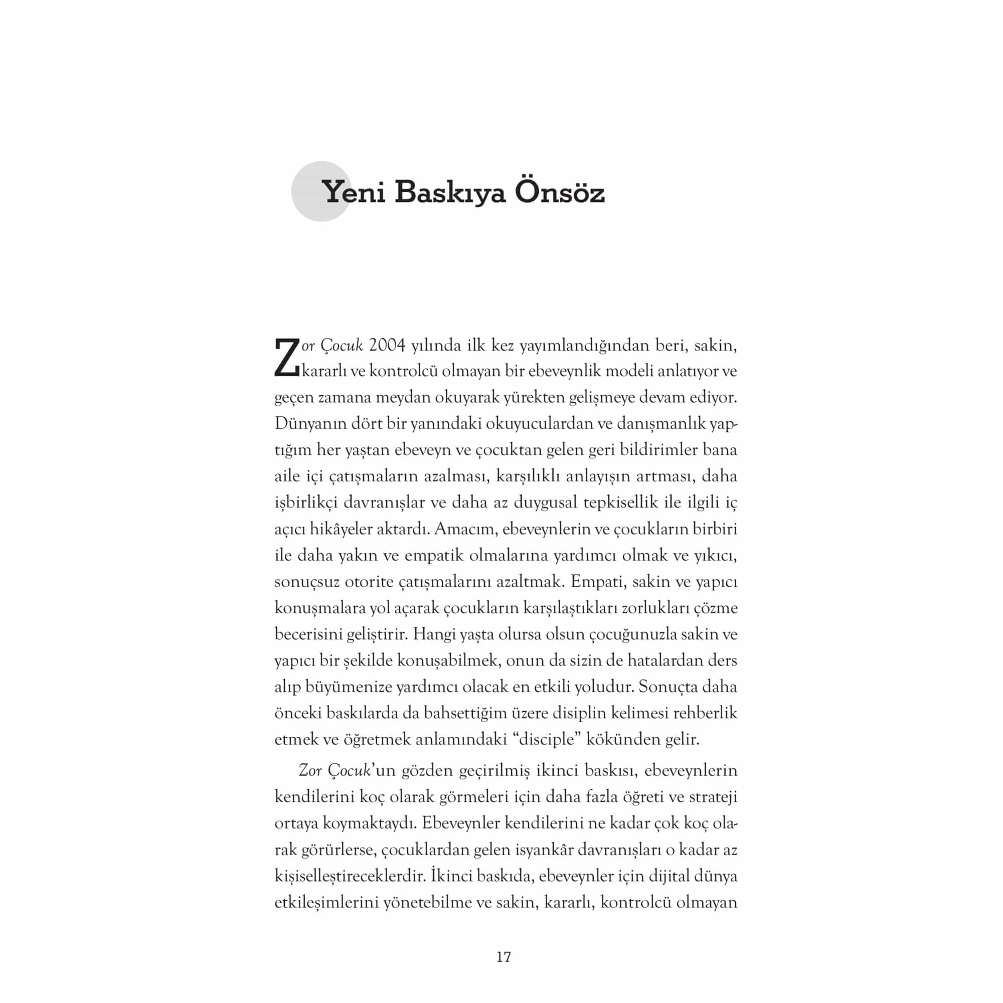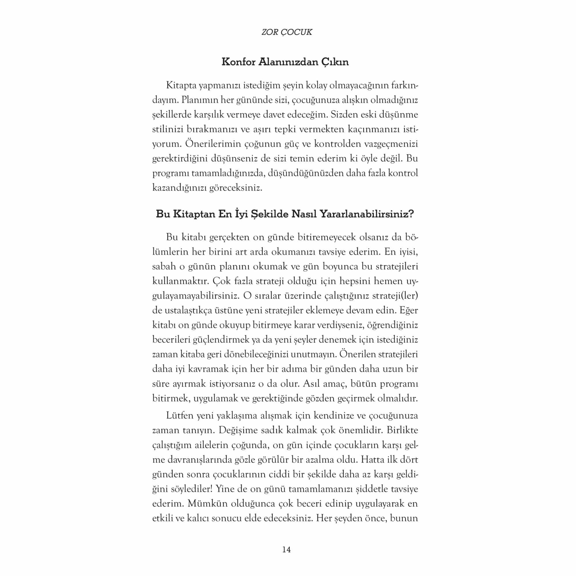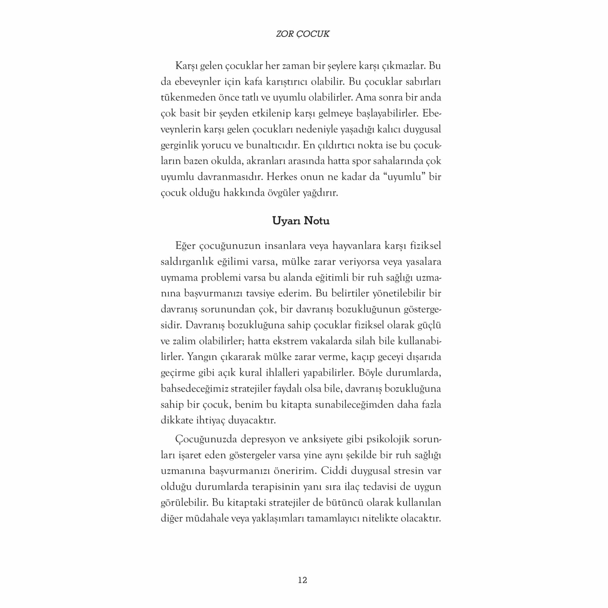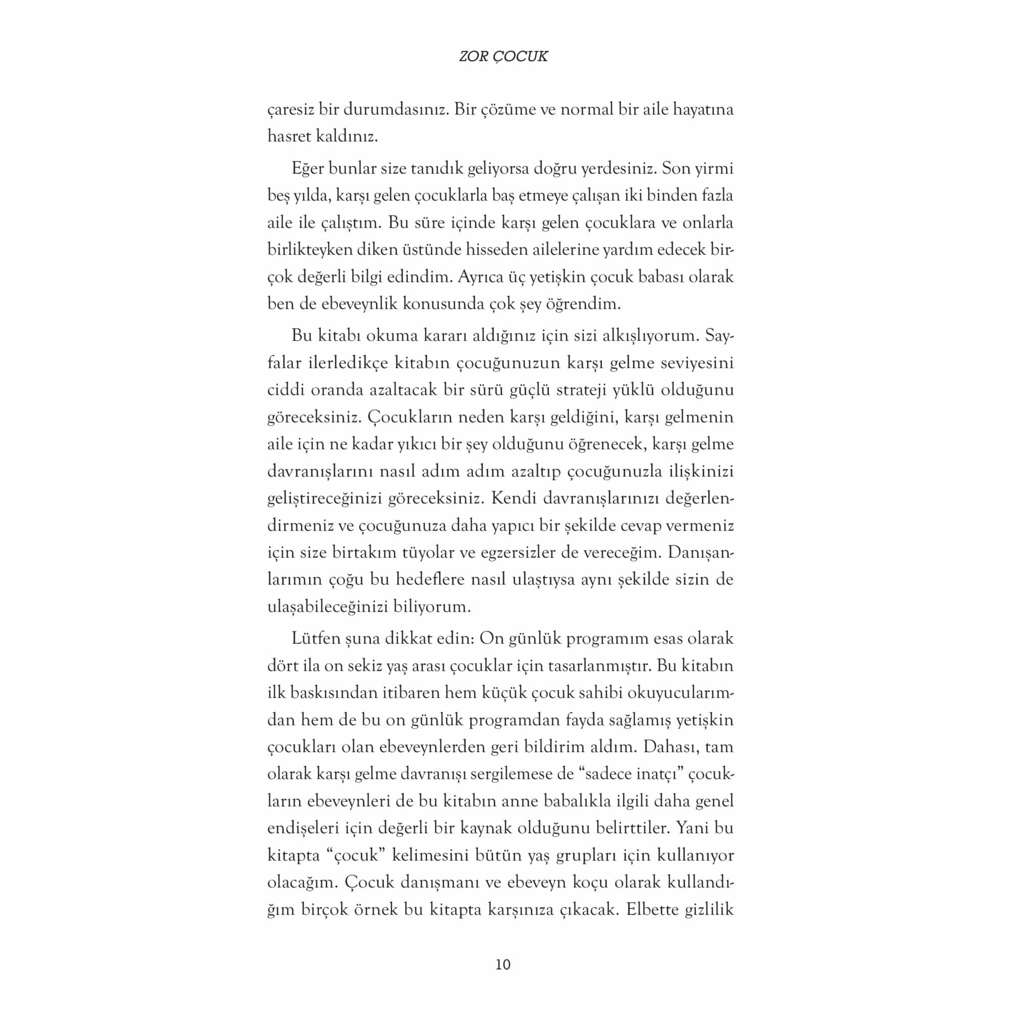 Ebeveynliğin böyle olacağını hiç düşünmemiştiniz. Kolay olmayacağını biliyordunuz tabii ama bu kadar zor olacağını da tahmin etmemiştiniz. En küçük talebinize bile itiraz ediyor; yemek yemeye, yatma saatine, aile içinde geçerli kurallara, ödev yapmaya, bilgisayar oyununu bırakmaya direniyor. Onu bu kadar çabuk öfkelendiren şeyin ne olduğunu, nasıl bu kadar çabuk tetiklendiğini anlamaya çalışmaktan yorgun; evdeki çatışmalar karşısında bunalmış hissediyorsanız önce derin bir nefes alın ve bu kitaba bir bakın! Dr. Jeffry Bernstein, yirmi beş yılını karşı gelen çocuklar ve aileleriyle geçiren, üç binden fazla aileye bu konuda rehberlik eden bir uzman olarak size ışığın hiç de uzakta olmadığını gösteriyor. Hazırladığı “10 Günlük Program” ile evdeki çatışmaları adım adım ilerleyerek nasıl çözeceğinizi, çocuğunuzun inatçı ve karşı gelen tavrını birlikte nasıl değiştirebileceğinizi açıklıyor. Birbirini takip eden 10 adımla her gün biraz daha iyiye gittikçe bu programa duyduğunuz güveni pekiştirecek; sakin, kararlı ama kontrolcü olmayan bir ebeveynlik tutumu geliştirerek evinizde bambaşka hava estireceksiniz. “Bu kitabı okuma kararı aldığınız için sizi alkışlıyorum. Sayfalar ilerledikçe kitabın çocuğunuzun karşı gelme seviyesini ciddi oranda azaltacak bir sürü güçlü strateji yüklü olduğunu fark edecek ve bunları uygulayıp çocuğunuzla ilişkinizi geliştirdikçe işlerin nasıl yoluna girdiğini göreceksiniz. Kendi davranışlarınızı değerlendirmeniz ve çocuğunuza daha yapıcı bir şekilde yaklaşmanız için size birtakım tüyolar ve egzersizler de vereceğim. Danışanlarımın çoğu bu hedeflere nasıl ulaştıysa sizin de ulaşabileceğinizi biliyorum.”