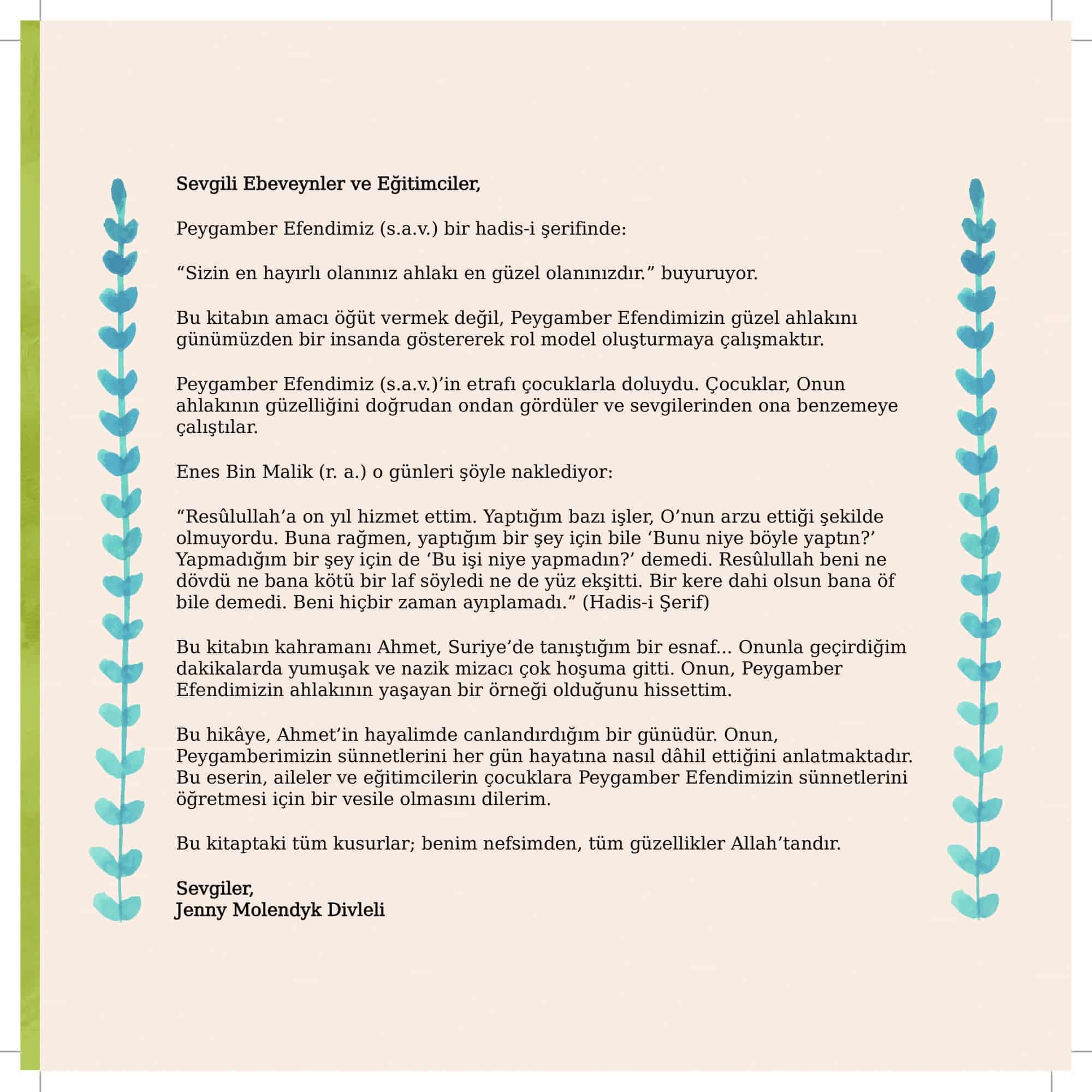 Bir gün başlıyor Ahmet’in evinde, tıpkı bizim evimizde başladığı gibi. Günün sürprizleri, heyecanları, kolaylık ve zorlukları onu bekliyor. O, sadece bir bardak portakal suyuyla çıkmayacak karşımıza. Çok sevdiği Peygamberimizin (s. a. v.) örnek davranışlarını da bizlere aktaracak. O'nun gibi gülümsemeyi, O'nun gibi çalışmayı, O'nun gibi [...]